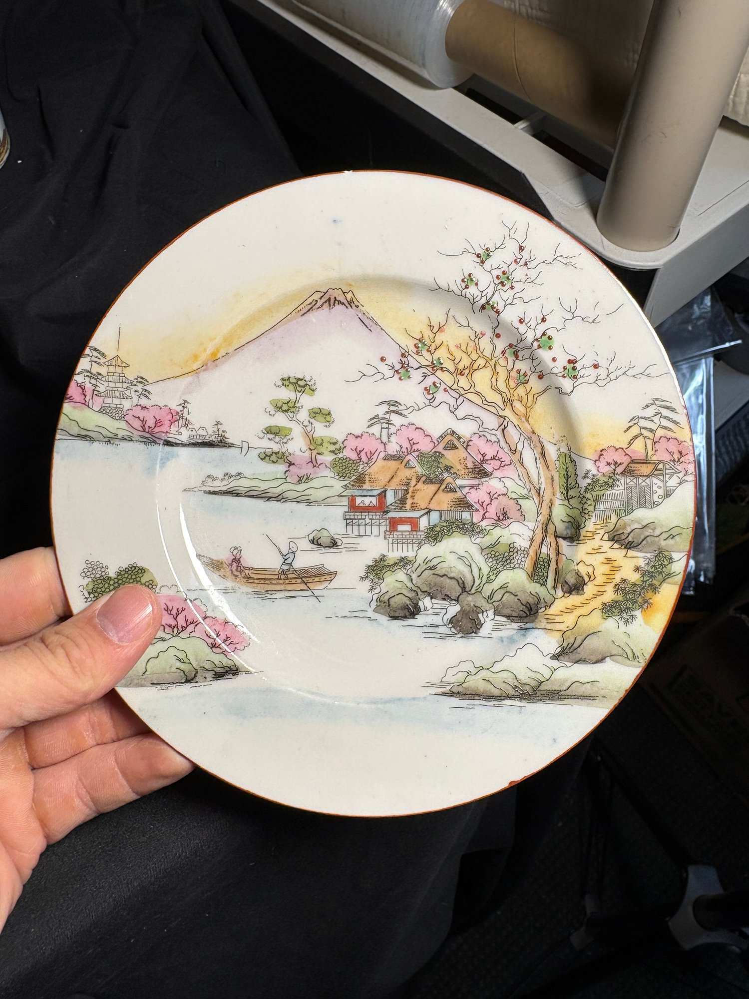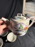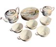 Dimensions diameter of plates approximately 7.25. Height of tea cups and tea pots range from approximately 1.75 to 3.75 inches tall