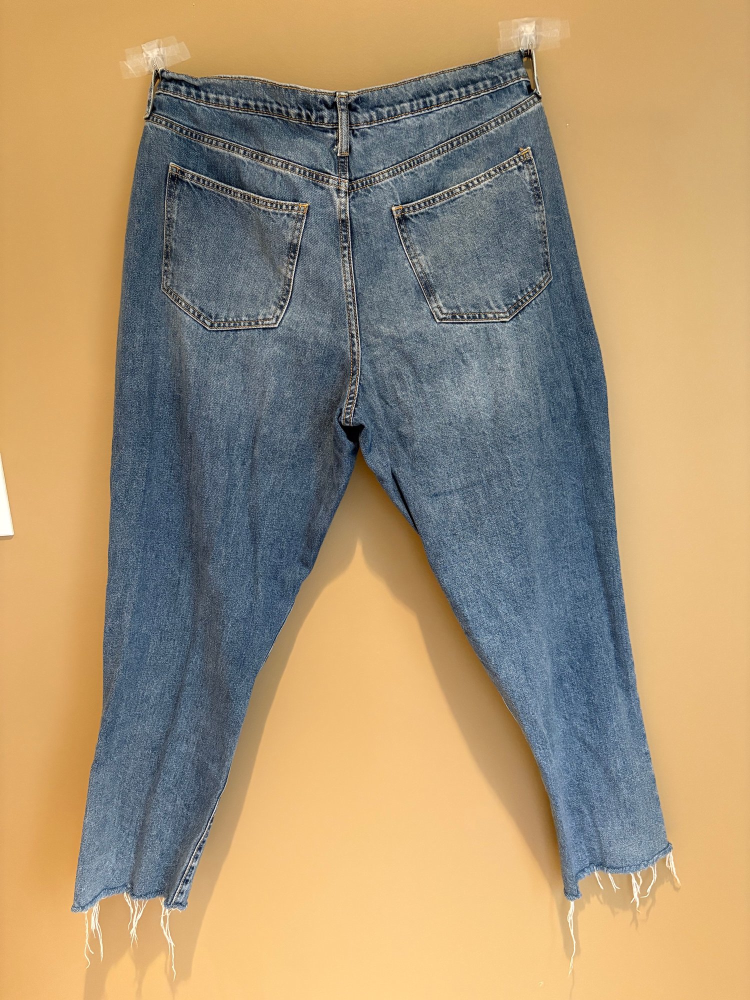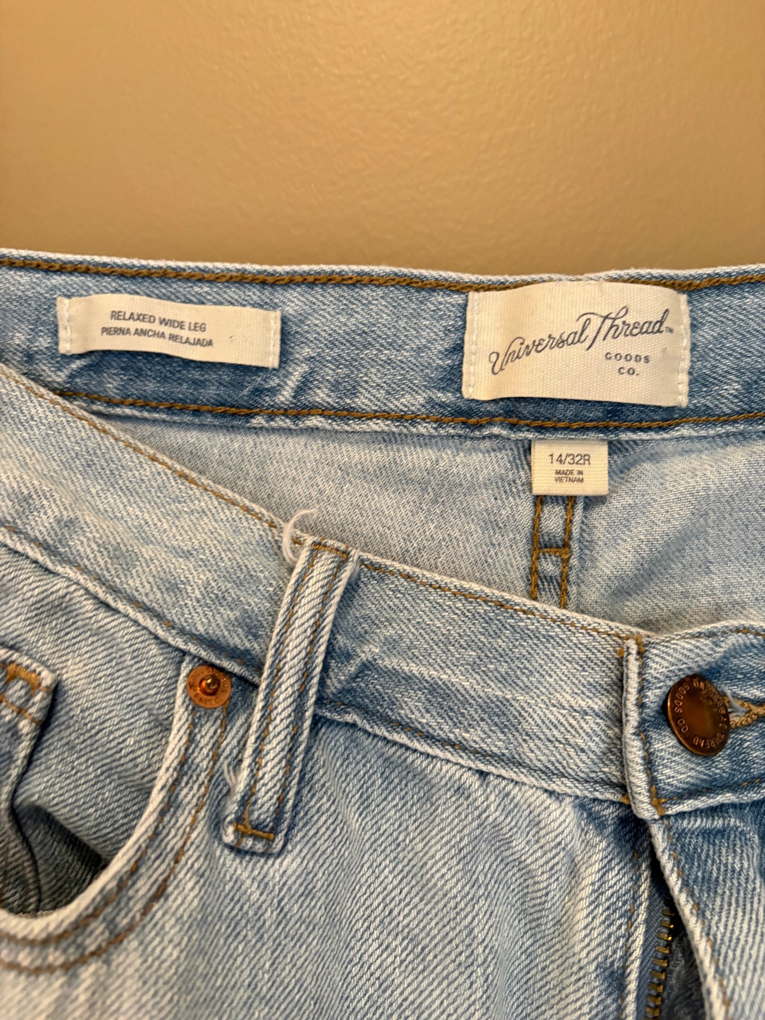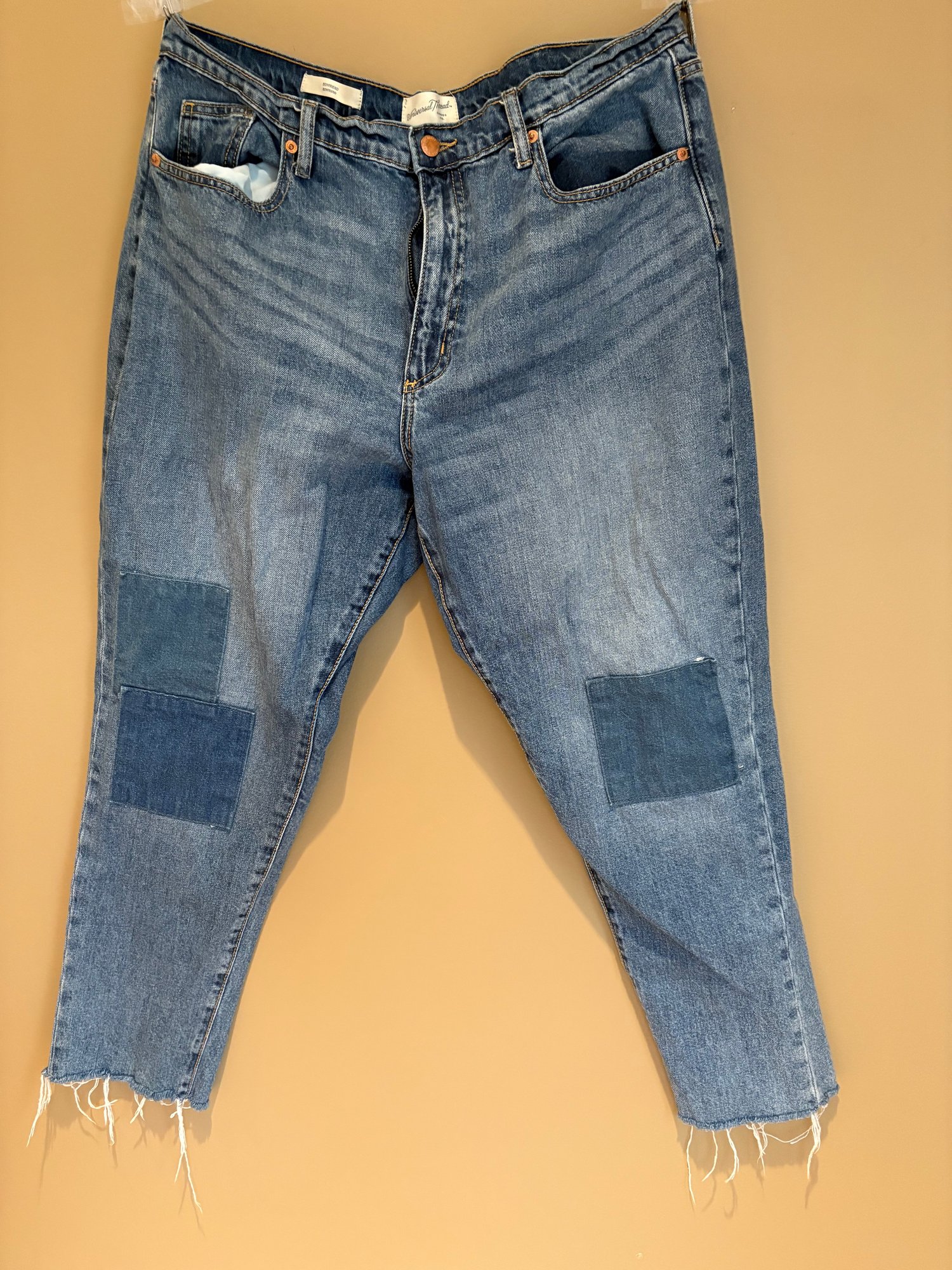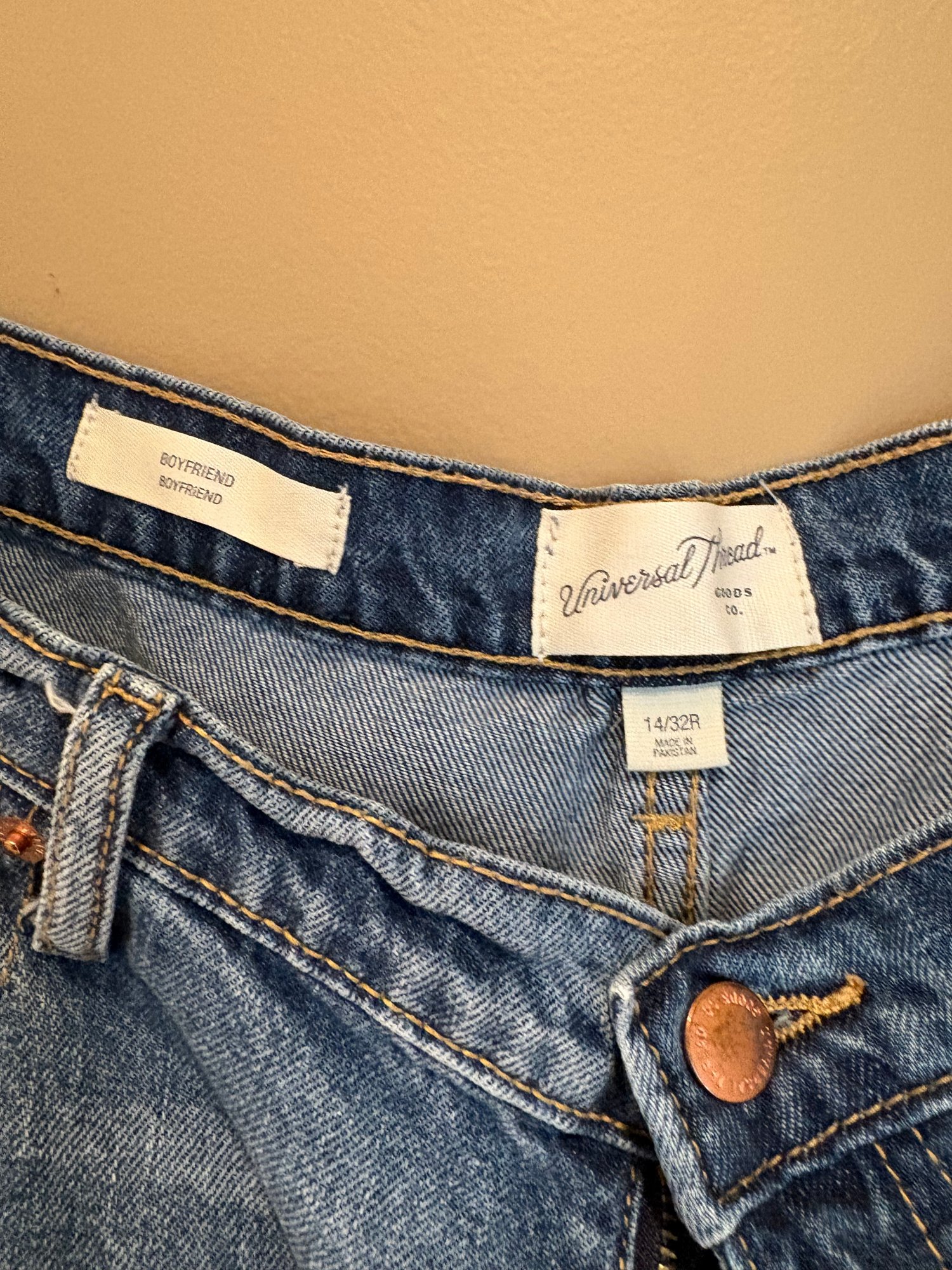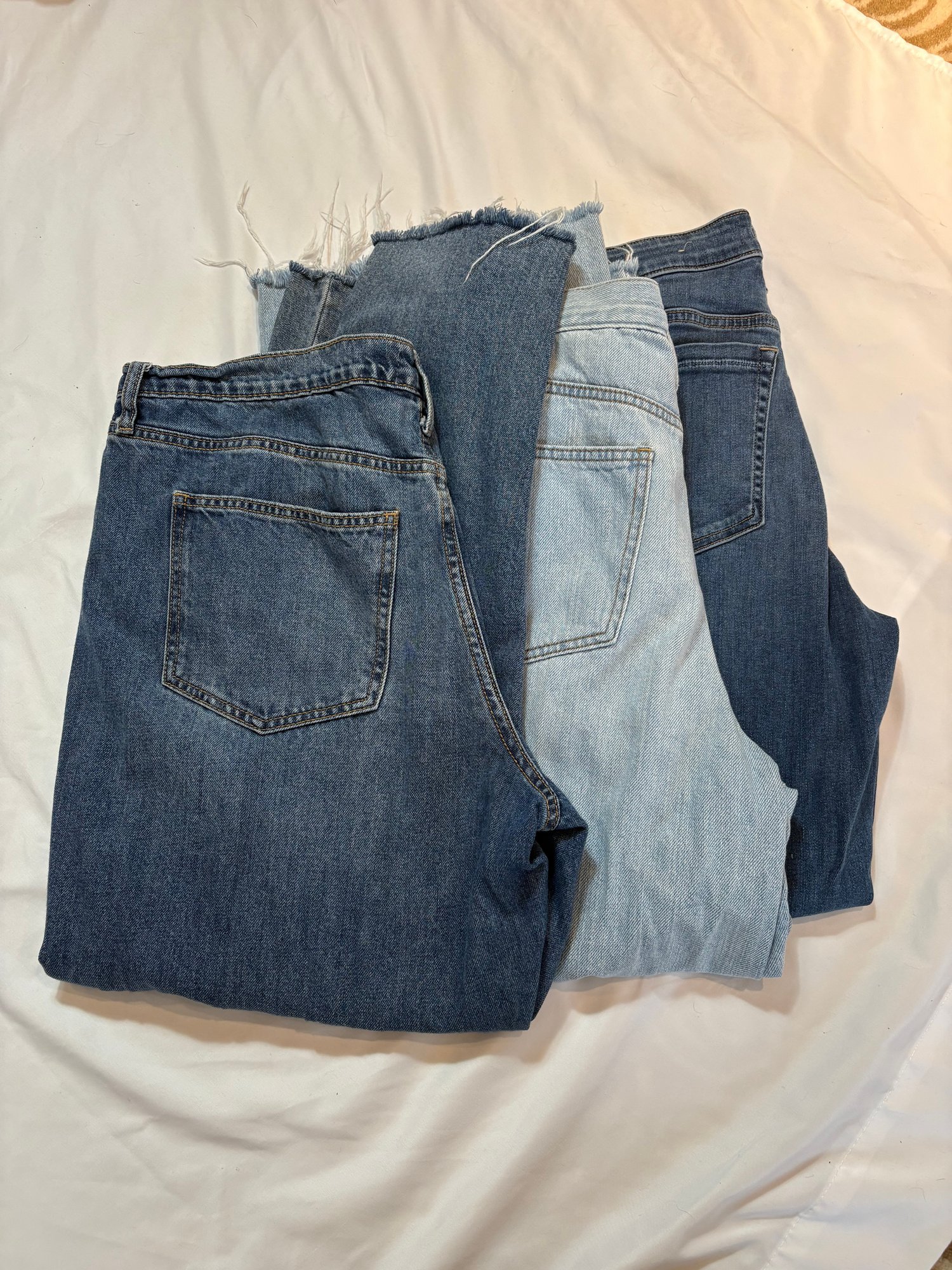 Boyfriend, universal thread 14 r frying on the bottom pockets on the legs. The second is Universal thread 14 are relaxed leg wide leg with frying on the bottom. The third one is rev town also 1432 skinny leg.