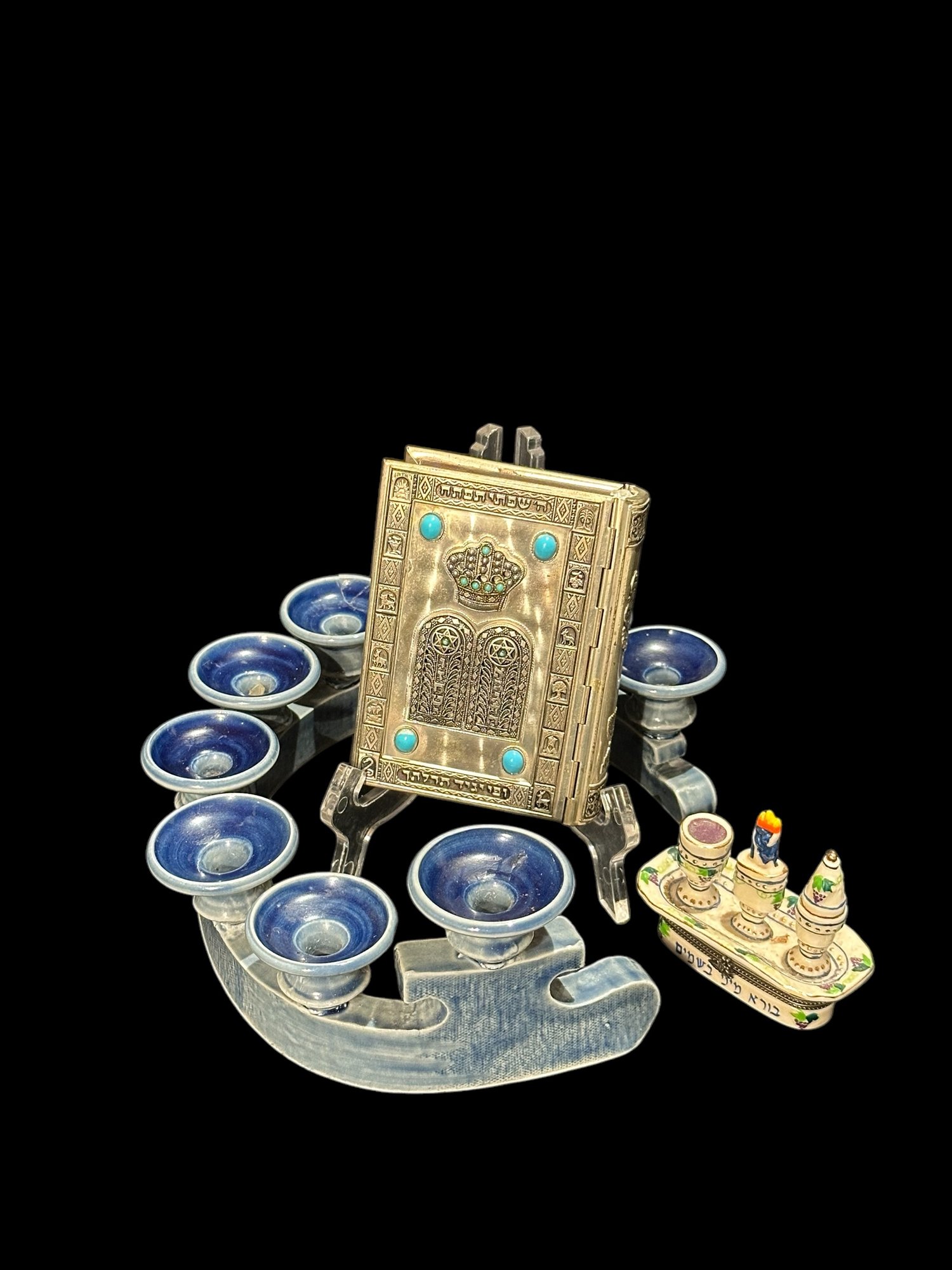 Prayerbook is 3.5“ x 5“ x 1“ wide the blue pottery menorah is 20 inches