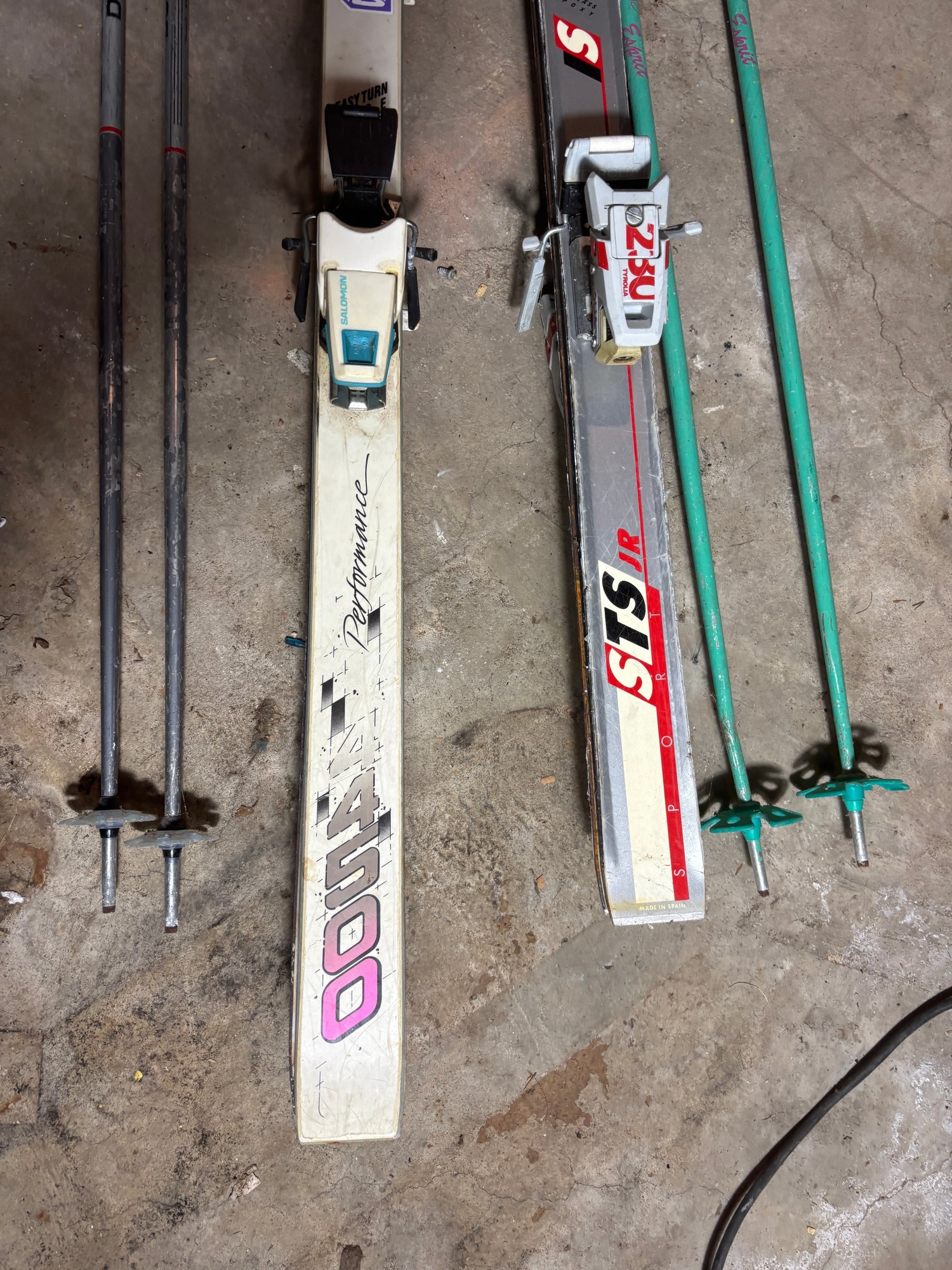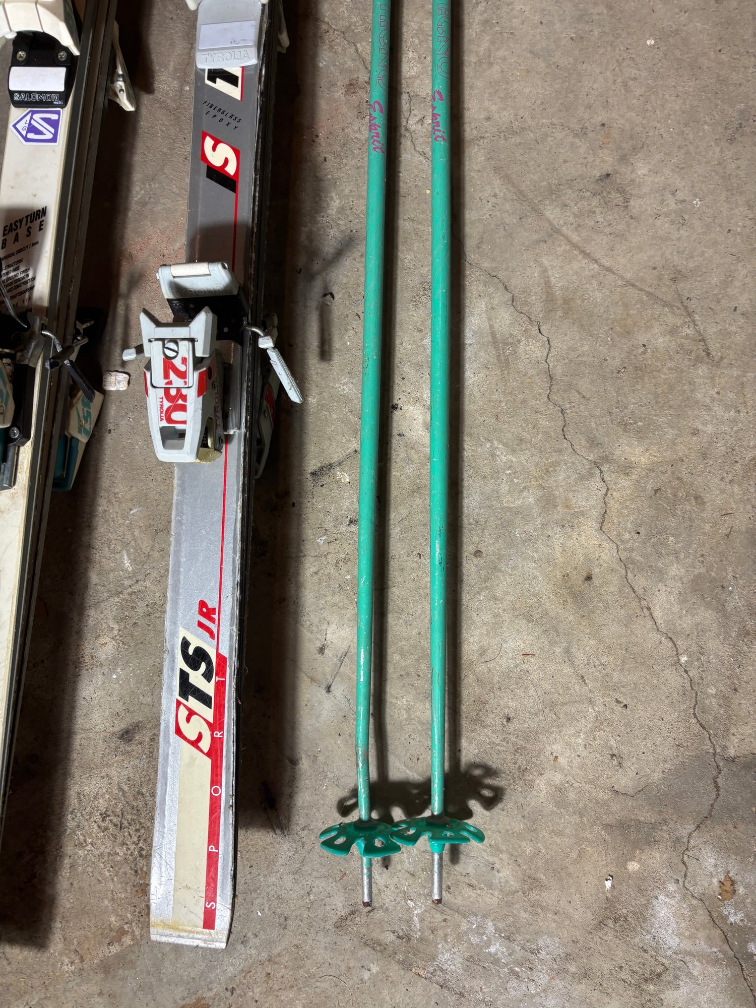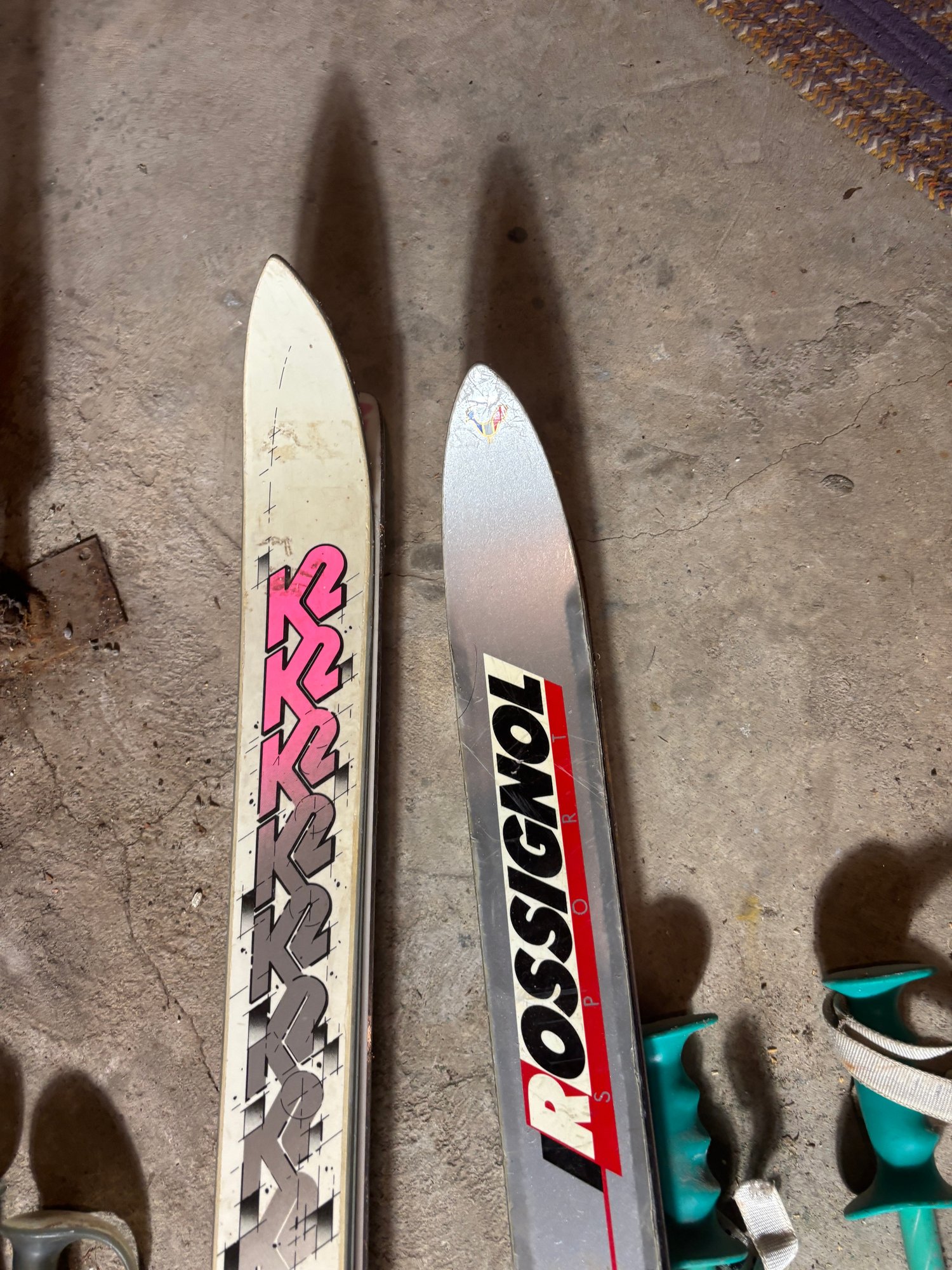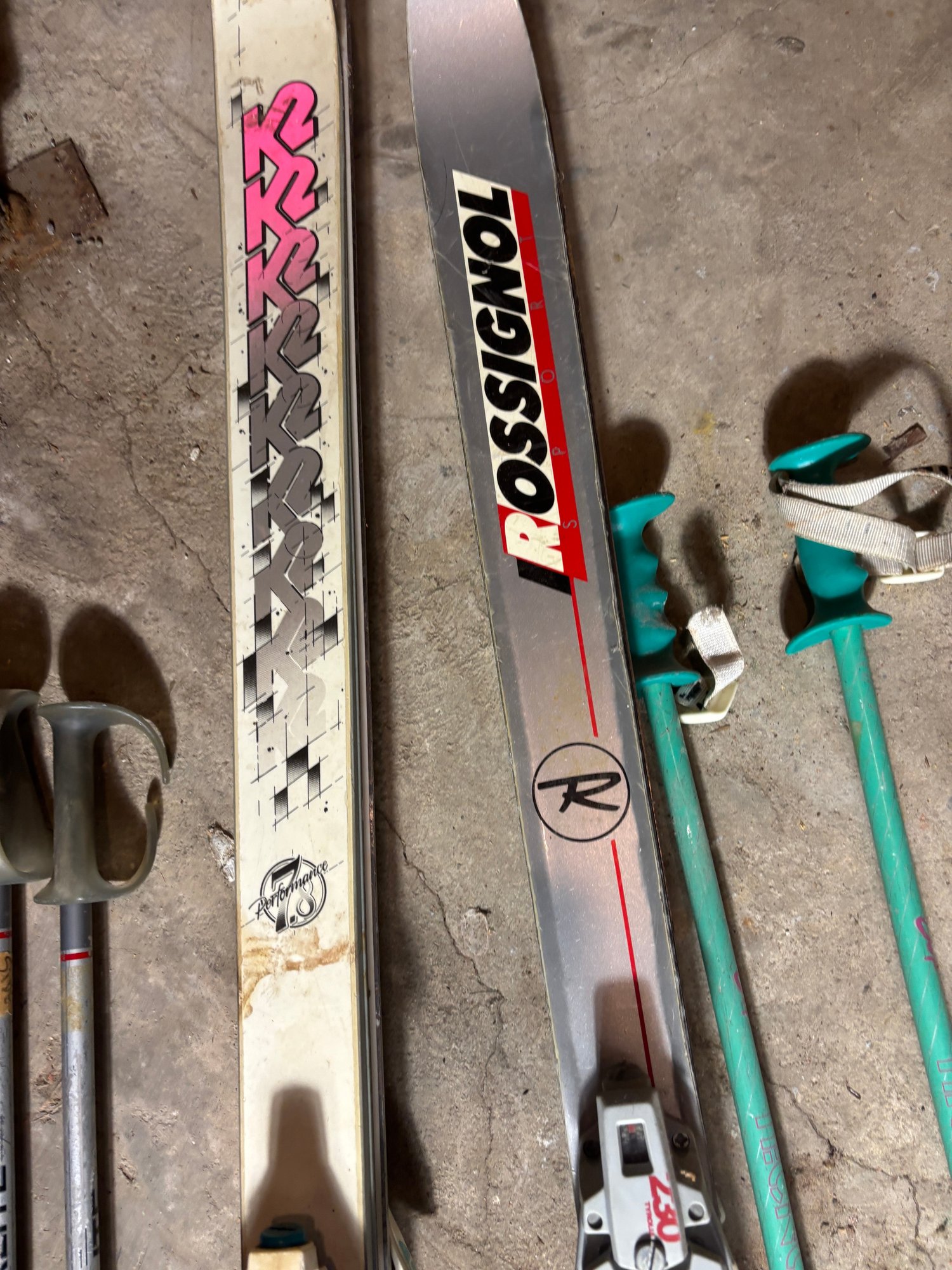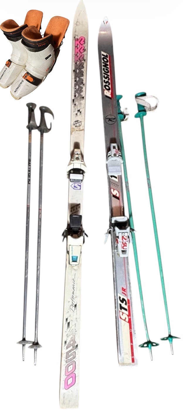 Includes a pair of K2 44500 skis, rossignol STSjr skis, duralite poles, tecno esprit poles, Salomon ski boots.