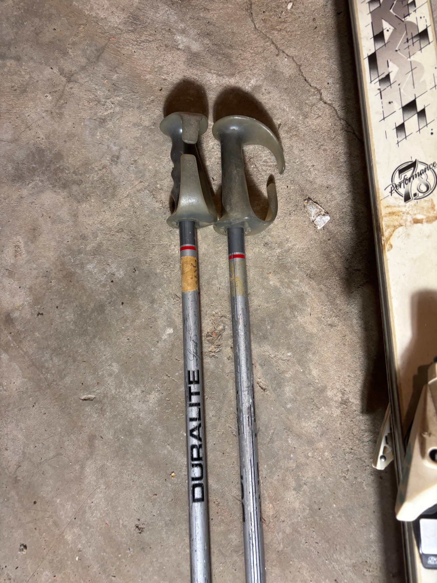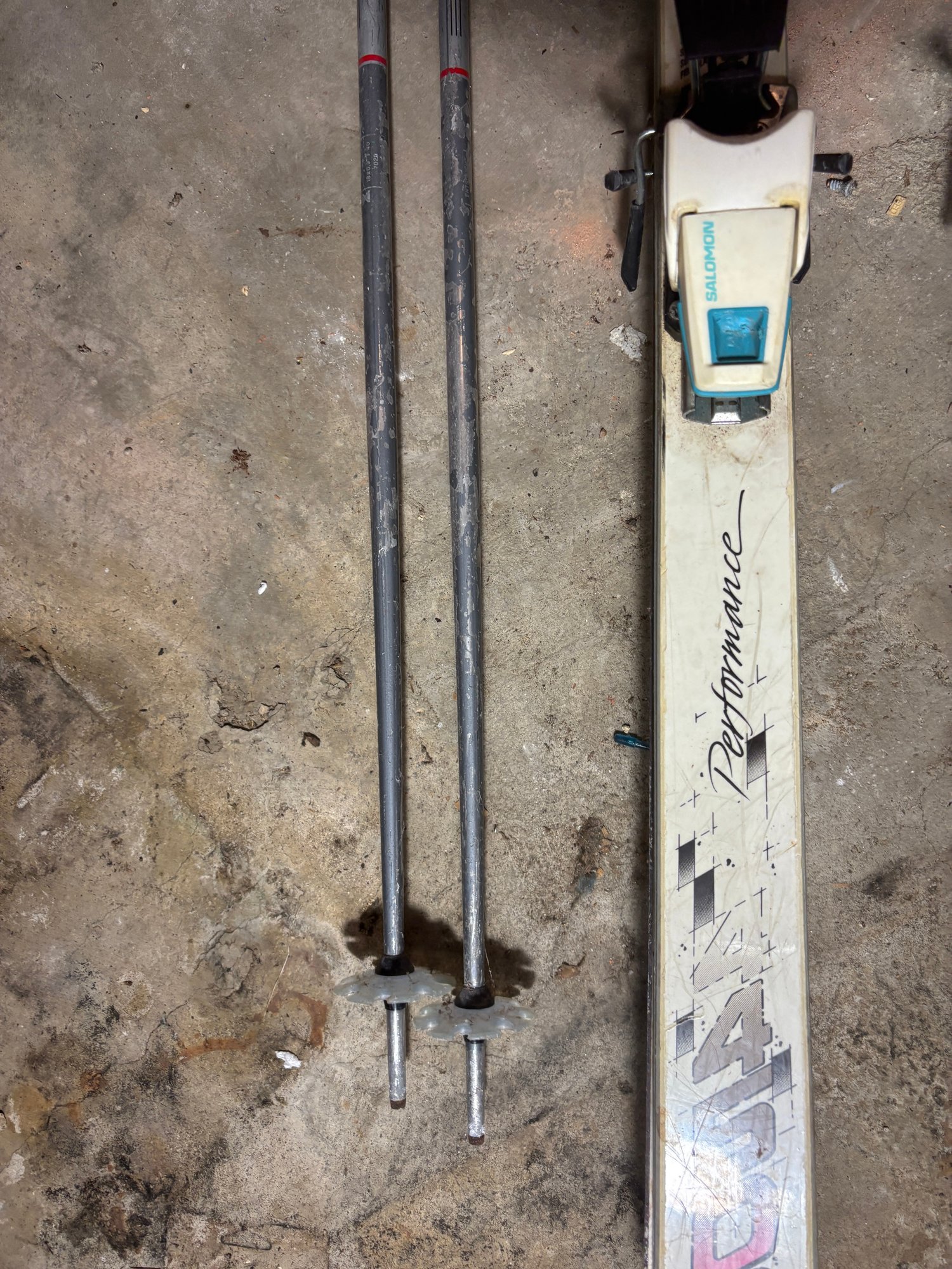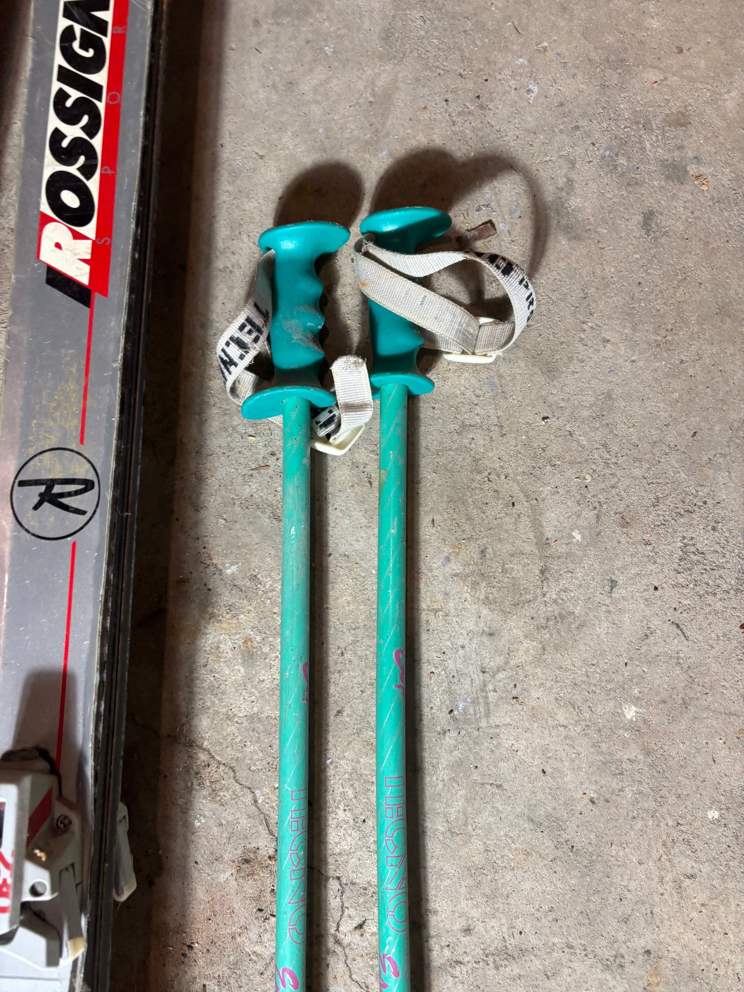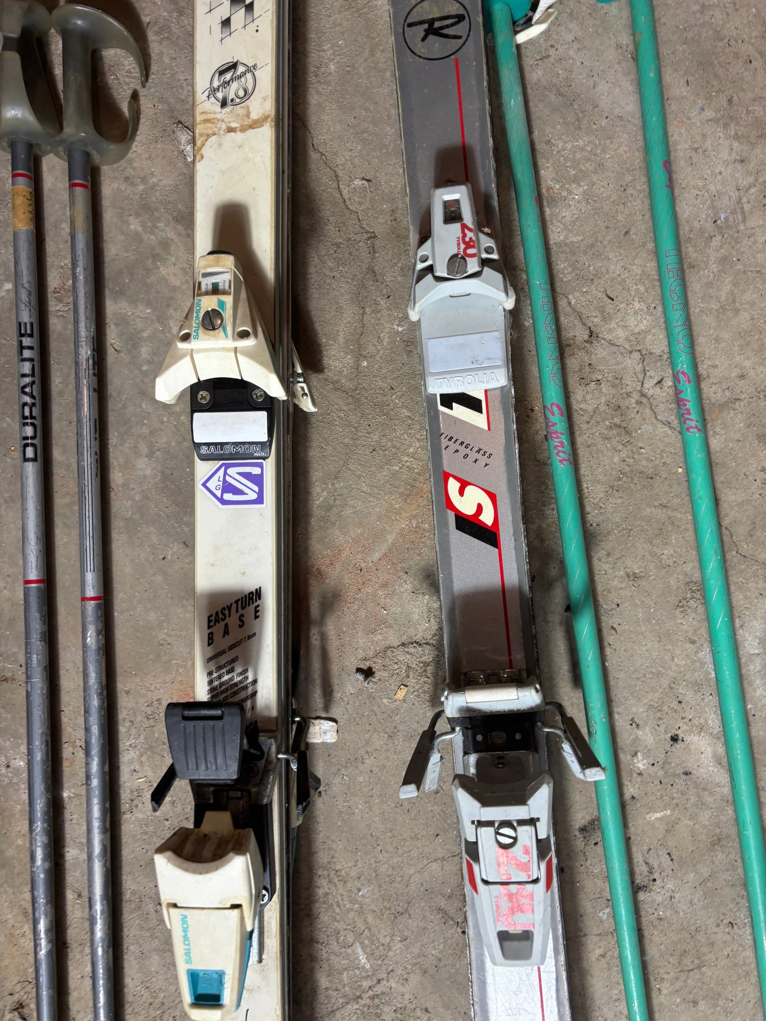 Includes a pair of K2 44500 skis, rossignol STSjr skis, duralite poles, tecno esprit poles, Salomon ski boots.