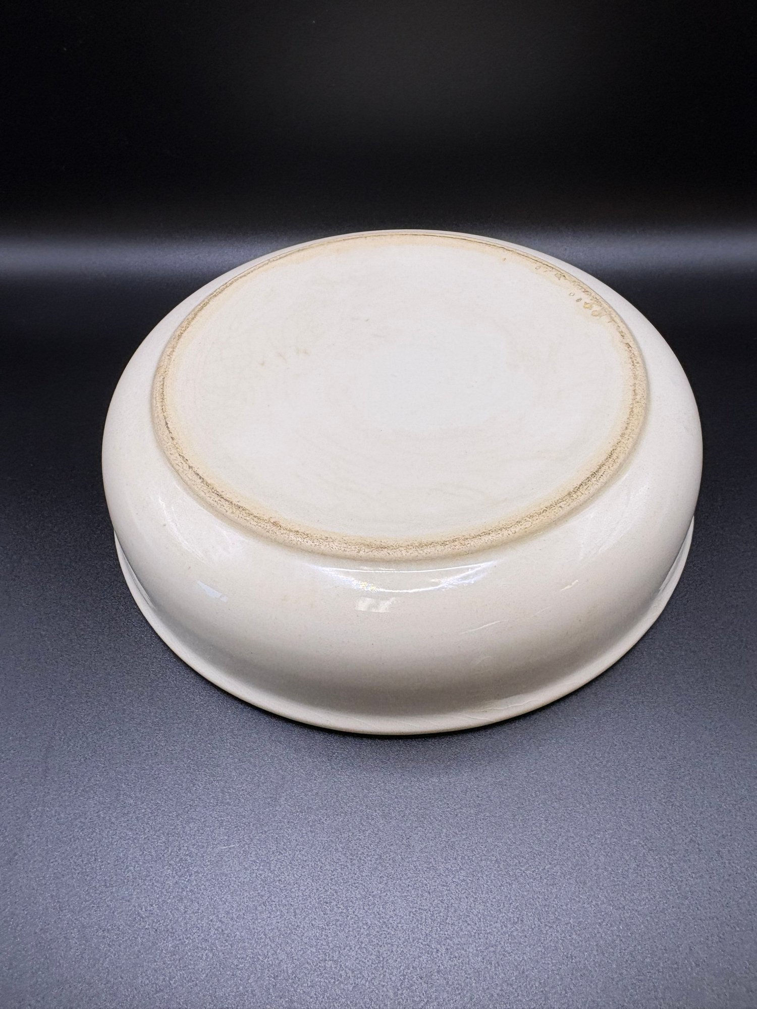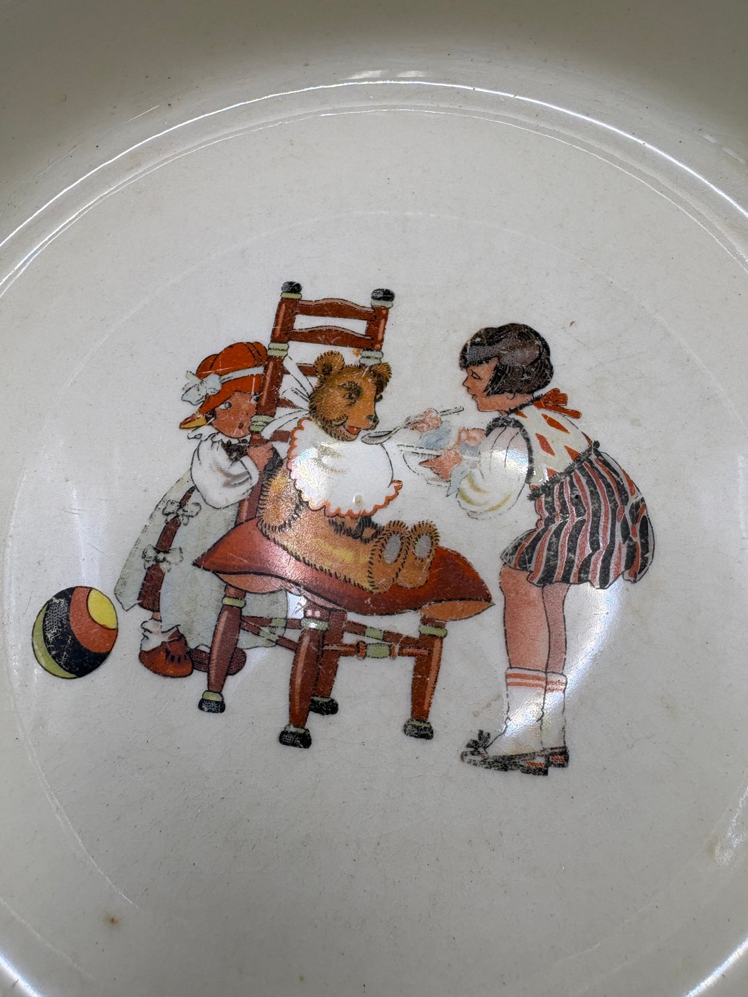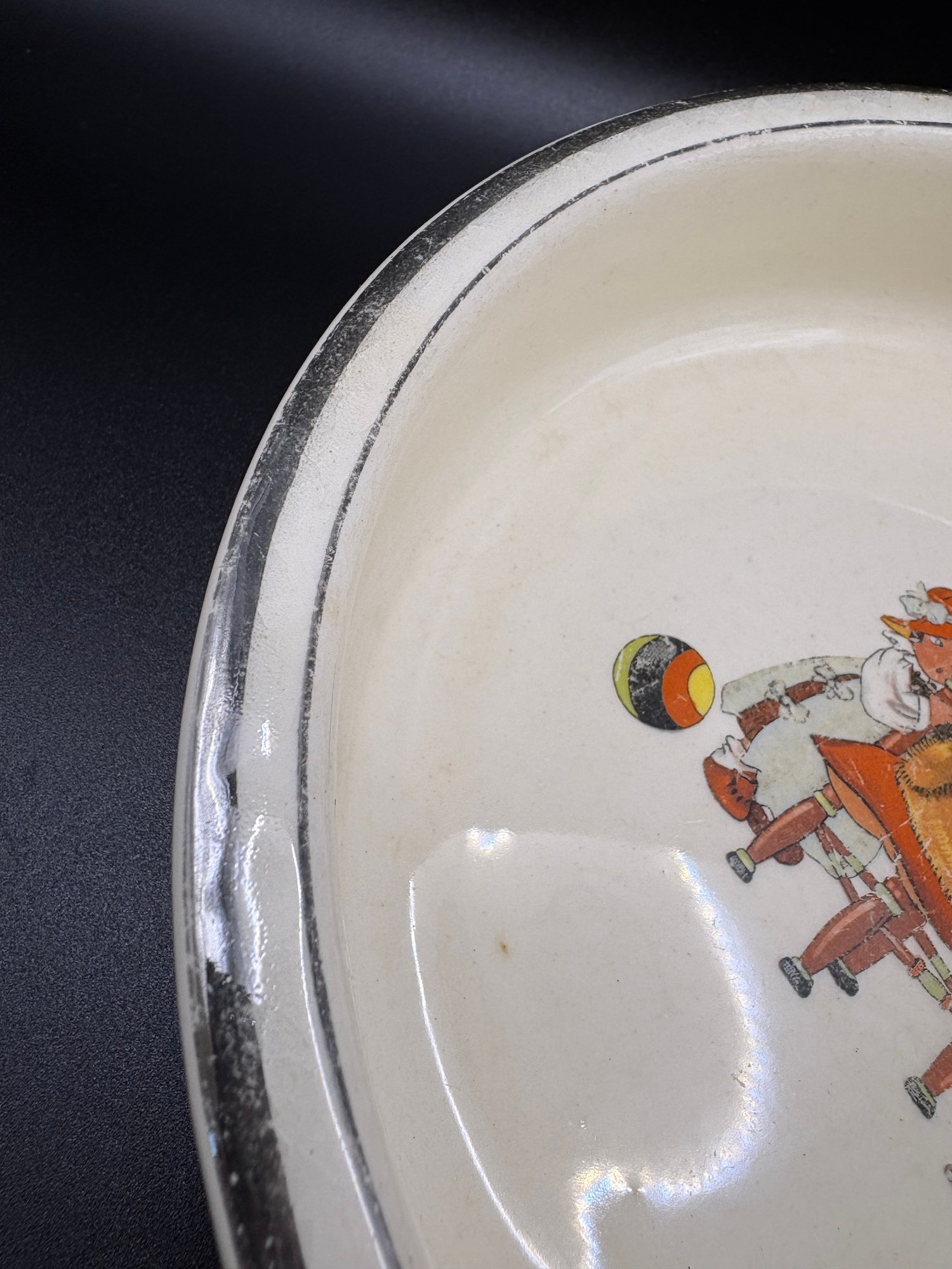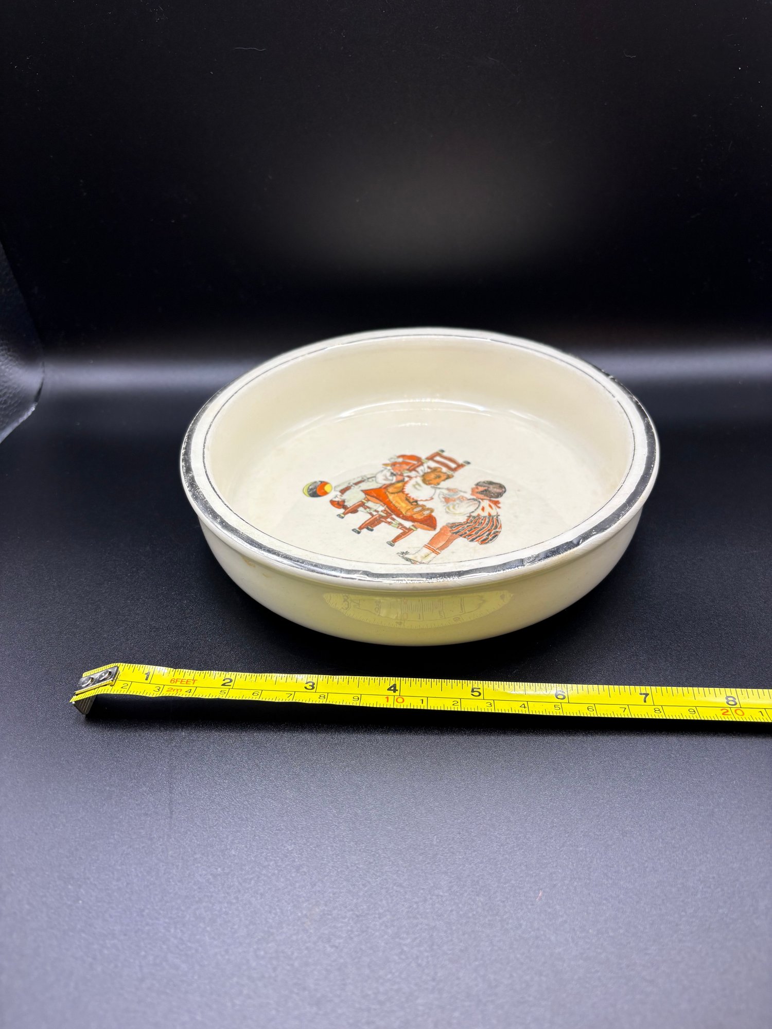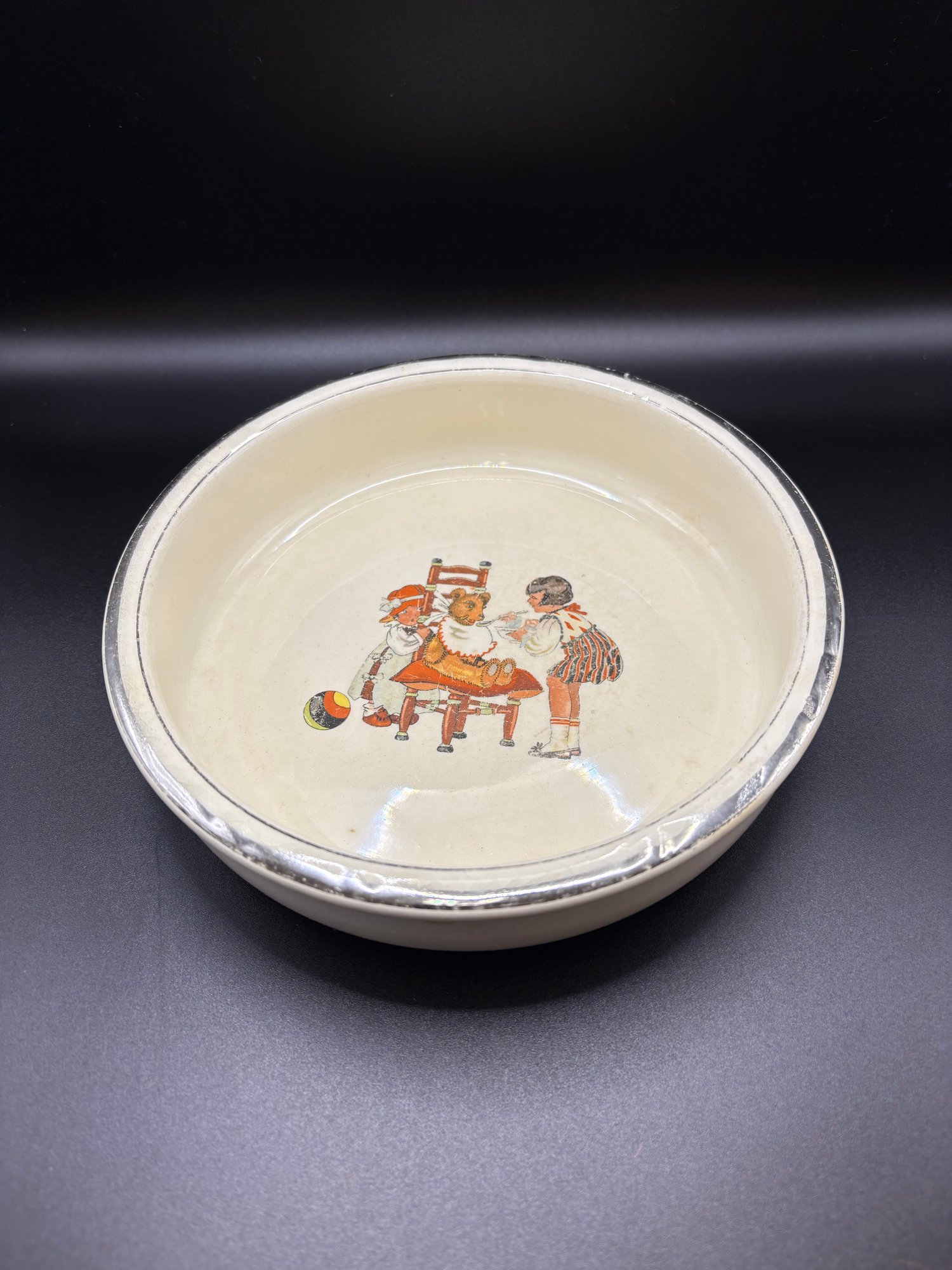 art deco Childs dish salem ohio , ceramic pottery with faded silver tone rim , might be silver plated rim