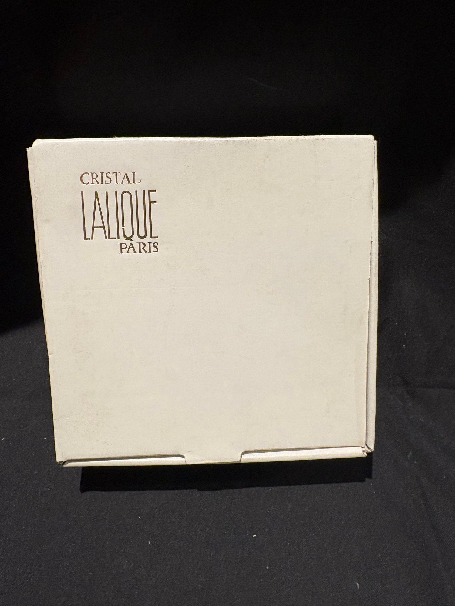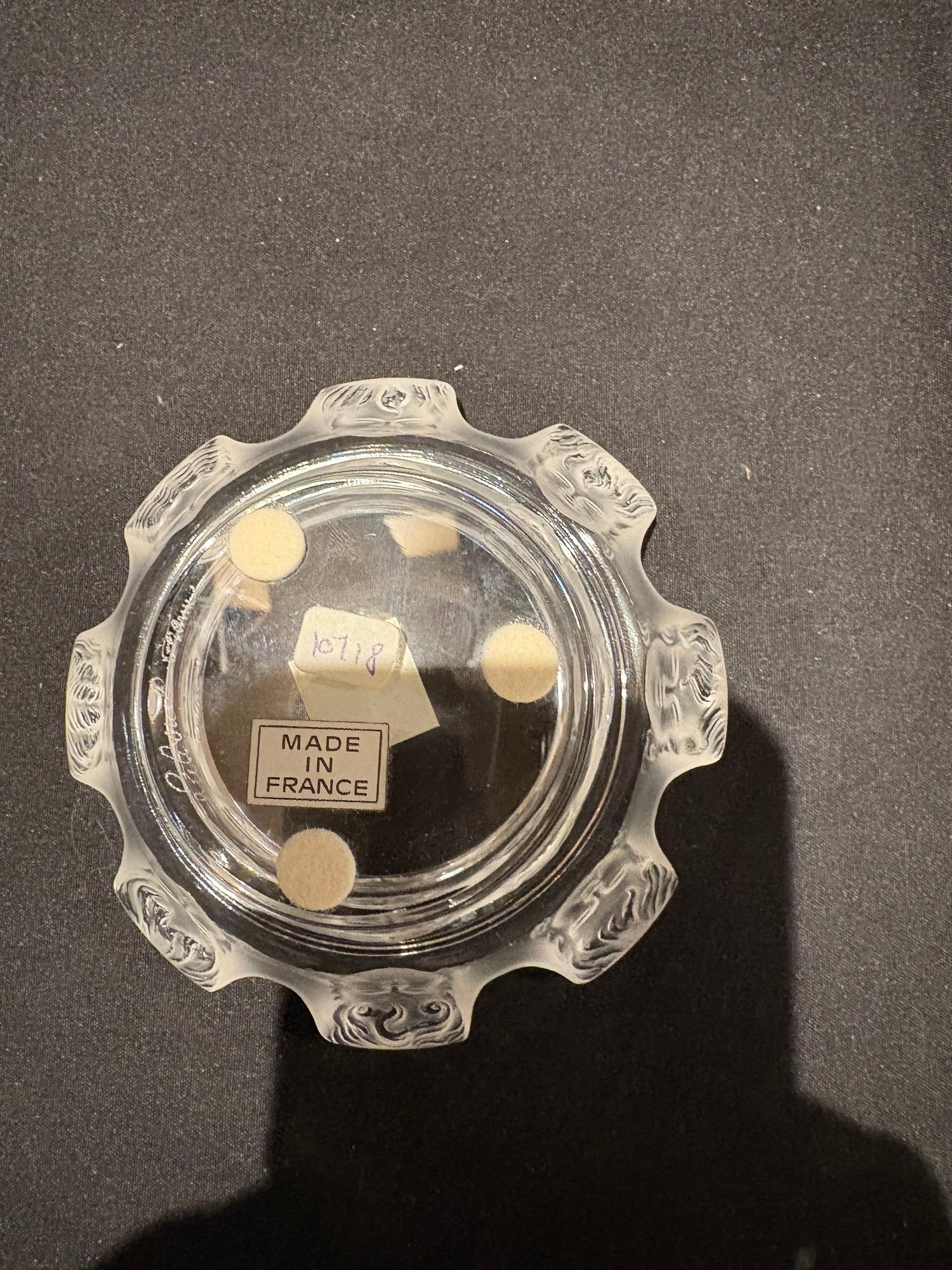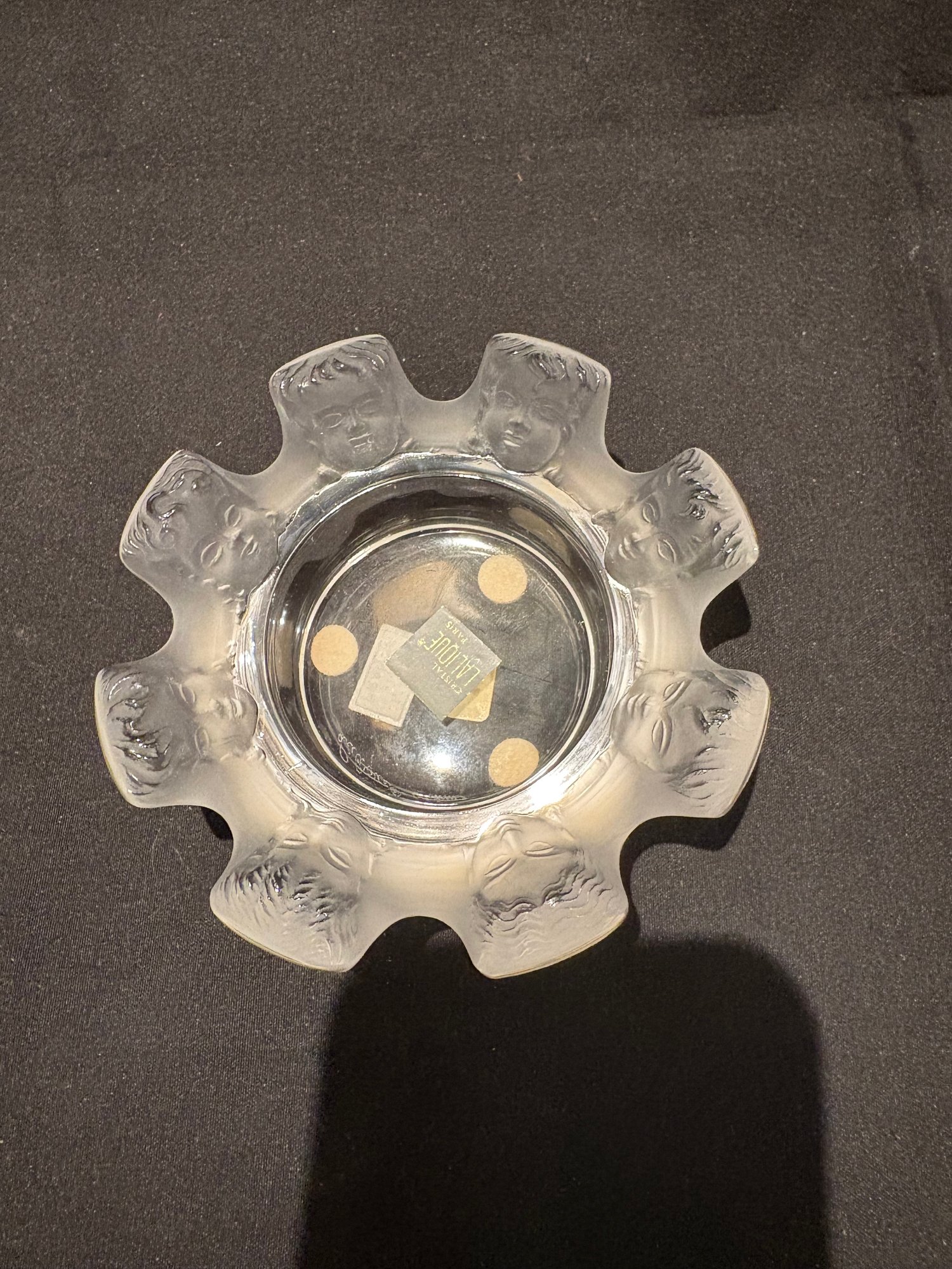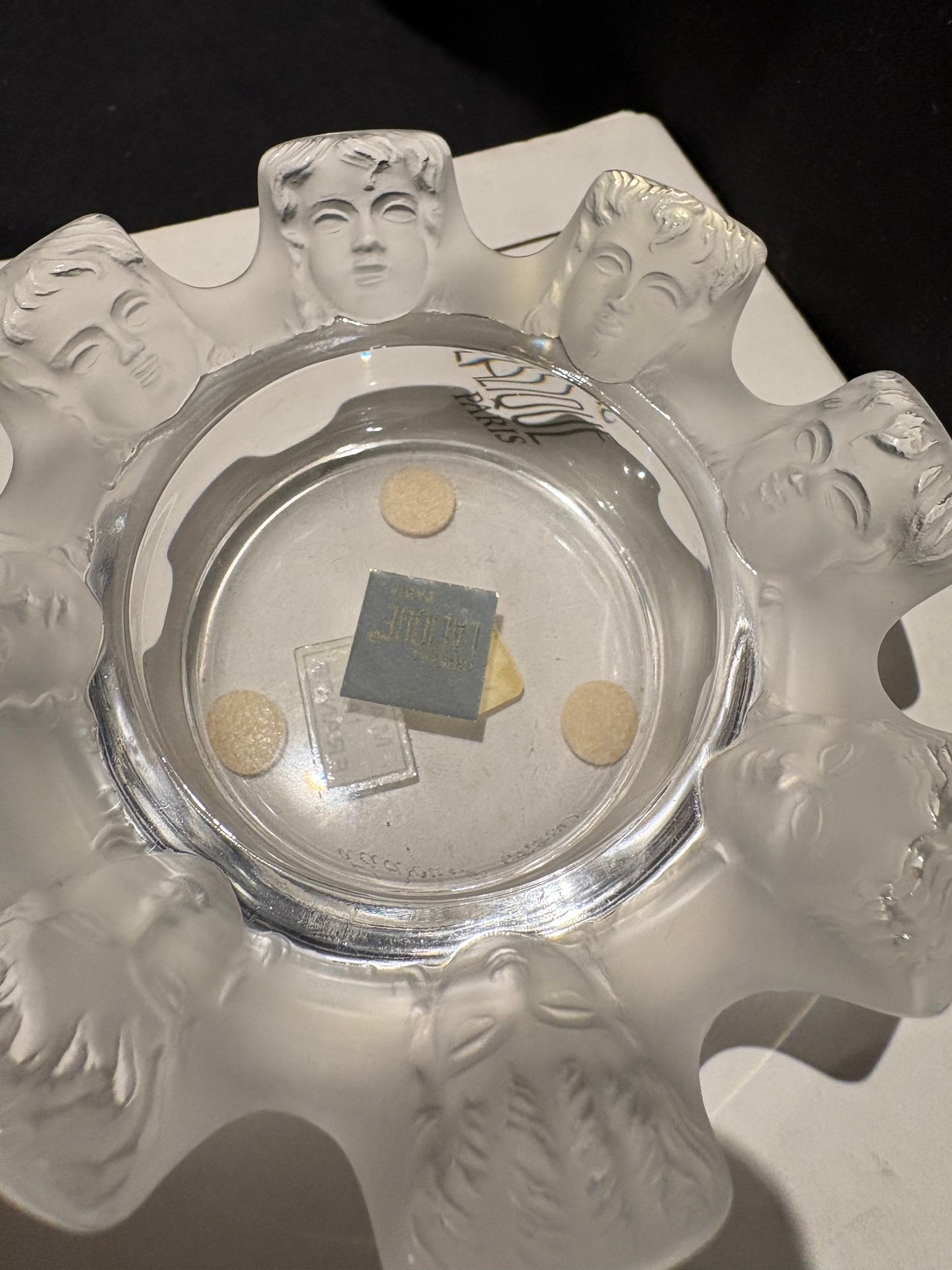 Lalique France trinket dish with cherub faces ,measures 4.25 in