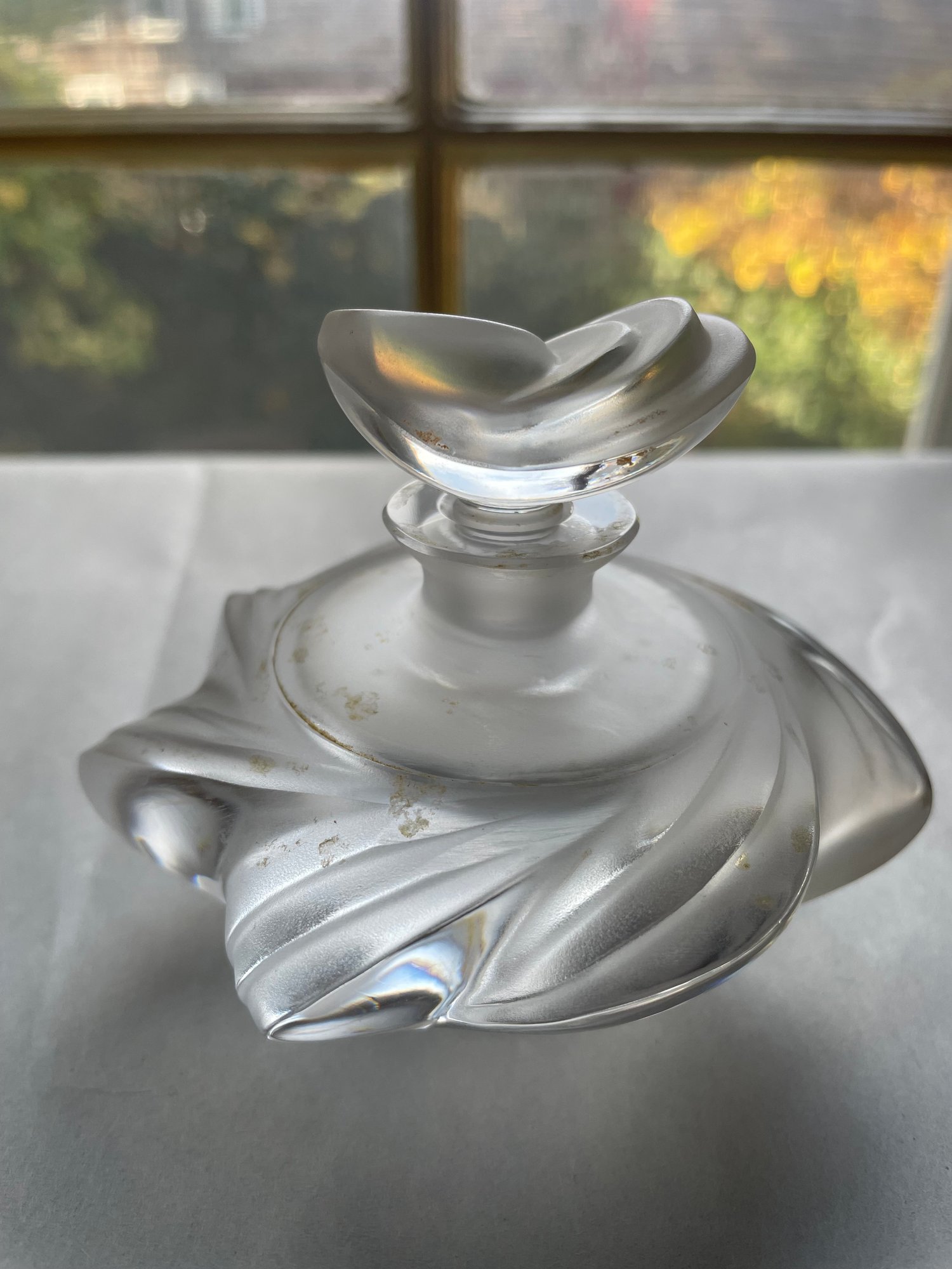 Lalique “Somoa” perfume bottle. Height 3inches( including stopper) 4.5 inches at widest point of bottle.