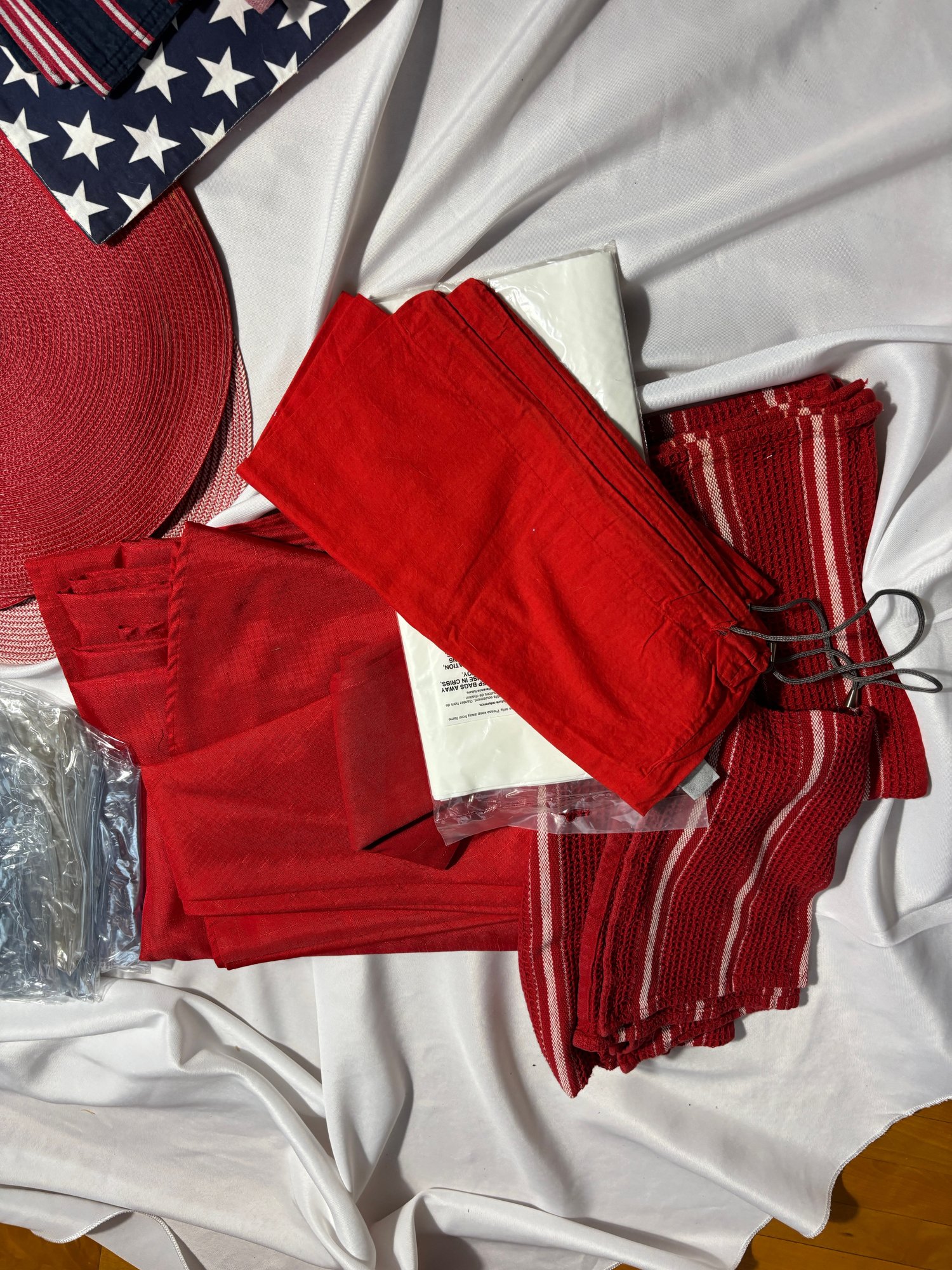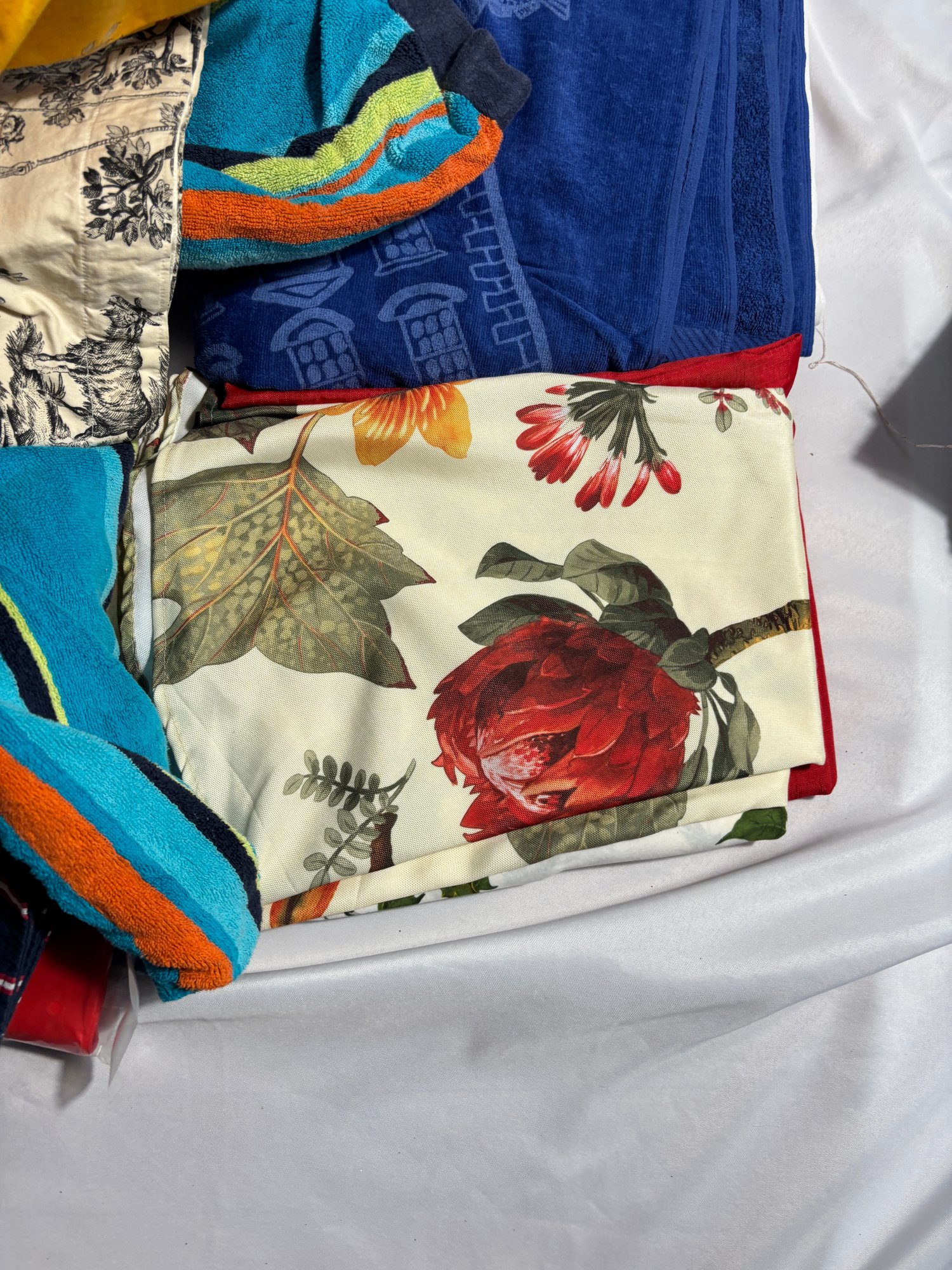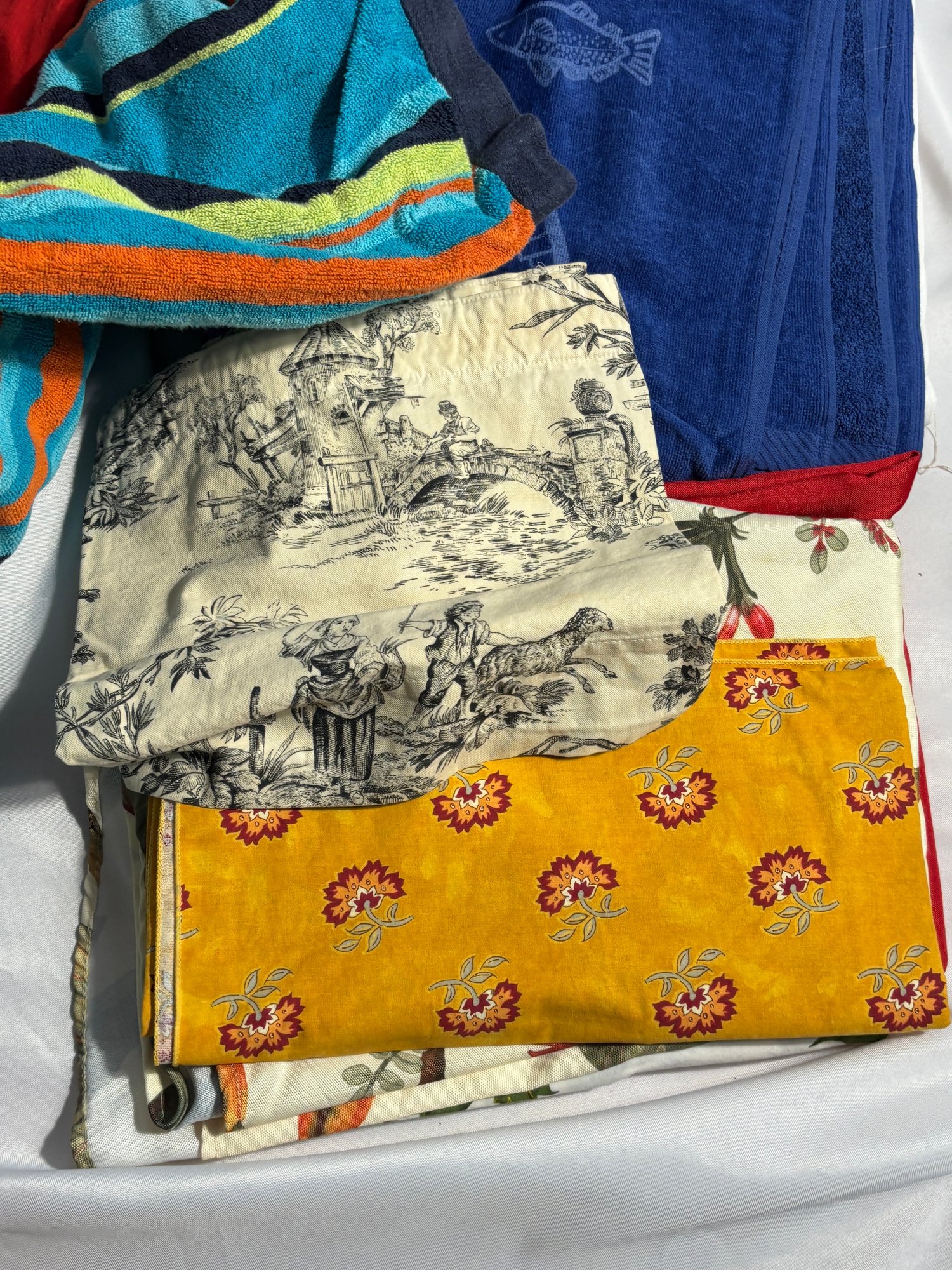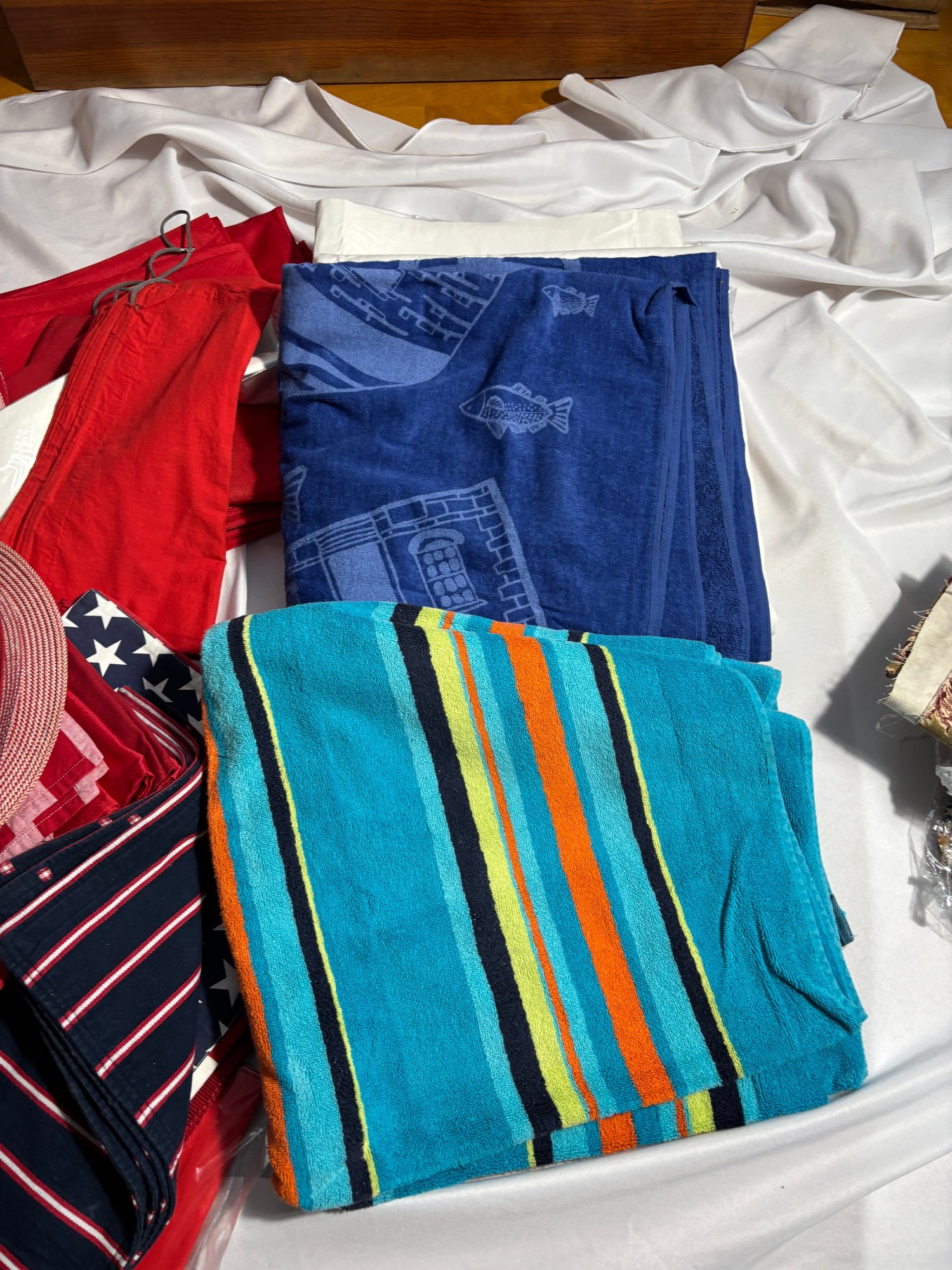 Includes floral & Fourth of July tablecloths, towels, and a bag full of wine bags