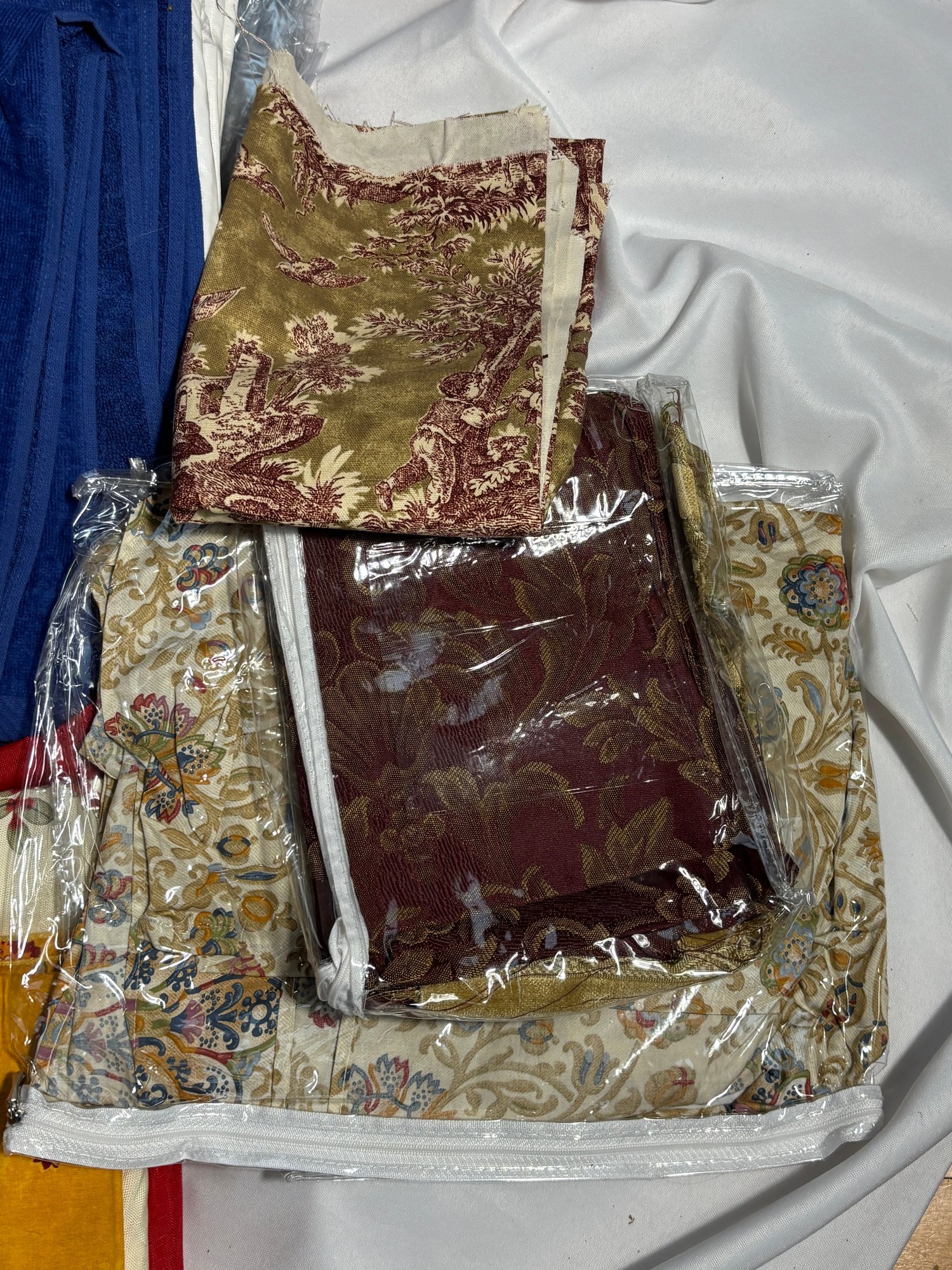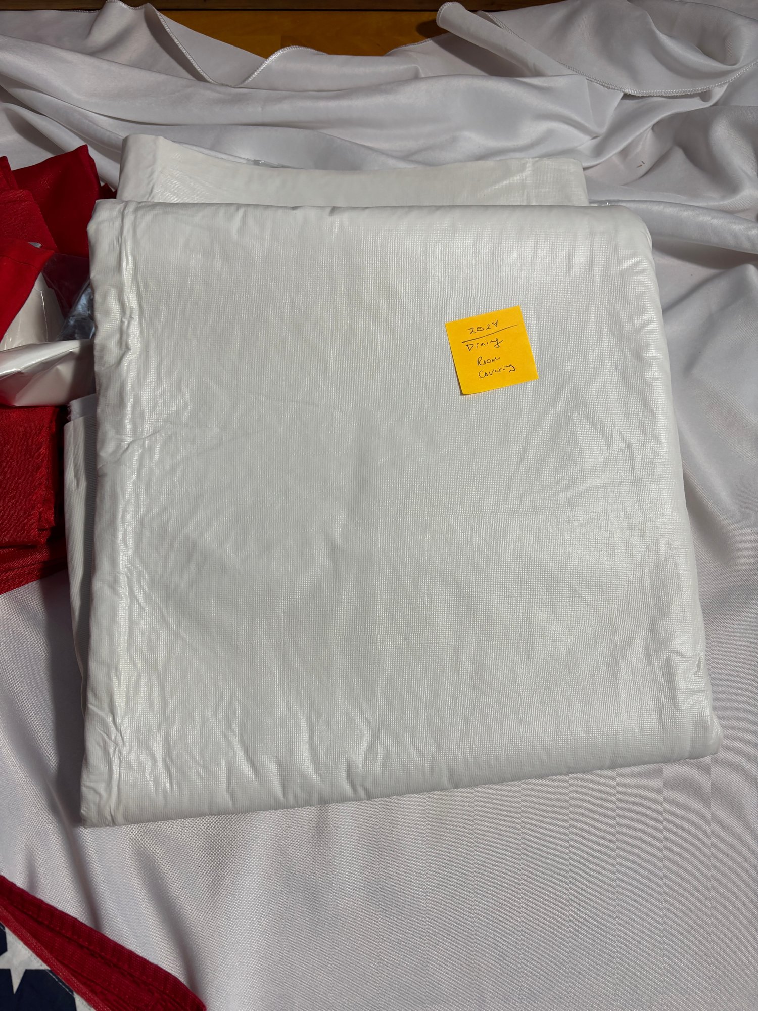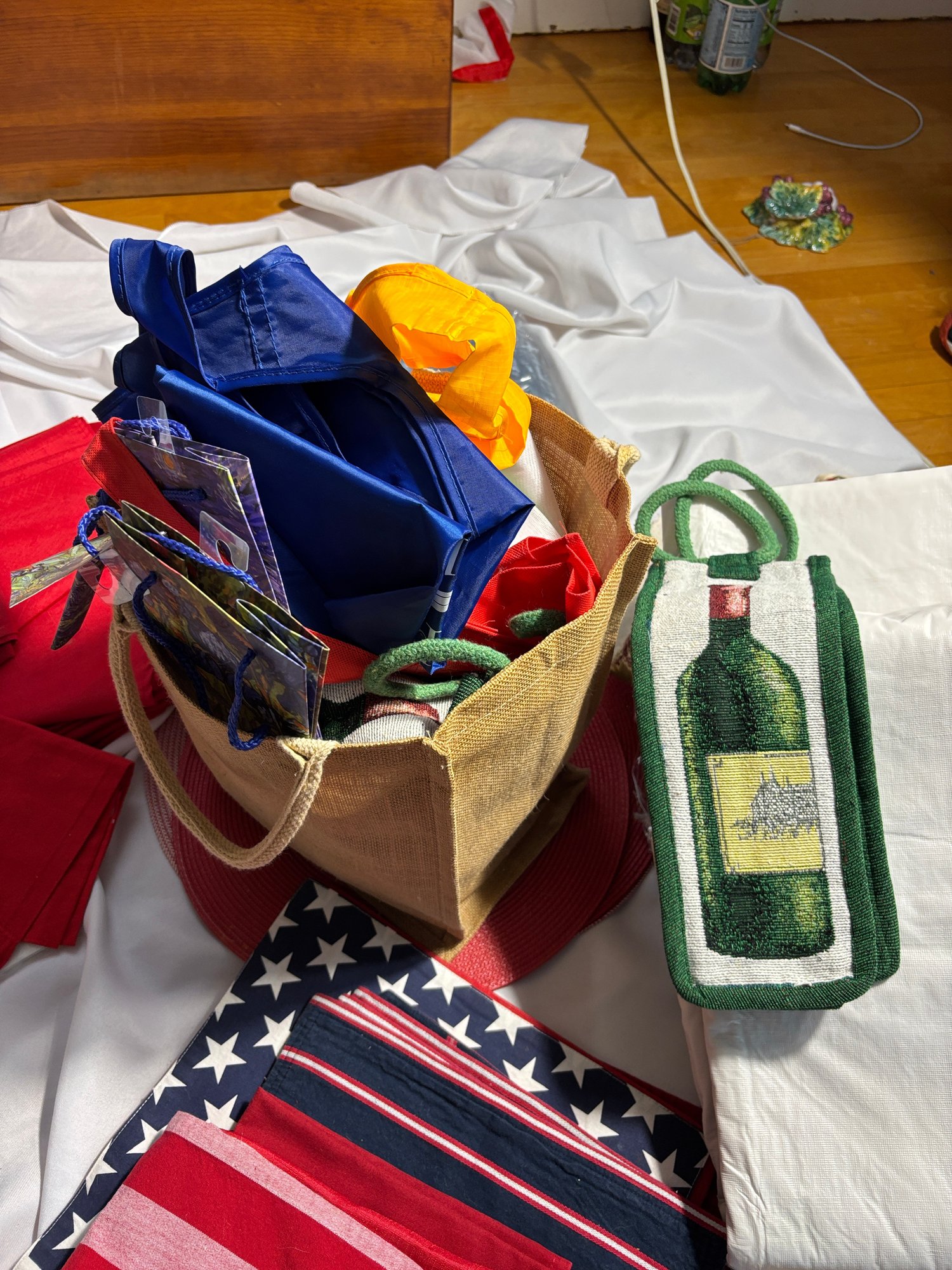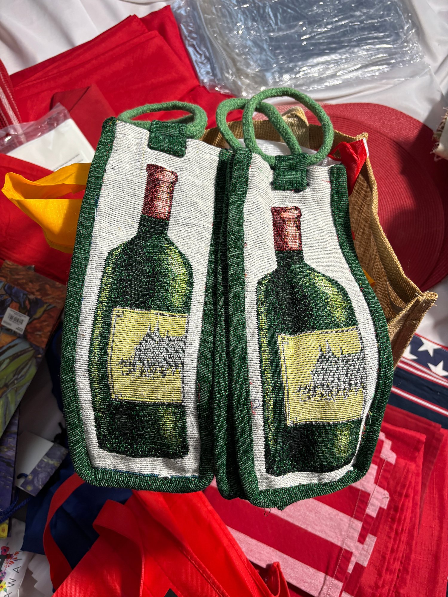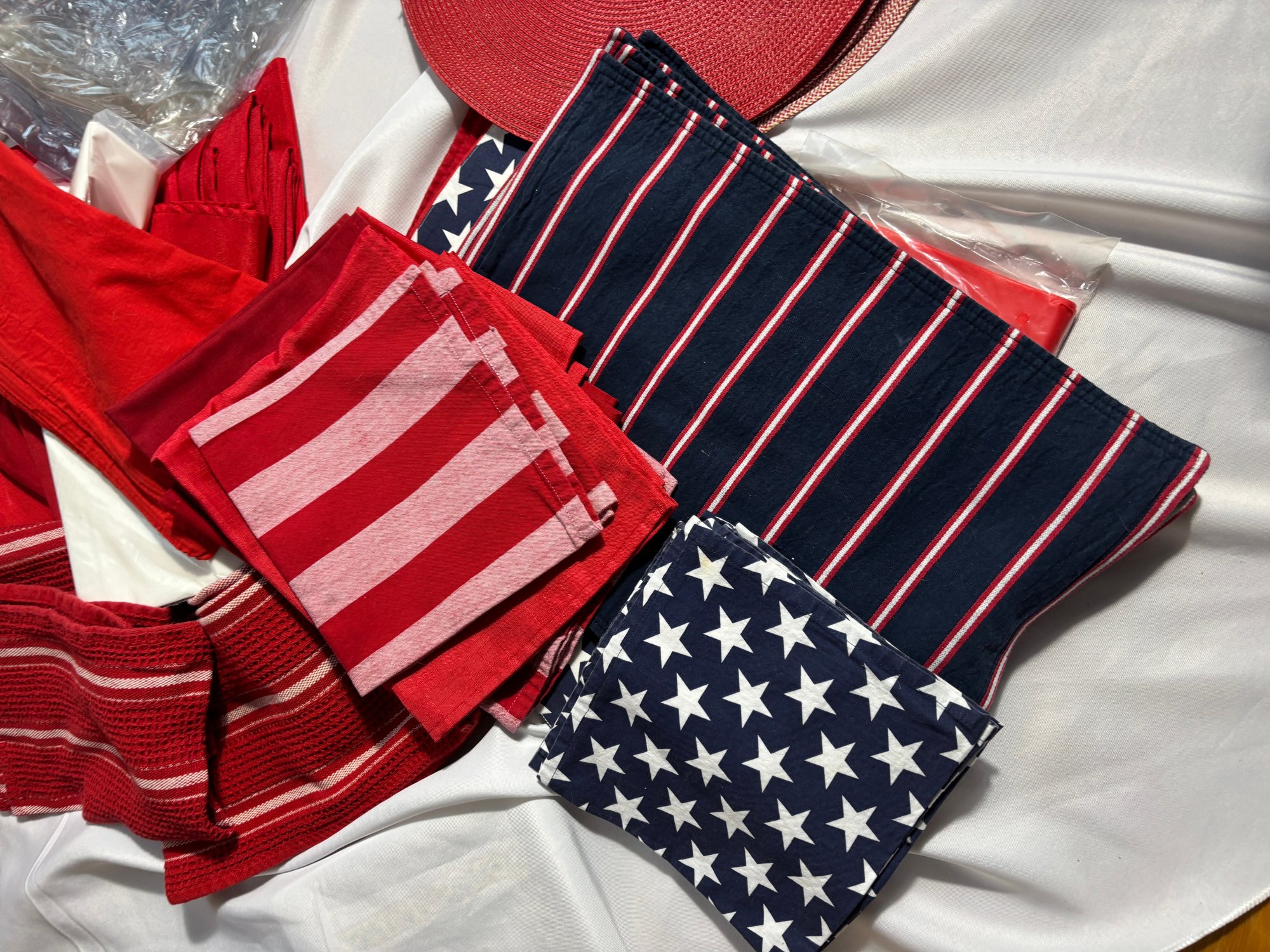 Includes floral & Fourth of July tablecloths, towels, and a bag full of wine bags