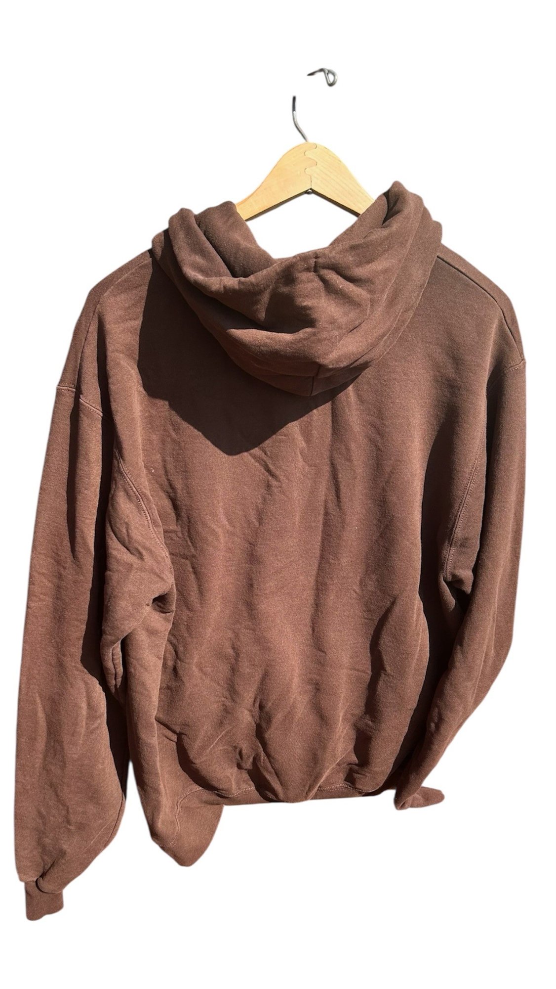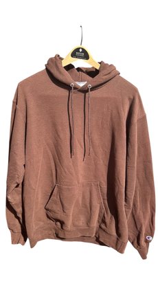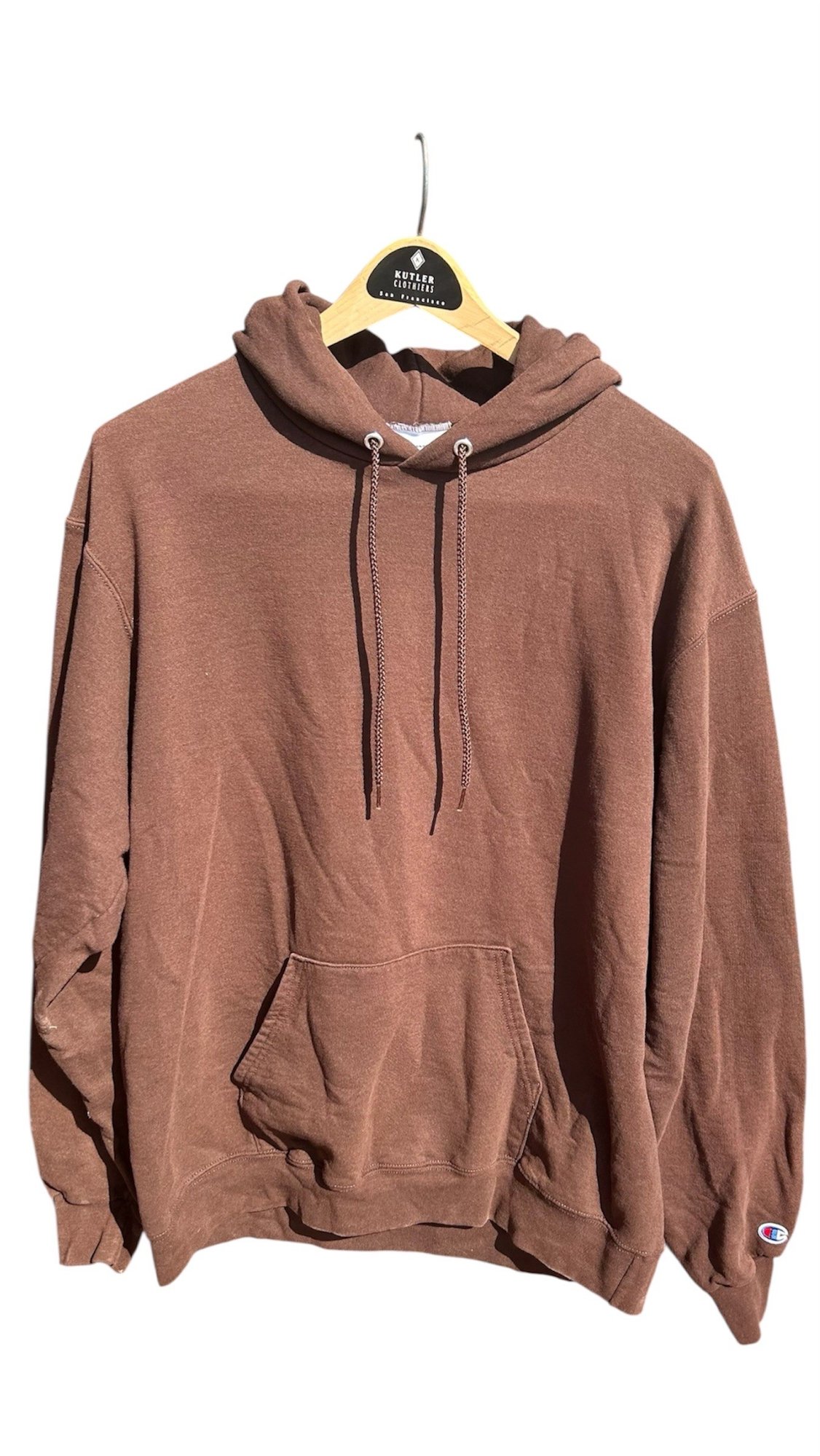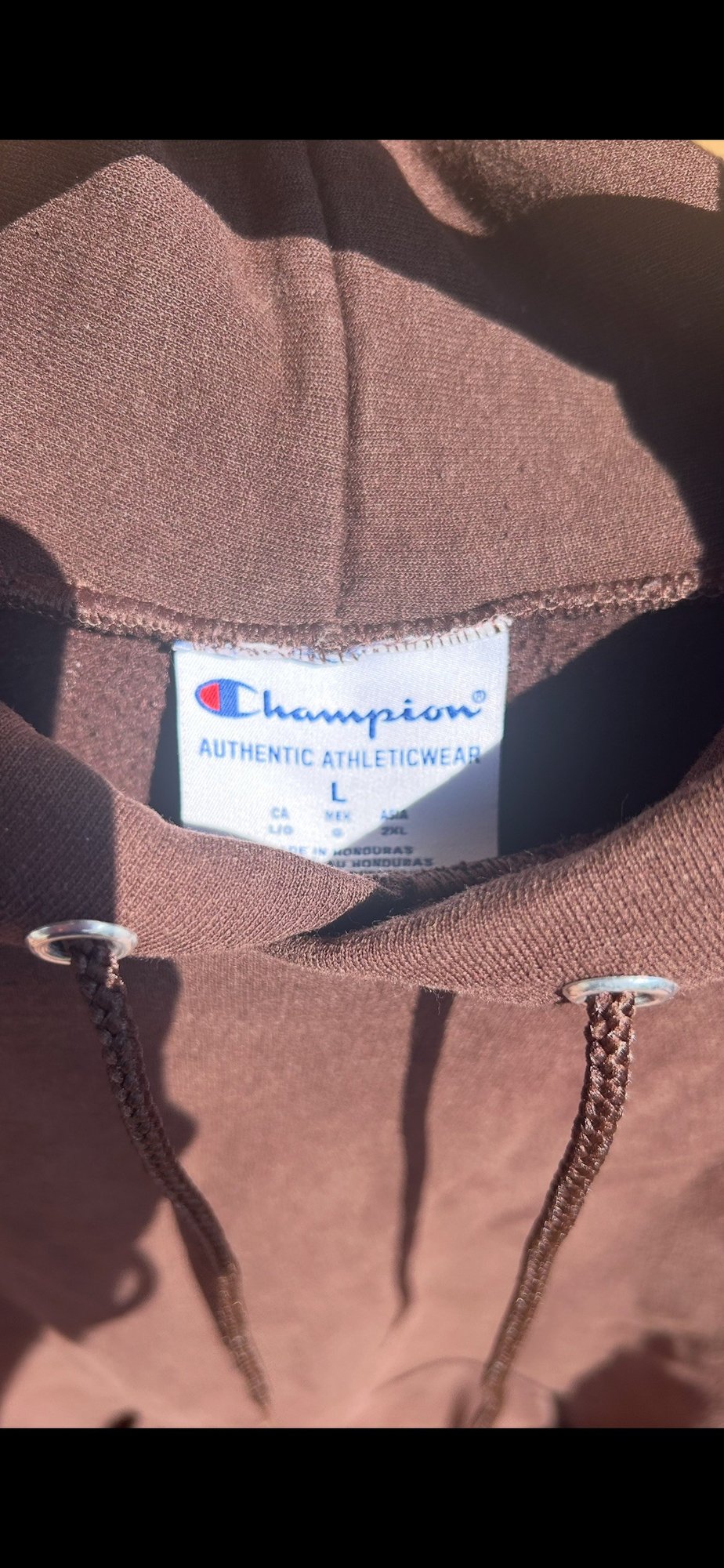 Cozy Champion hoodie in brown with kangaroo pocket and drawstring hood. Embroidered āCā logo on sleeve.