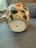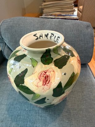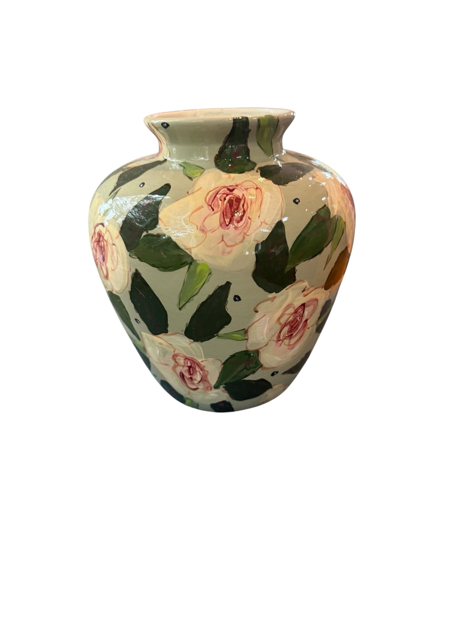 Droll large vase with green background and leaves and pink flowers. 9”h x 10” round.