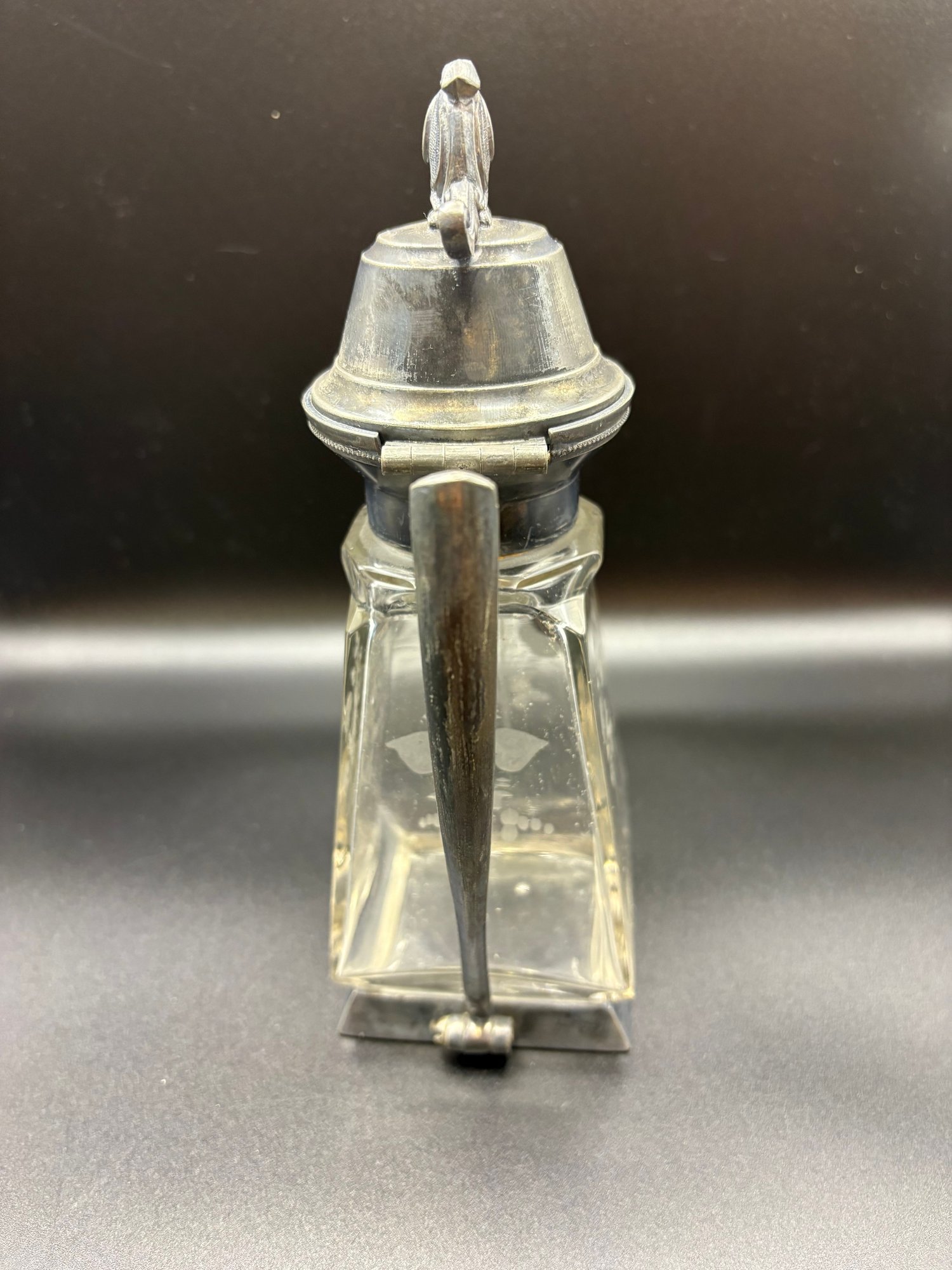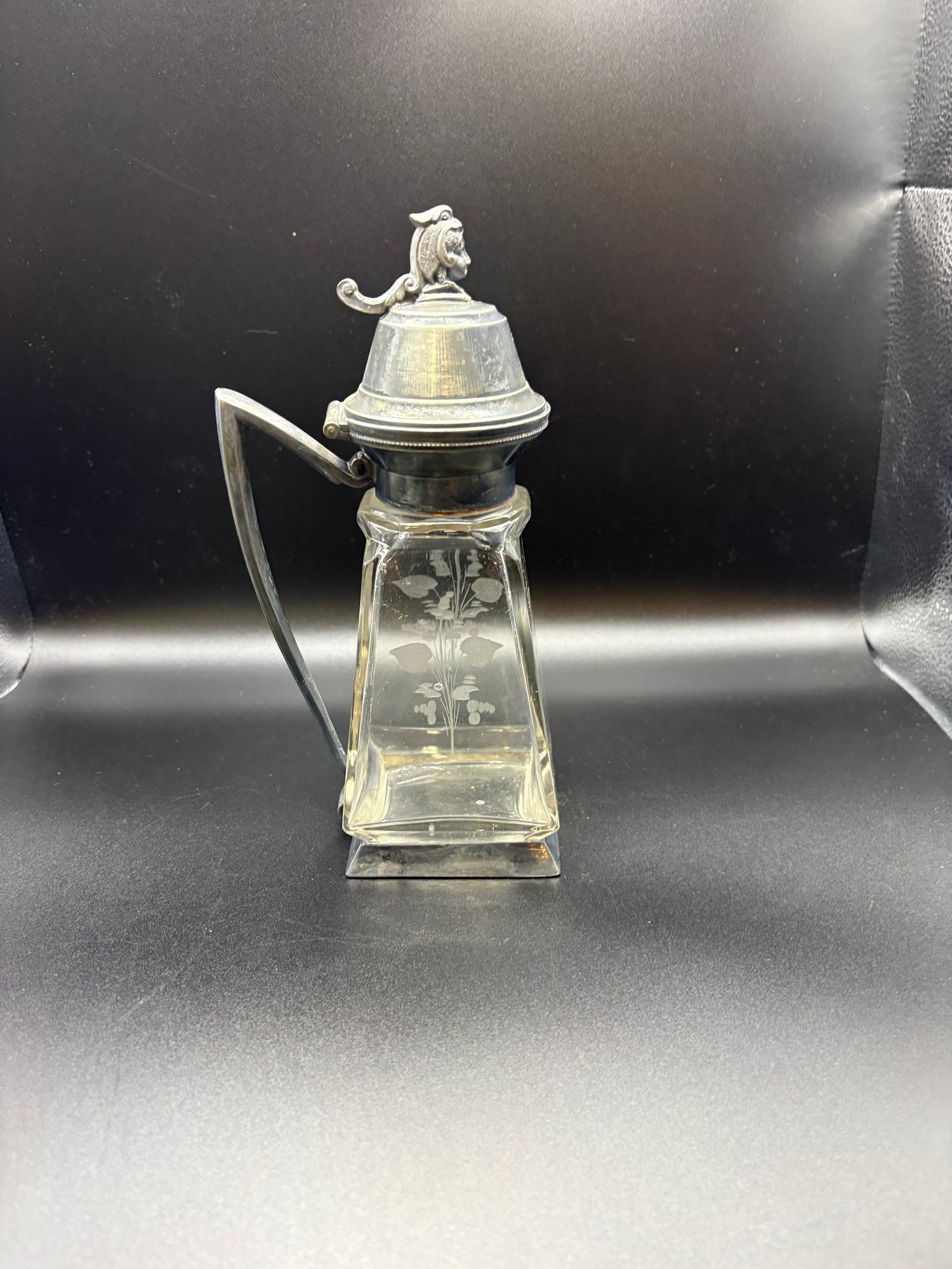 Pairpoint Mfg Co 1710 maybe silverplate hollowware claret jug with an etched glass body. And pewter