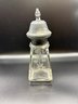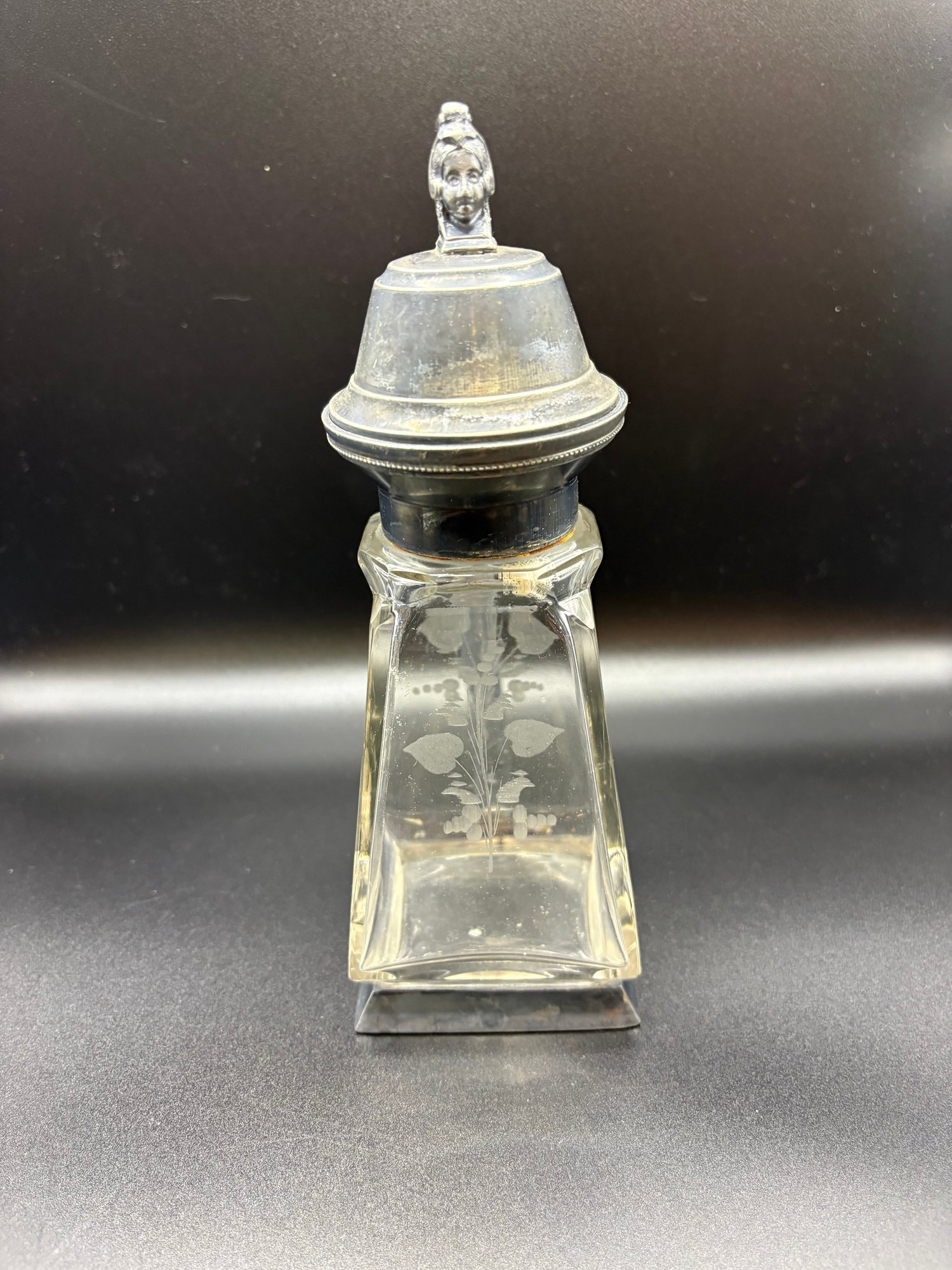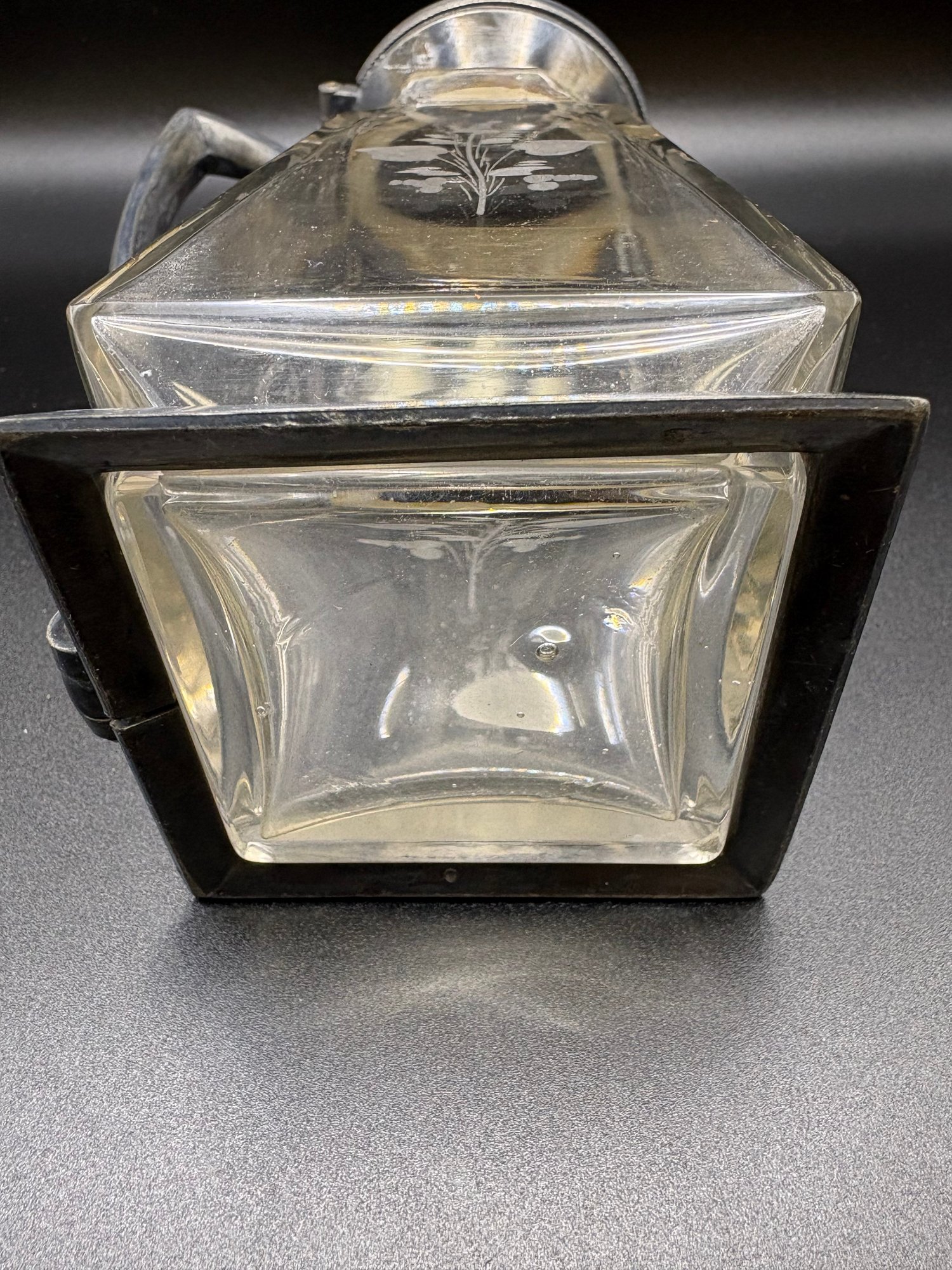 The jug features a distinctive square, tapered glass body with a floral etching pattern.
