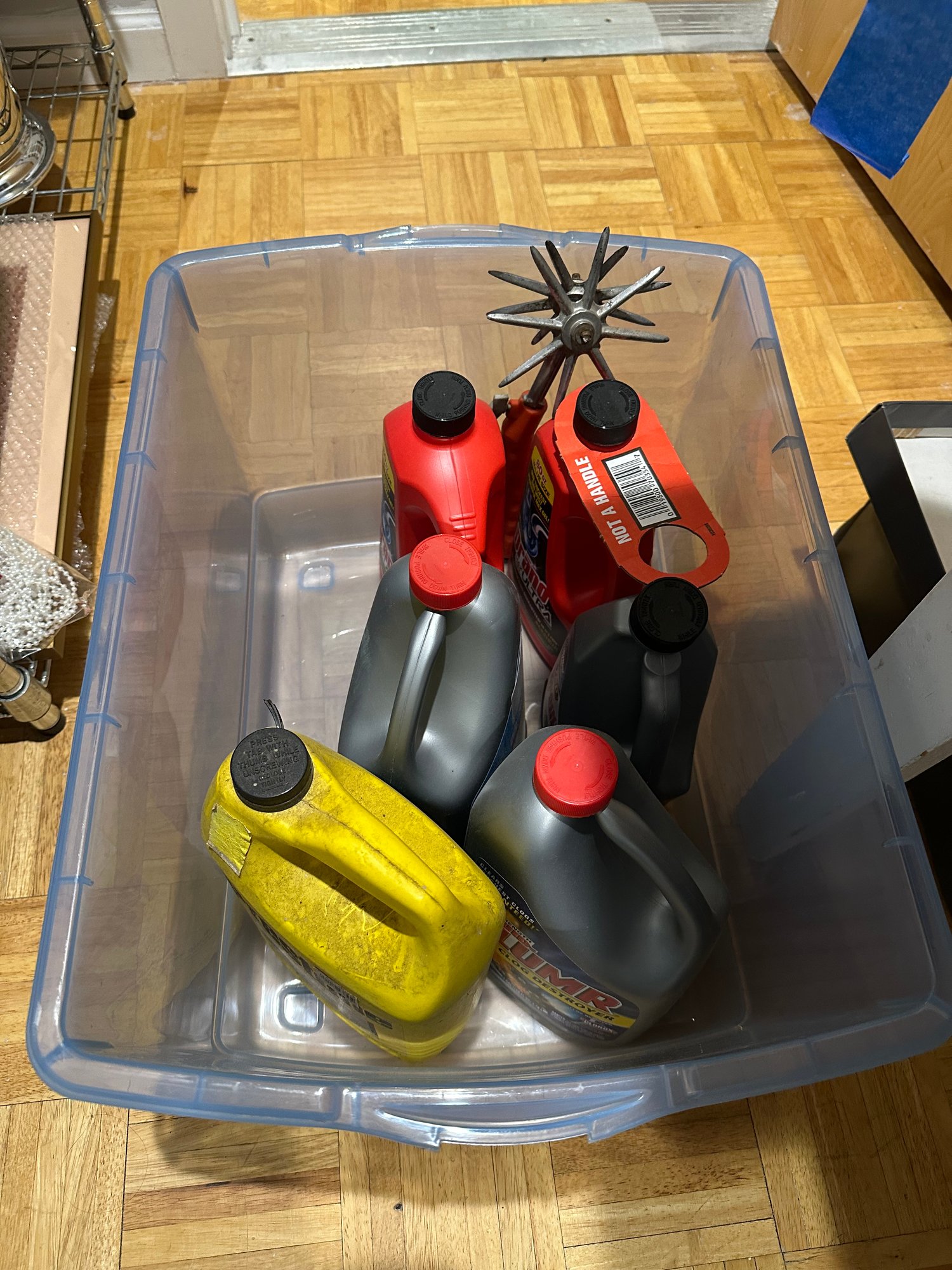 Draino drain opener and Prestone coolant have been opened