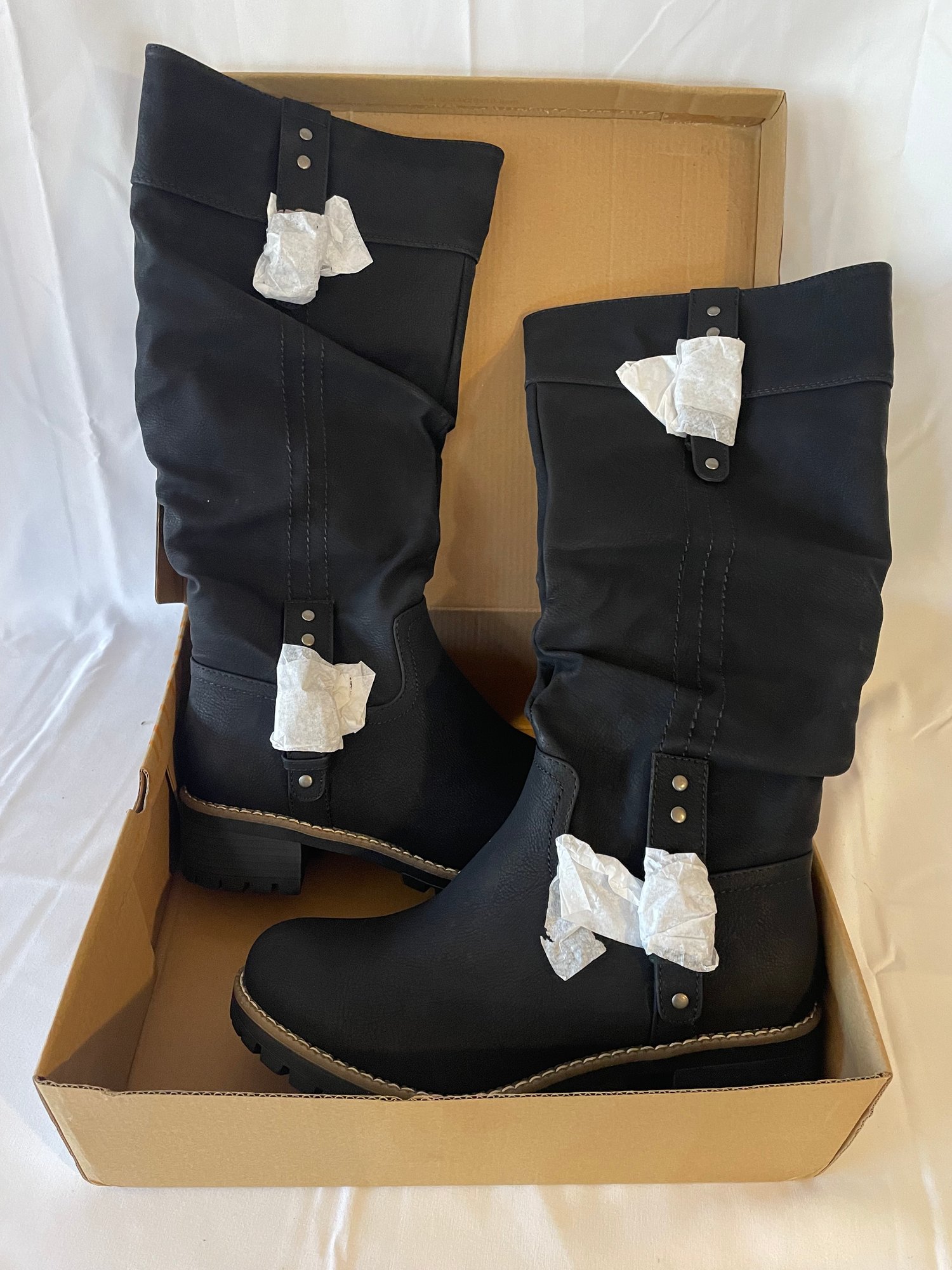 Global Win black knee high boots with side zipper, cushioned foot bed, rubber sole, shaft height 14.5, shaft circumference 14”