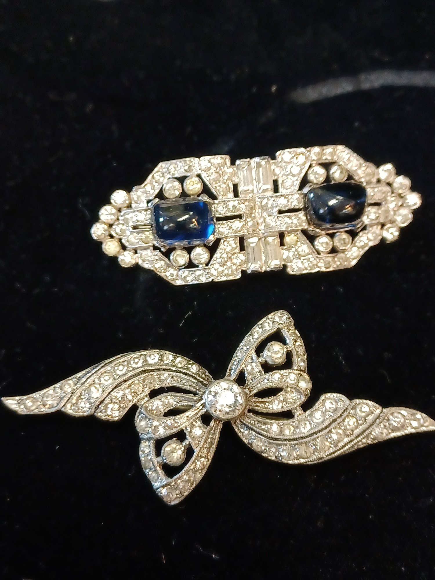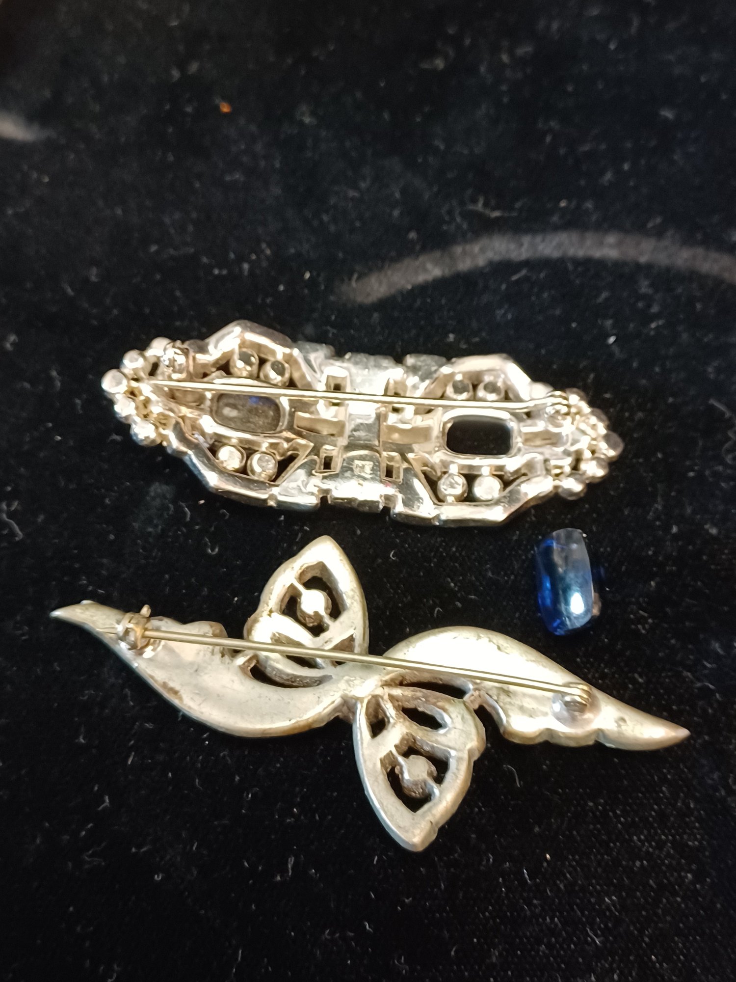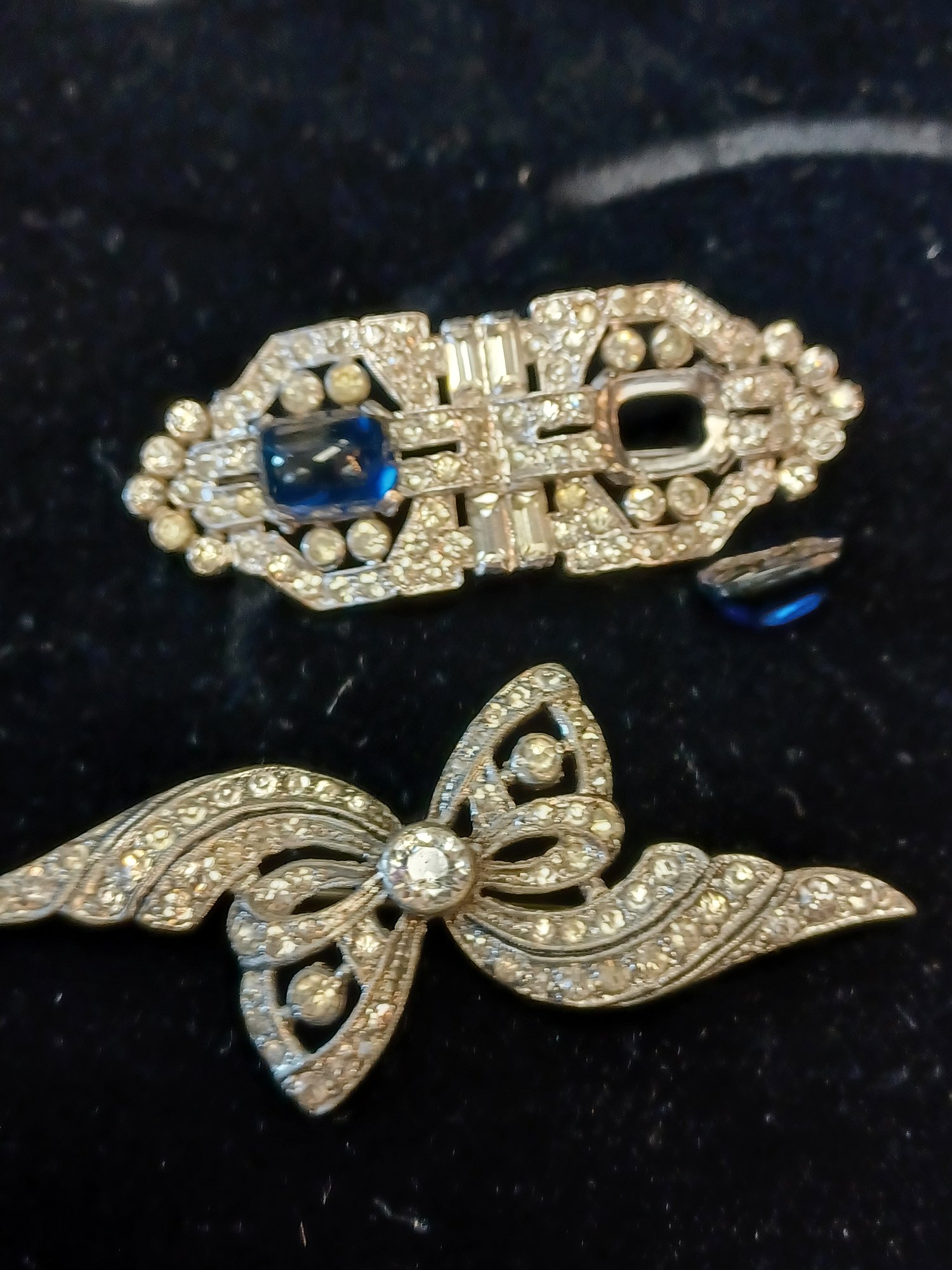 * 1 blue, plastic/glass (?) stone needs re-attaching; unknown hallmark