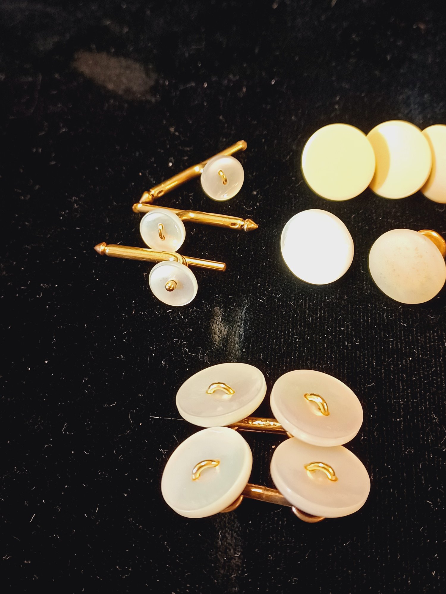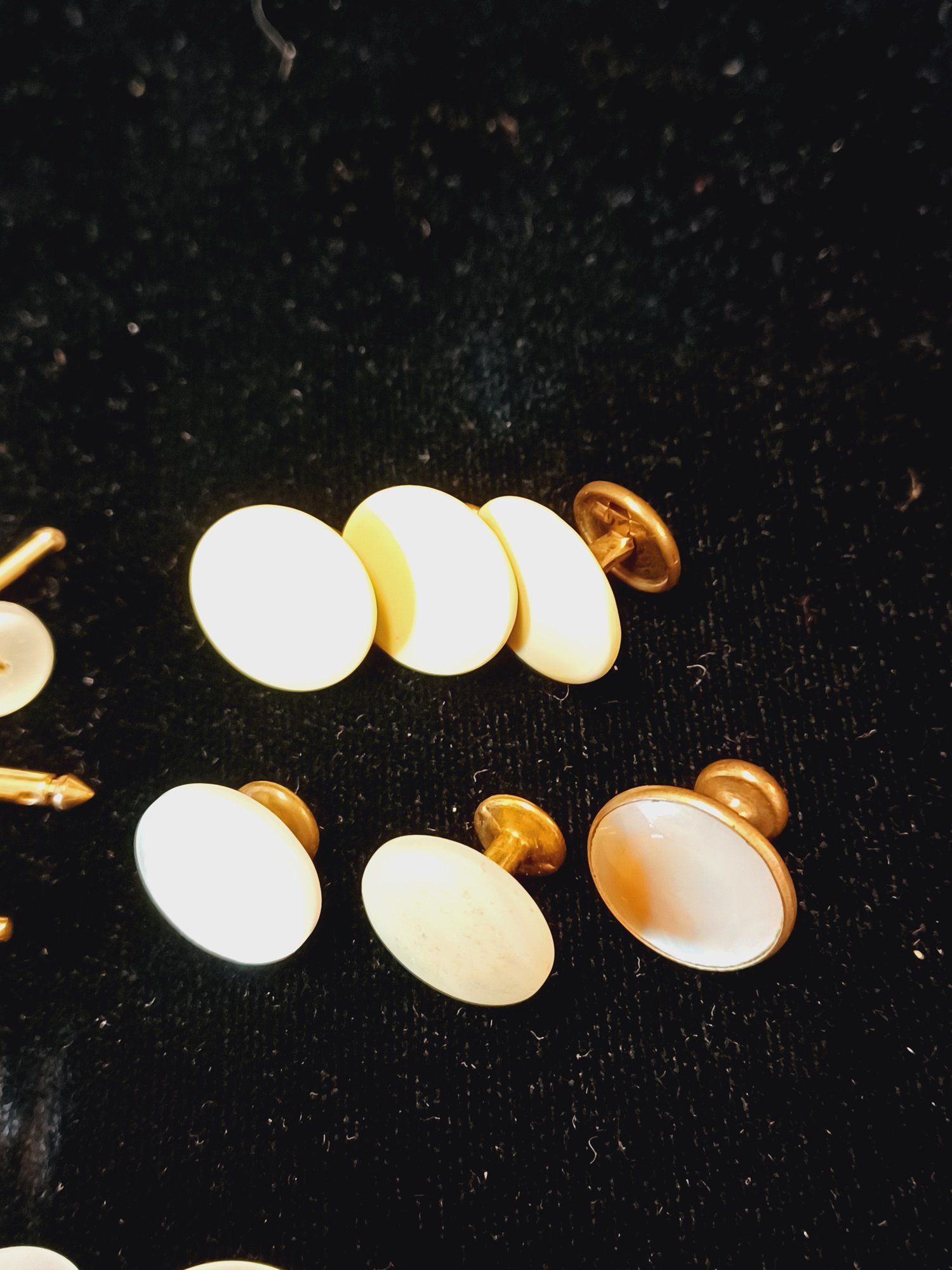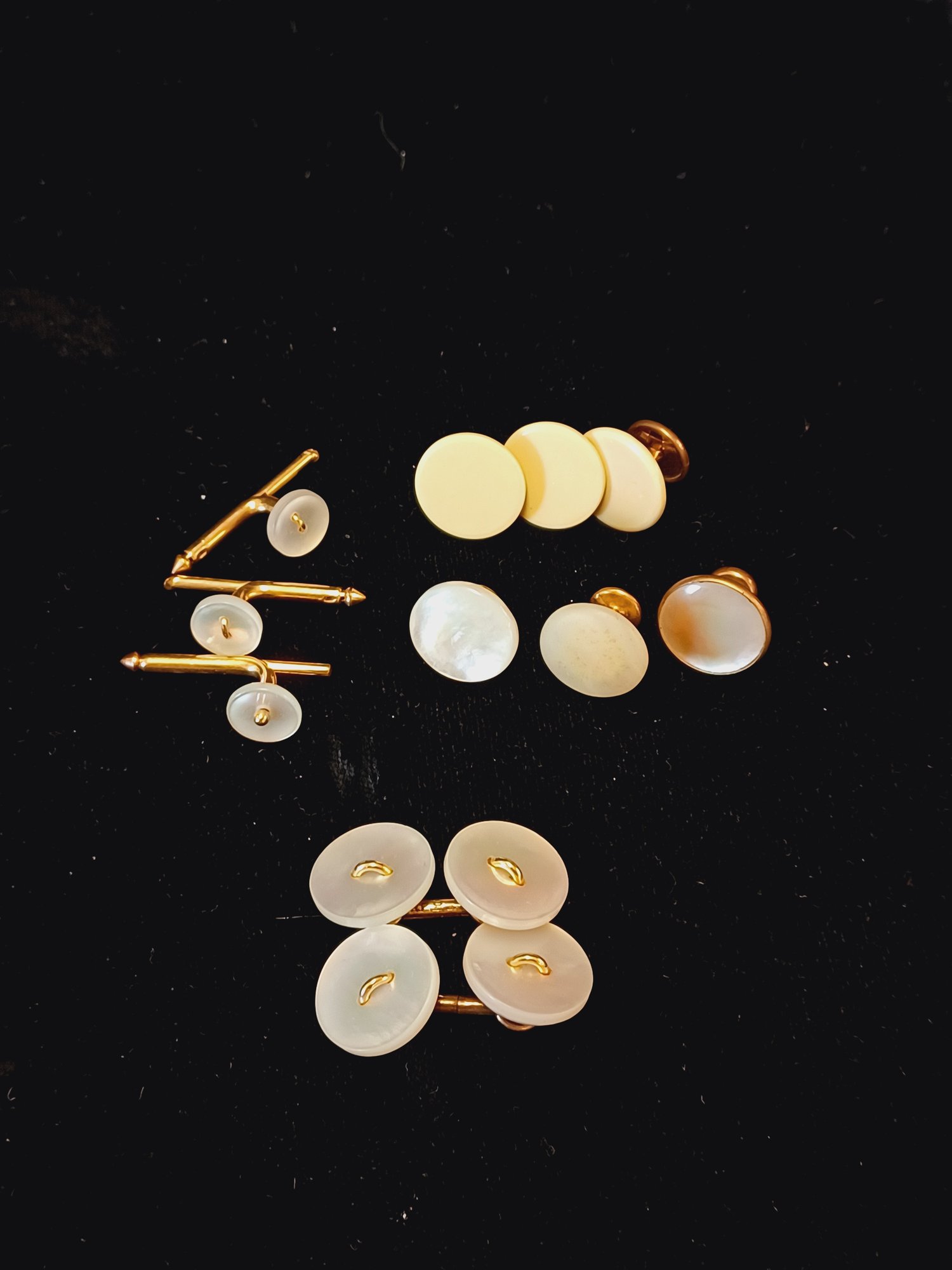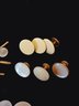 11 pcs total; 3 are some kind of yellow enamel and rest are MOP; *1 is discolored