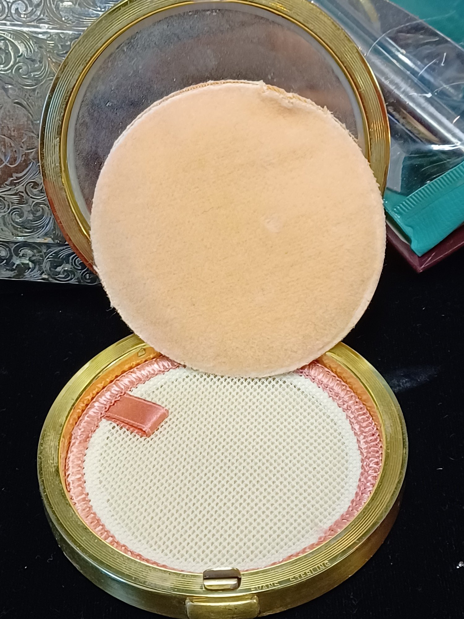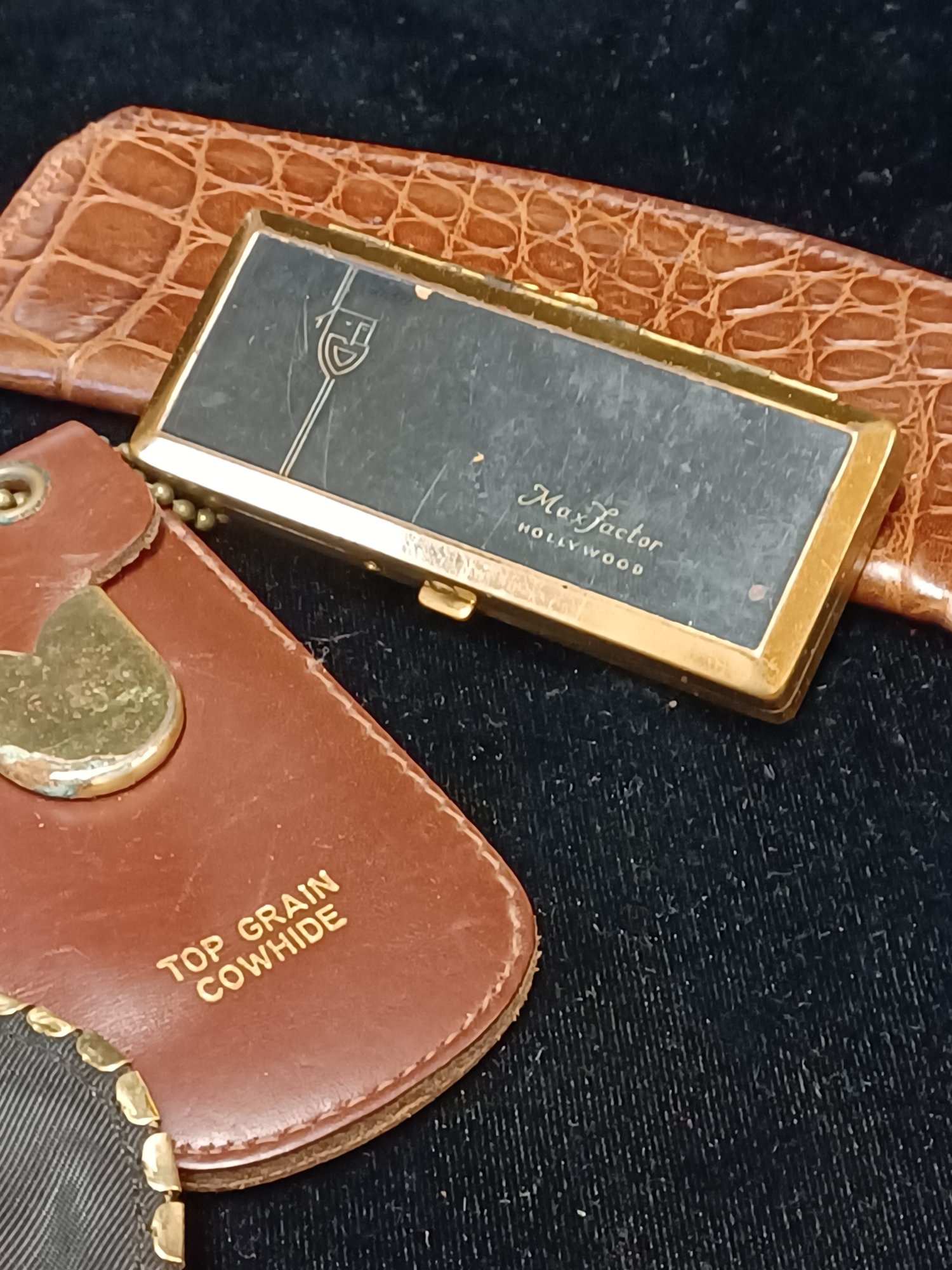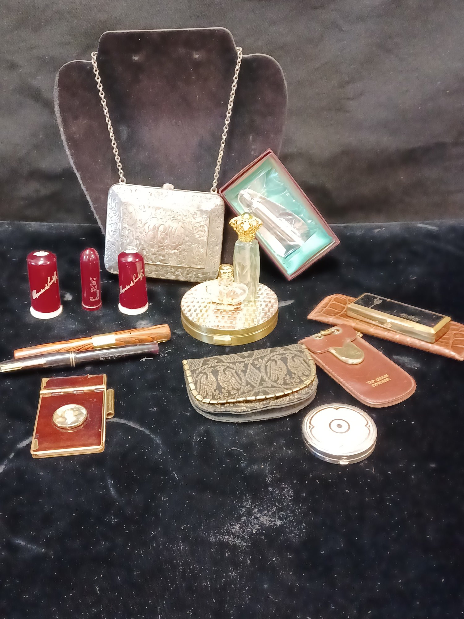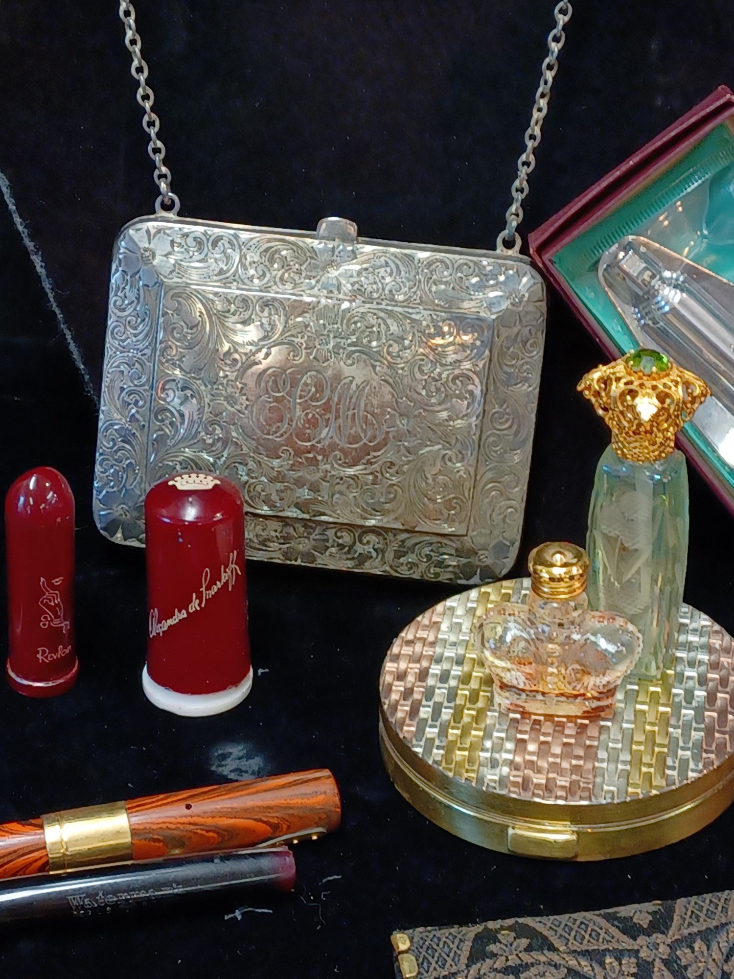 *Antique Sterling compact w/ chain; 2 other round, vintage, compacts; 2 small perfume bottles [Duchess of York & Made in France]; 2 vintage quill pens [1 is Watermans]; New, portable, shoe horn; 3 lipsticks:[2 Alexandra de Markoff & 1 Revlon]; an eyelash makeup container - Max Factor; and a cloth coin purse; 1 metal note pad *no pen; 2 empty leather holders for keys(?) and comb. 16 pieces total