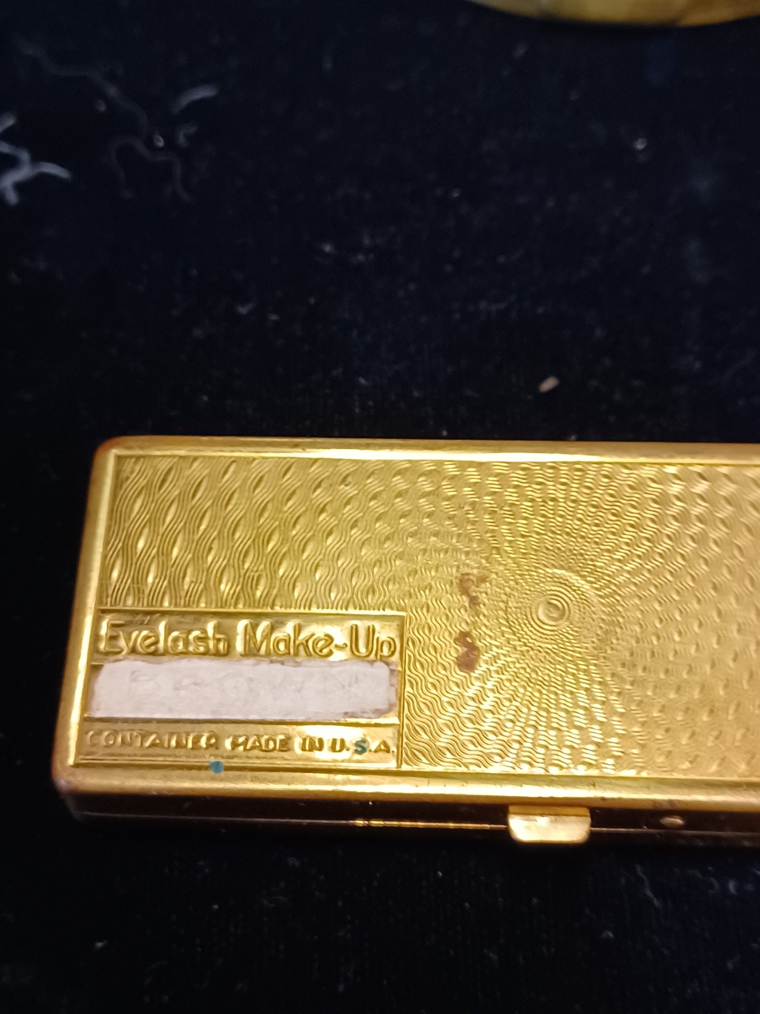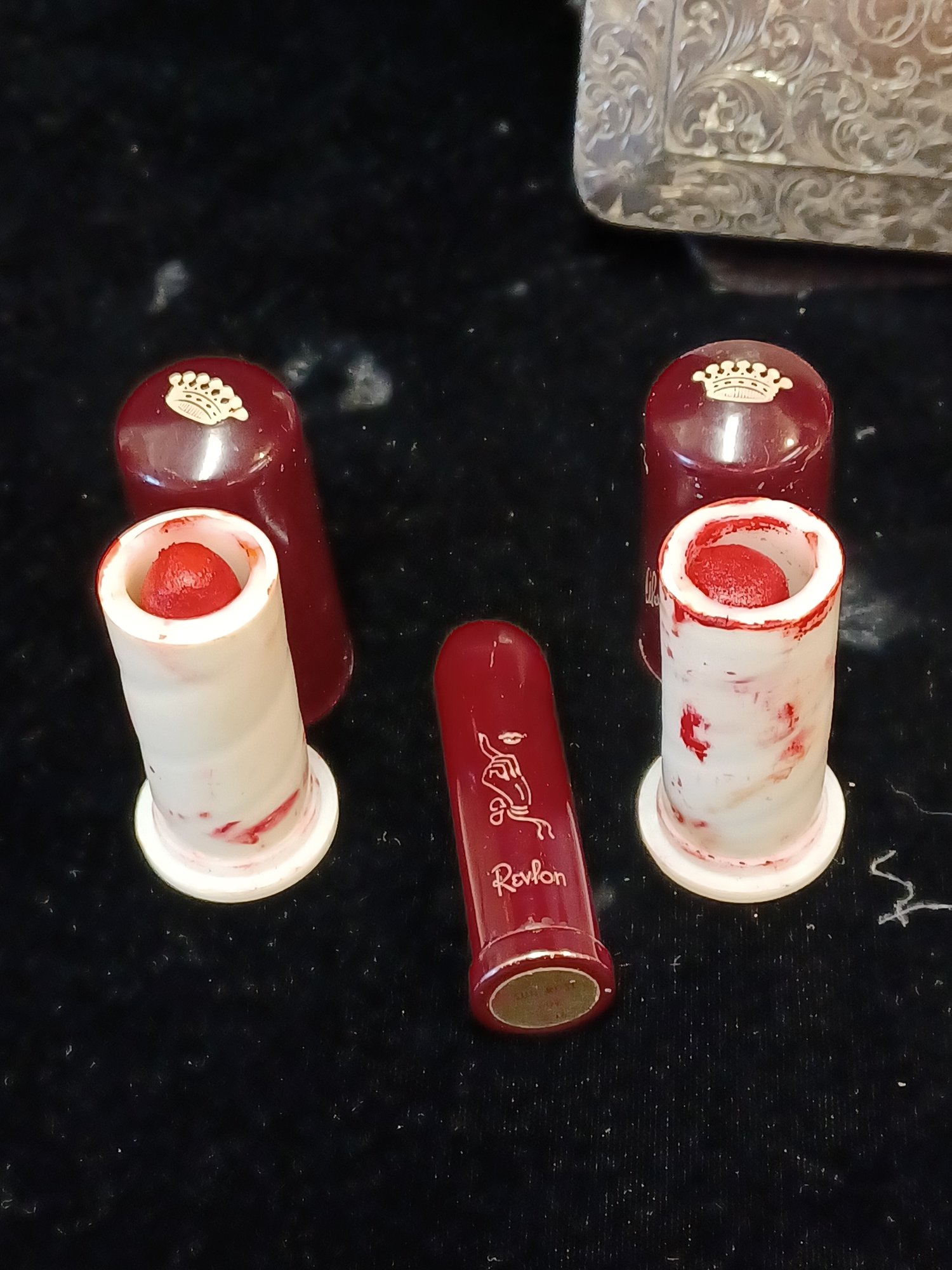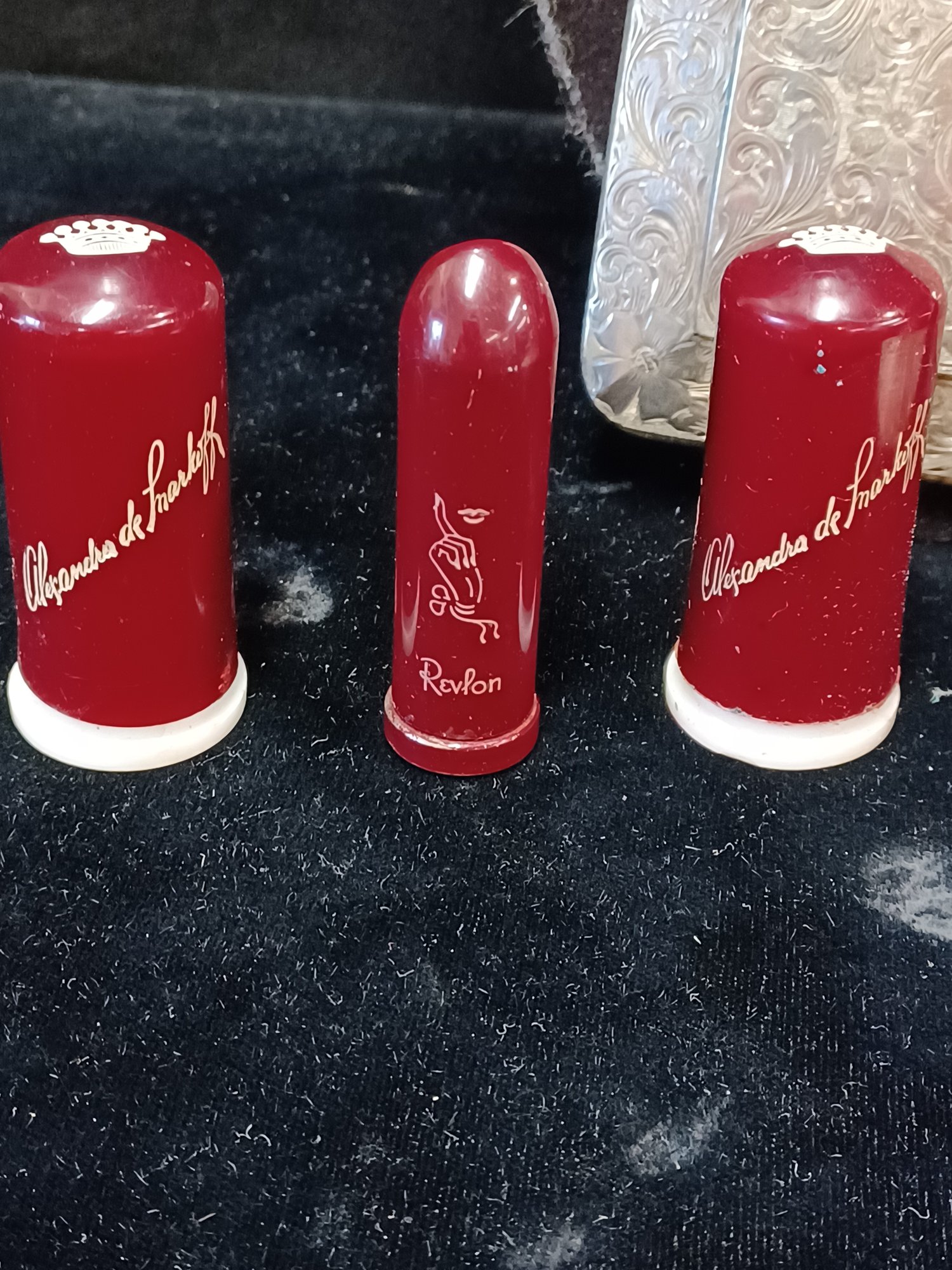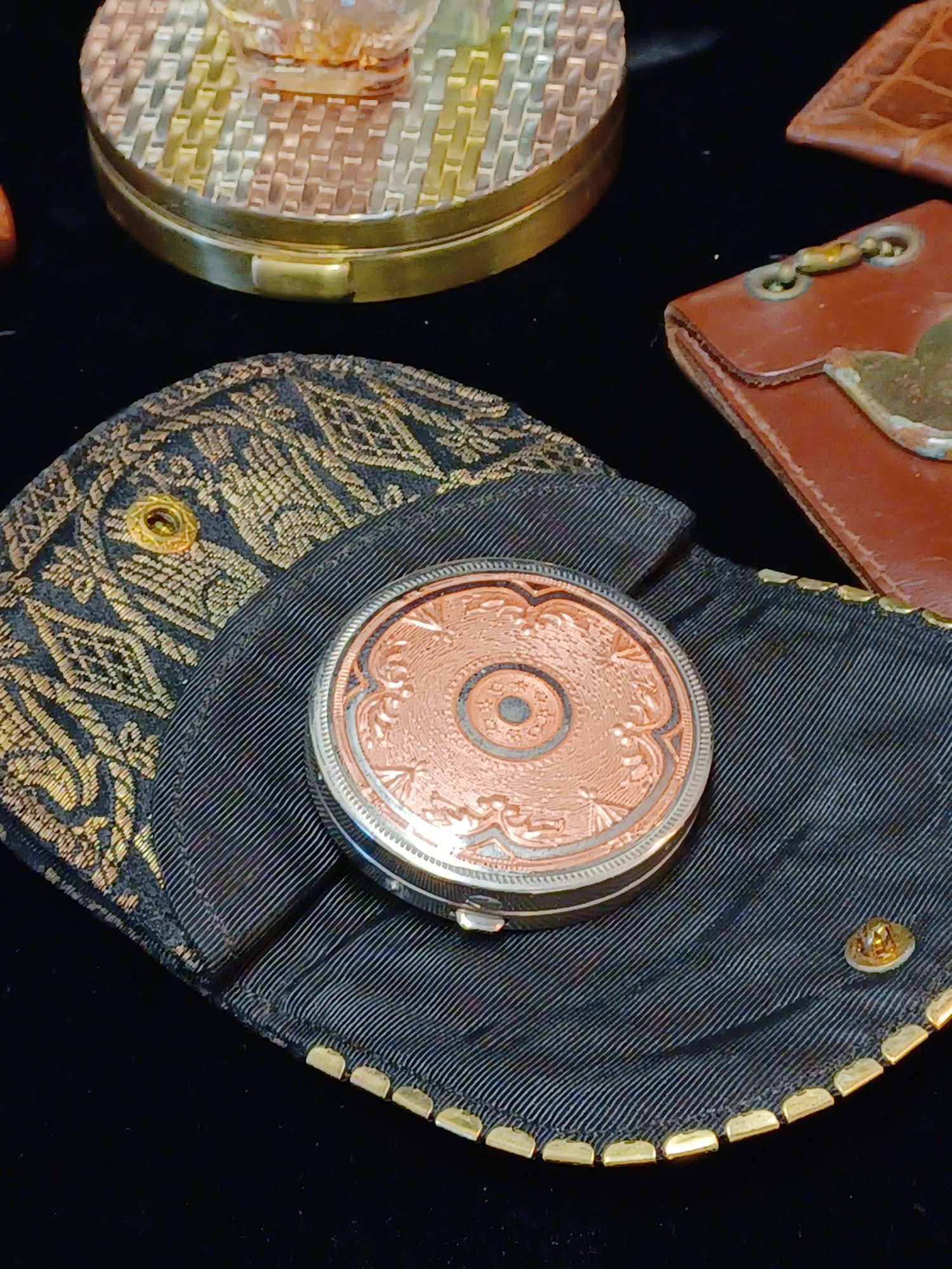 *Antique Sterling compact w/ chain; 2 other round, vintage, compacts; 2 small perfume bottles [Duchess of York & Made in France]; 2 vintage quill pens [1 is Watermans]; New, portable, shoe horn; 3 lipsticks:[2 Alexandra de Markoff & 1 Revlon]; an eyelash makeup container - Max Factor; and a cloth coin purse; 1 metal note pad *no pen; 2 empty leather holders for keys(?) and comb. 16 pieces total