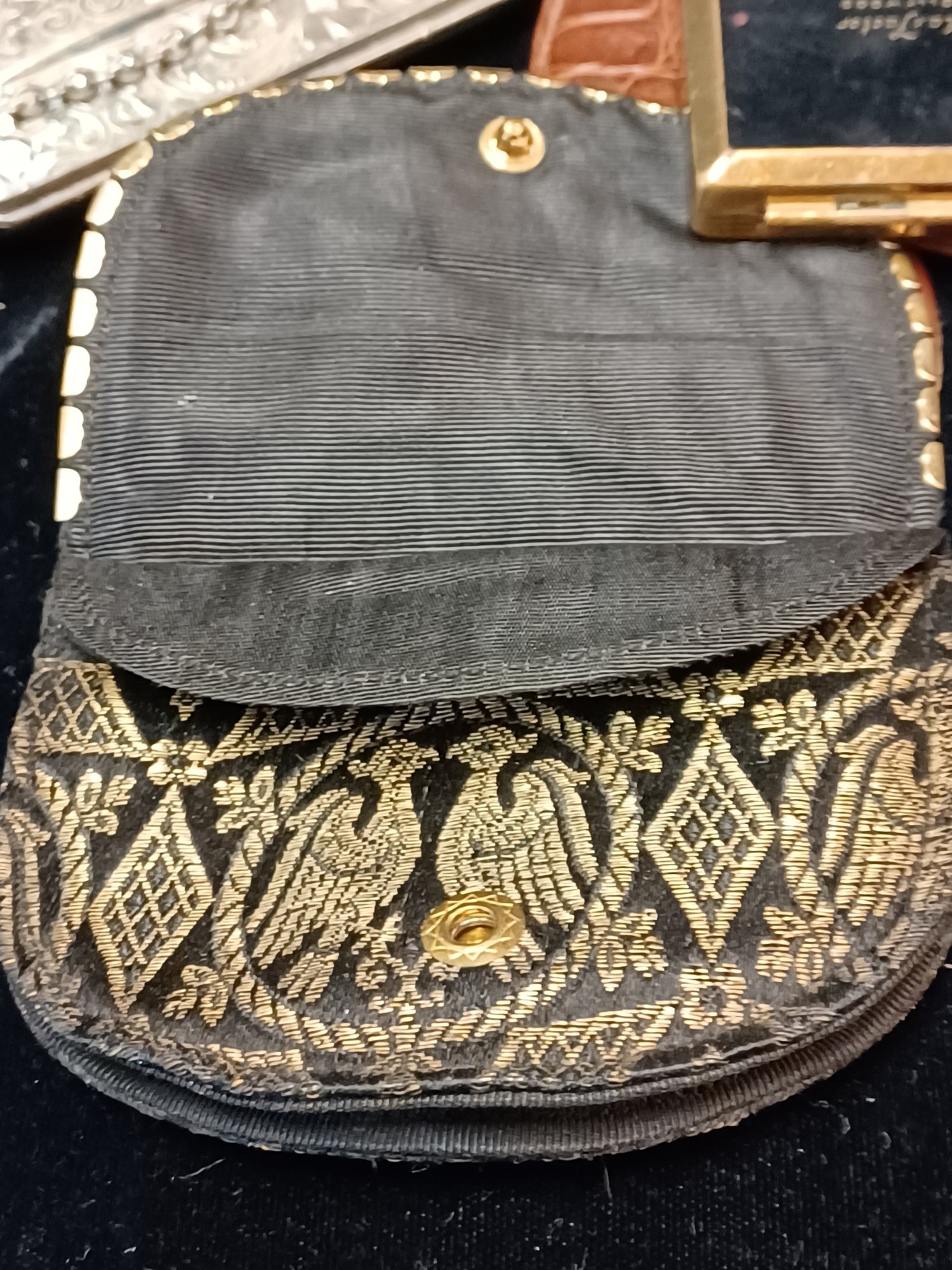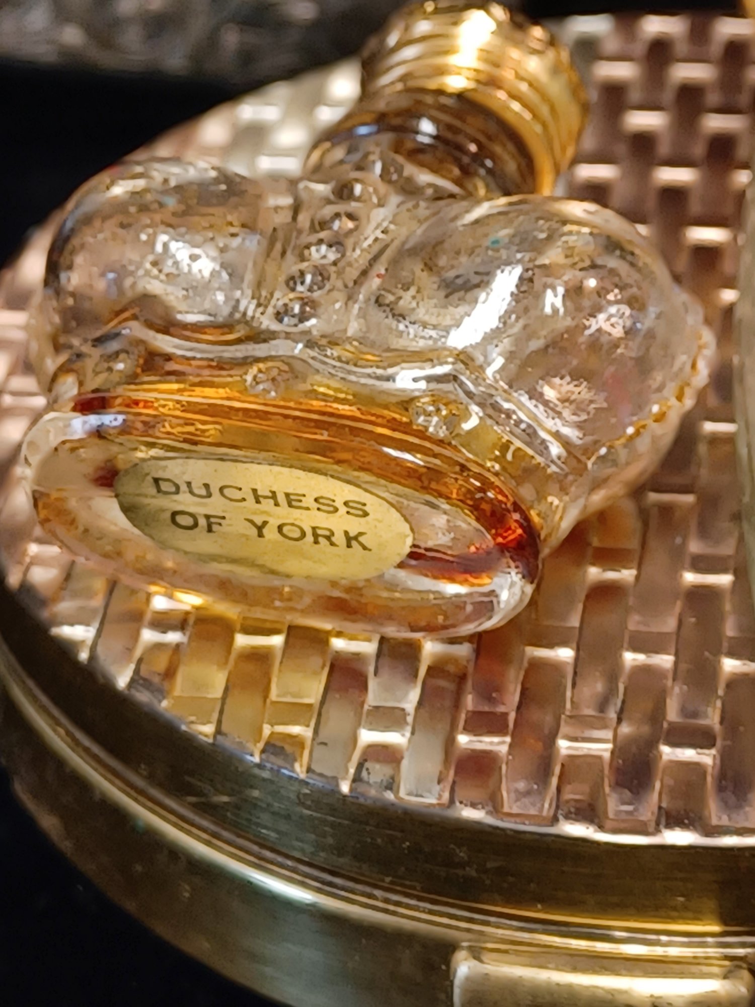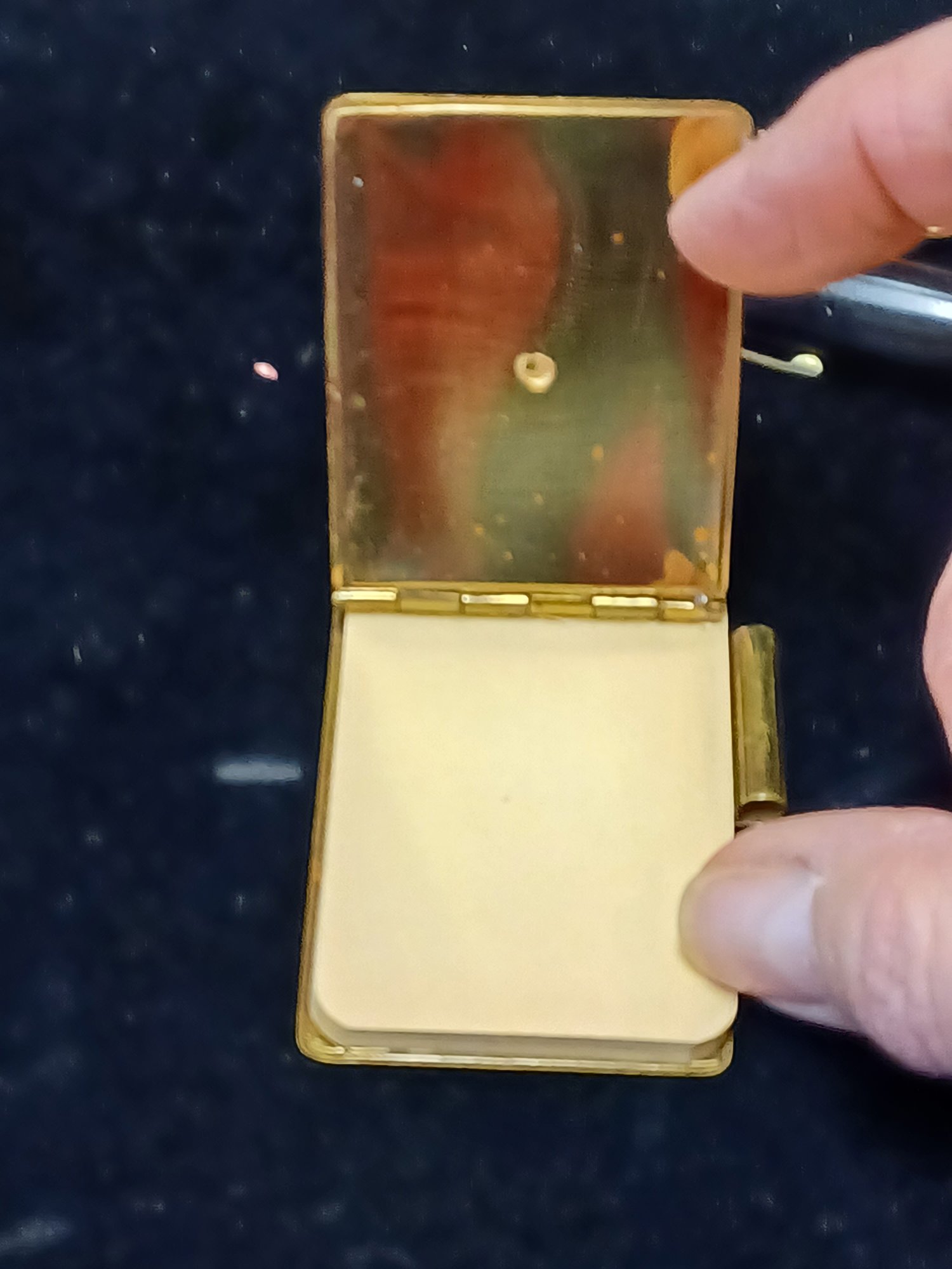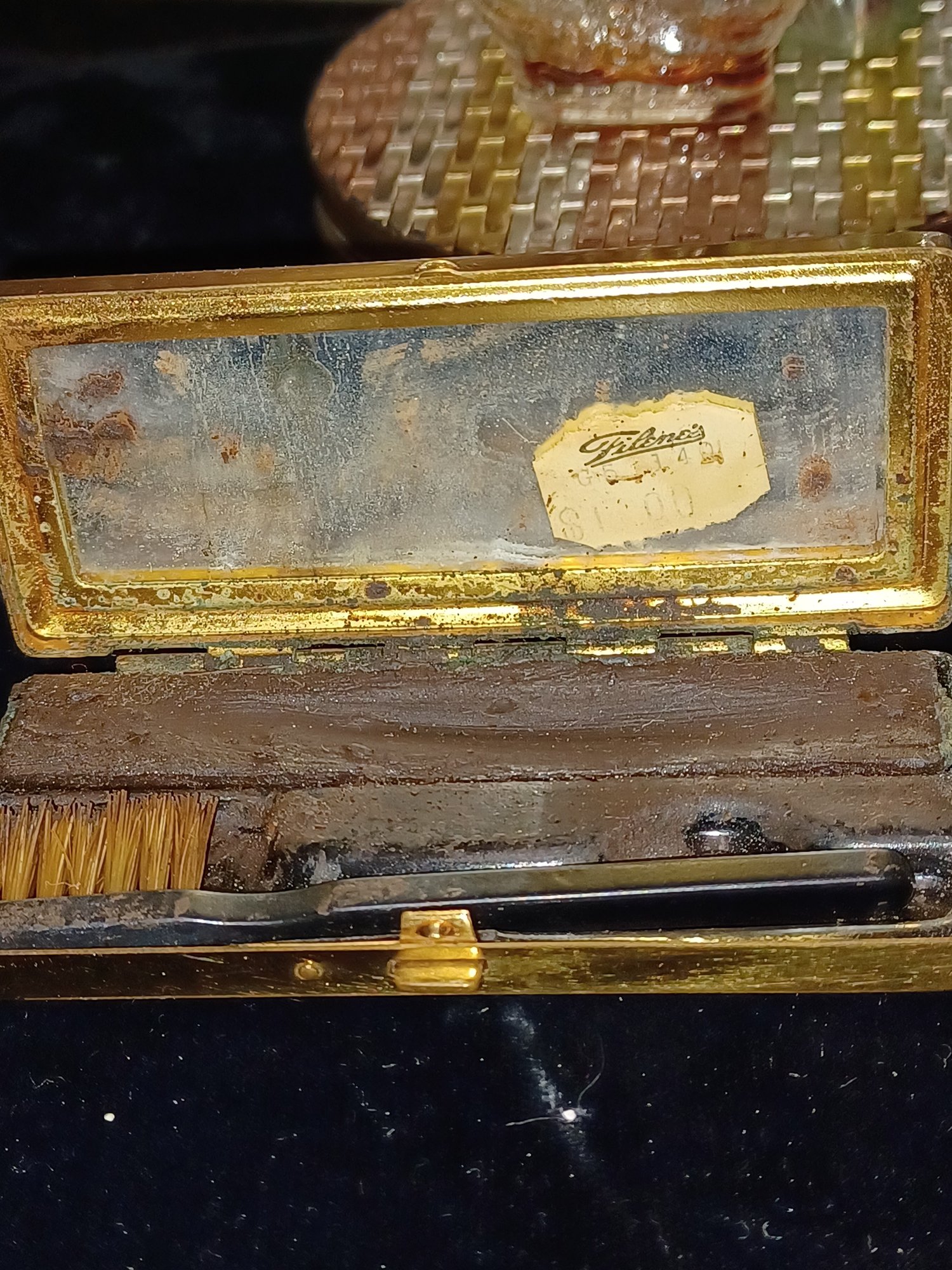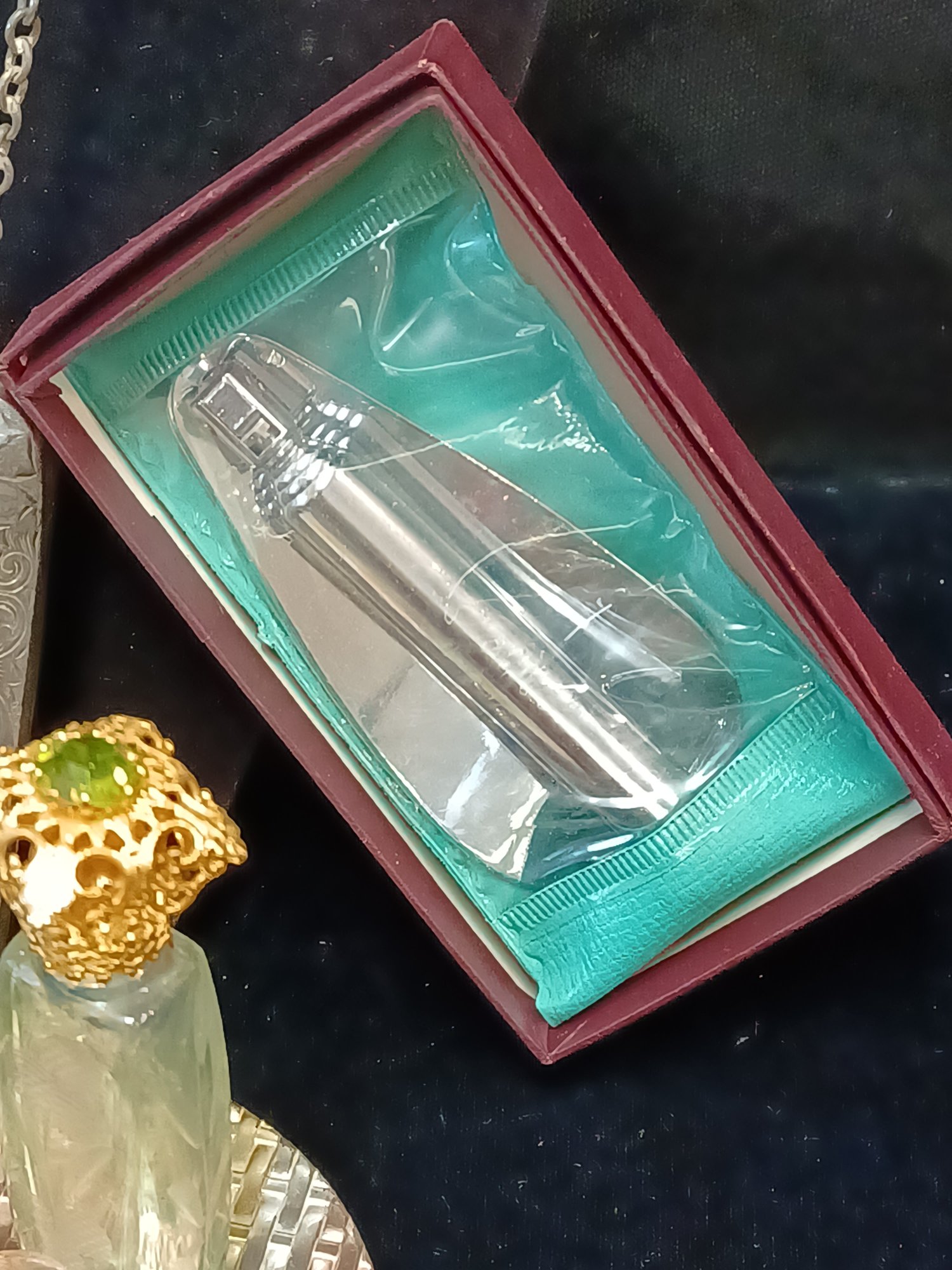 *Antique Sterling compact w/ chain; 2 other round, vintage, compacts; 2 small perfume bottles [Duchess of York & Made in France]; 2 vintage quill pens [1 is Watermans]; New, portable, shoe horn; 3 lipsticks:[2 Alexandra de Markoff & 1 Revlon]; an eyelash makeup container - Max Factor; and a cloth coin purse; 1 metal note pad *no pen; 2 empty leather holders for keys(?) and comb. 16 pieces total