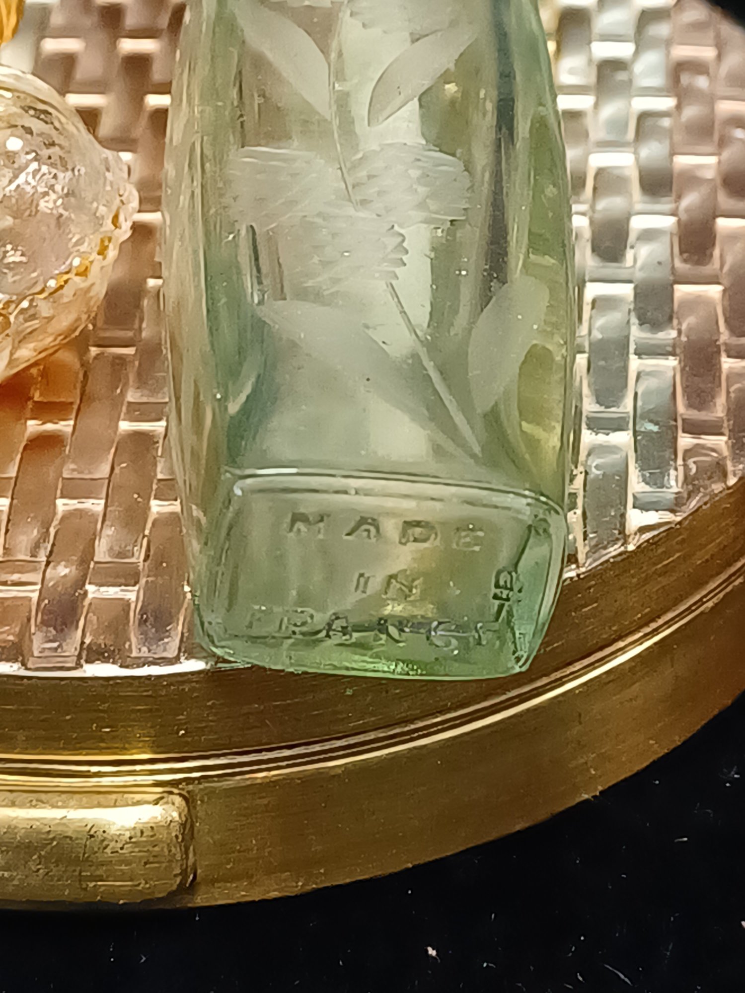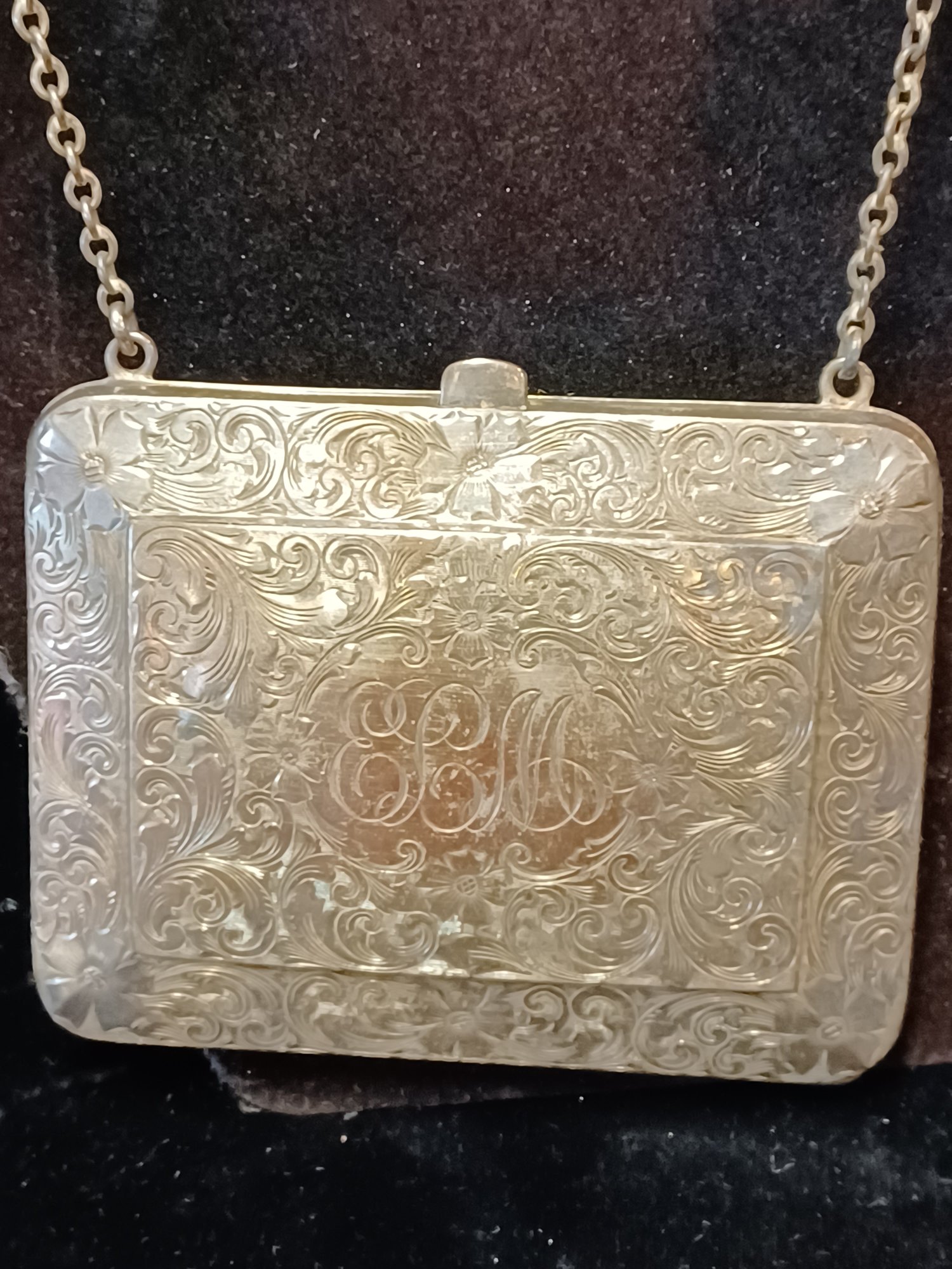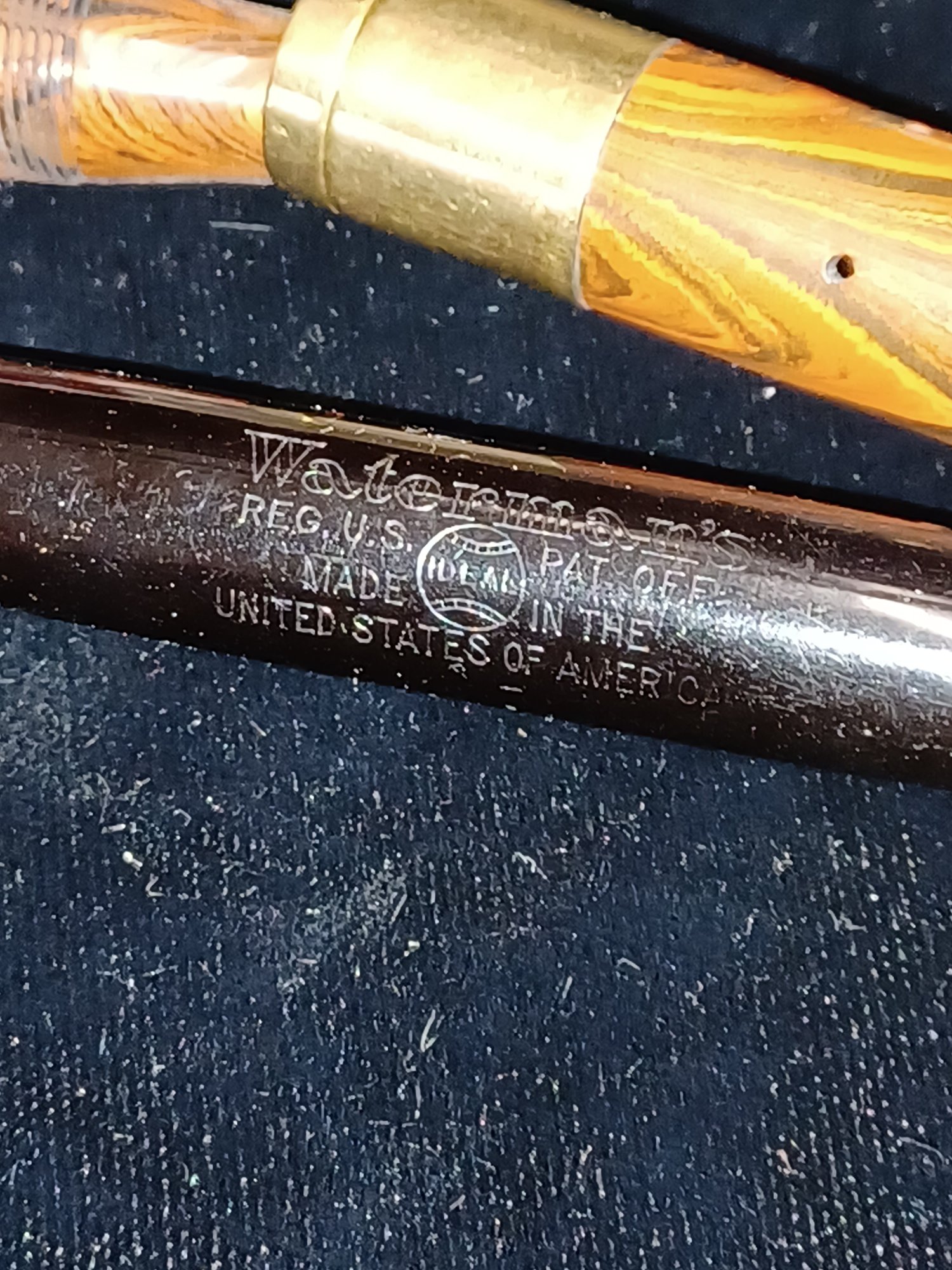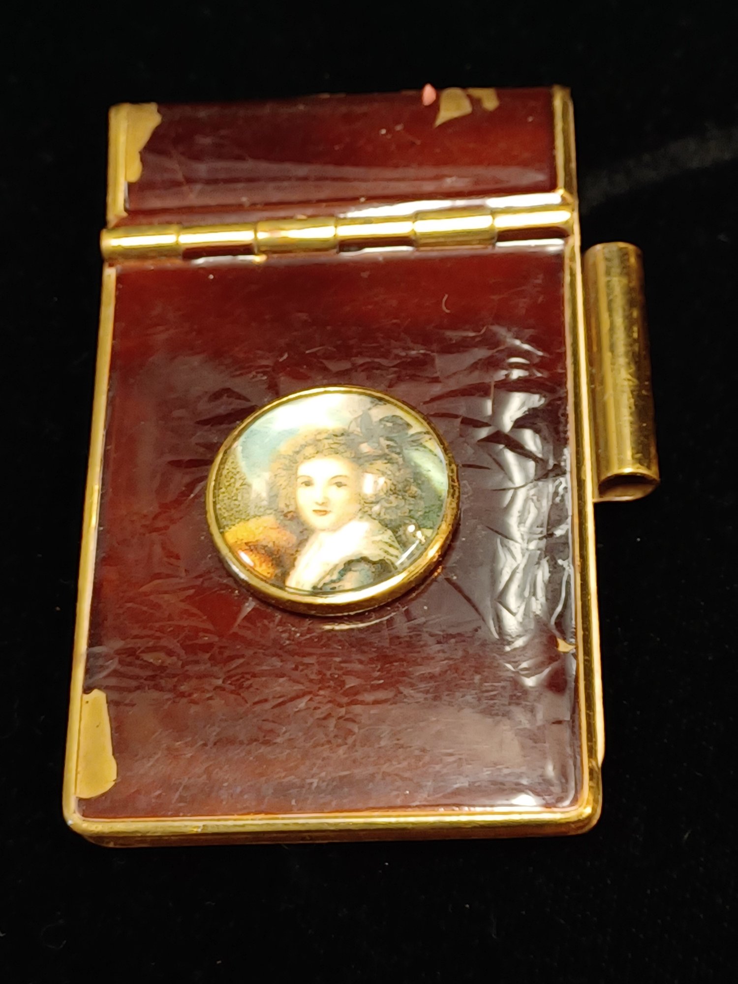 *Antique Sterling compact w/ chain; 2 other round, vintage, compacts; 2 small perfume bottles [Duchess of York & Made in France]; 2 vintage quill pens [1 is Watermans]; New, portable, shoe horn; 3 lipsticks:[2 Alexandra de Markoff & 1 Revlon]; an eyelash makeup container - Max Factor; and a cloth coin purse; 1 metal note pad *no pen; 2 empty leather holders for keys(?) and comb. 16 pieces total