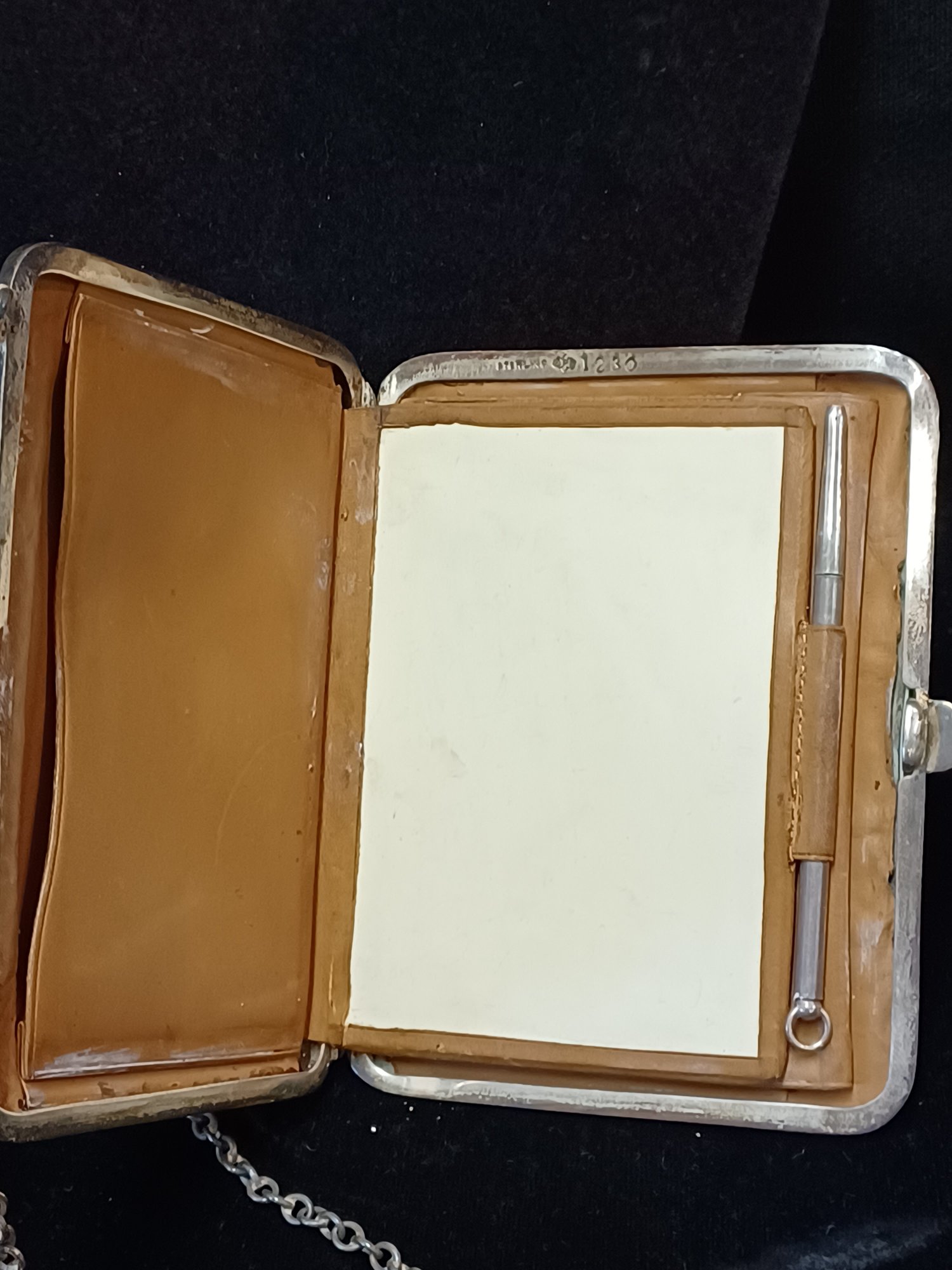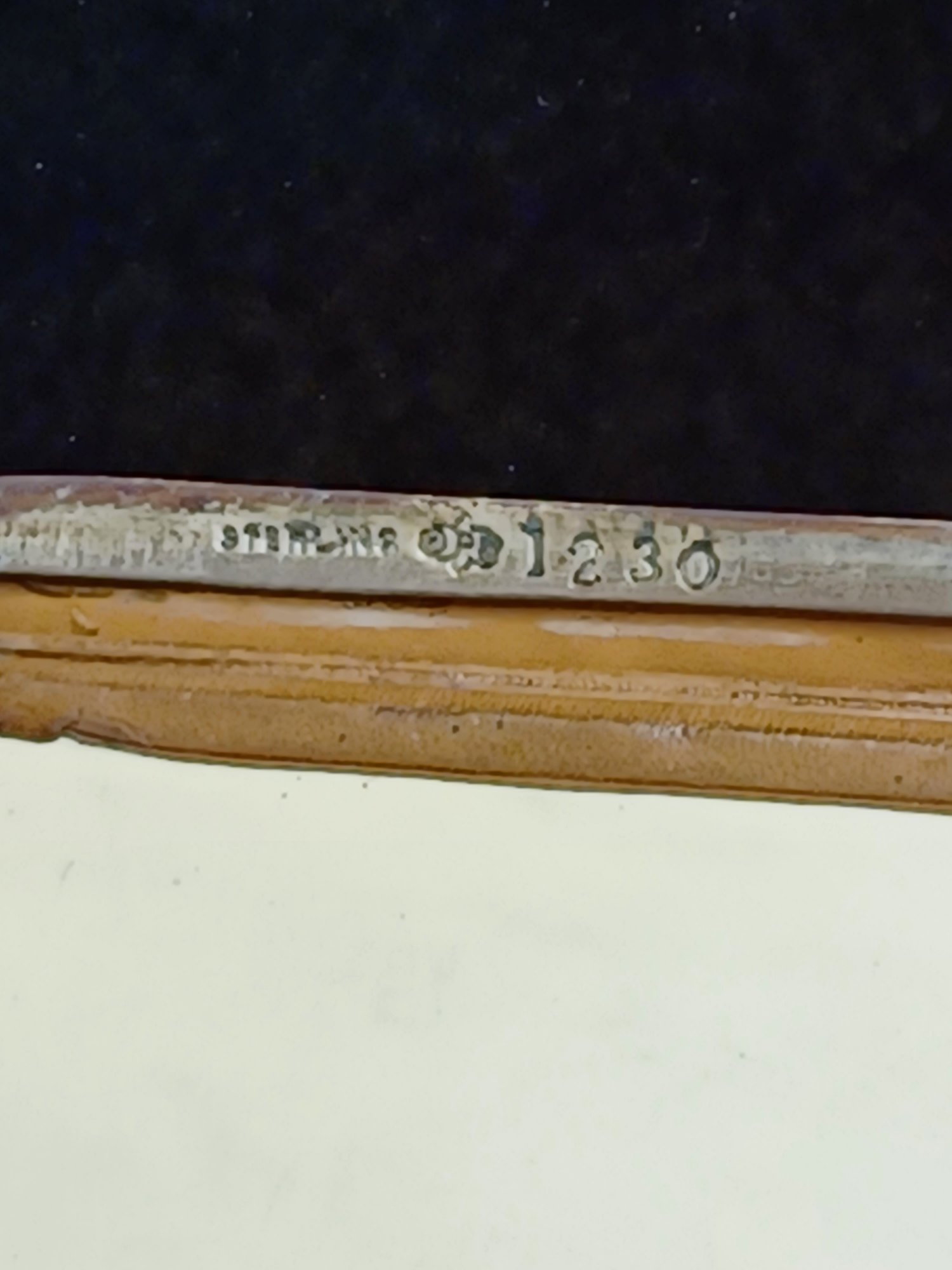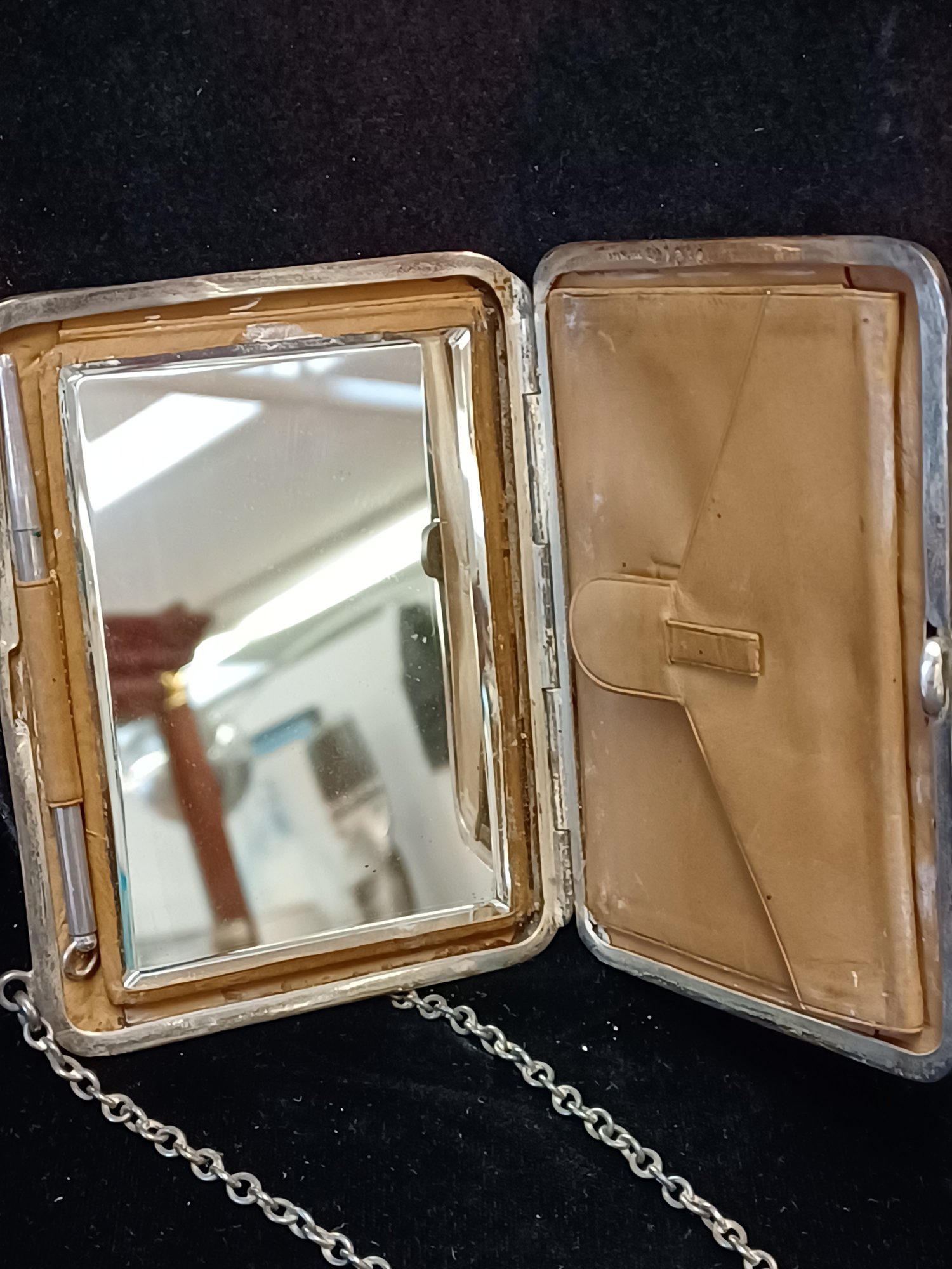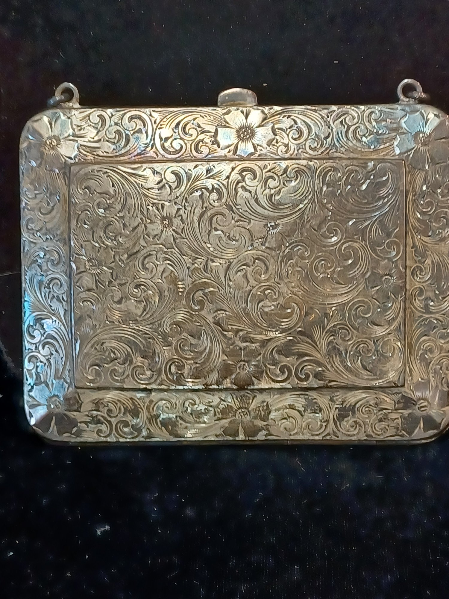 *Antique Sterling compact w/ chain; 2 other round, vintage, compacts; 2 small perfume bottles [Duchess of York & Made in France]; 2 vintage quill pens [1 is Watermans]; New, portable, shoe horn; 3 lipsticks:[2 Alexandra de Markoff & 1 Revlon]; an eyelash makeup container - Max Factor; and a cloth coin purse; 1 metal note pad *no pen; 2 empty leather holders for keys(?) and comb. 16 pieces total