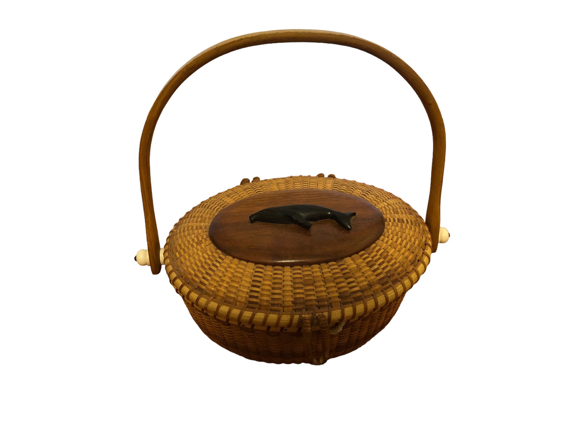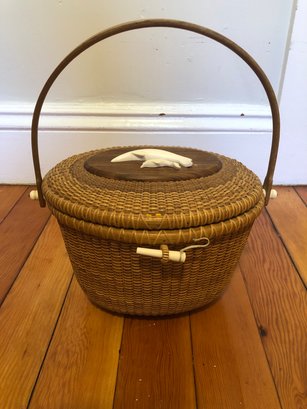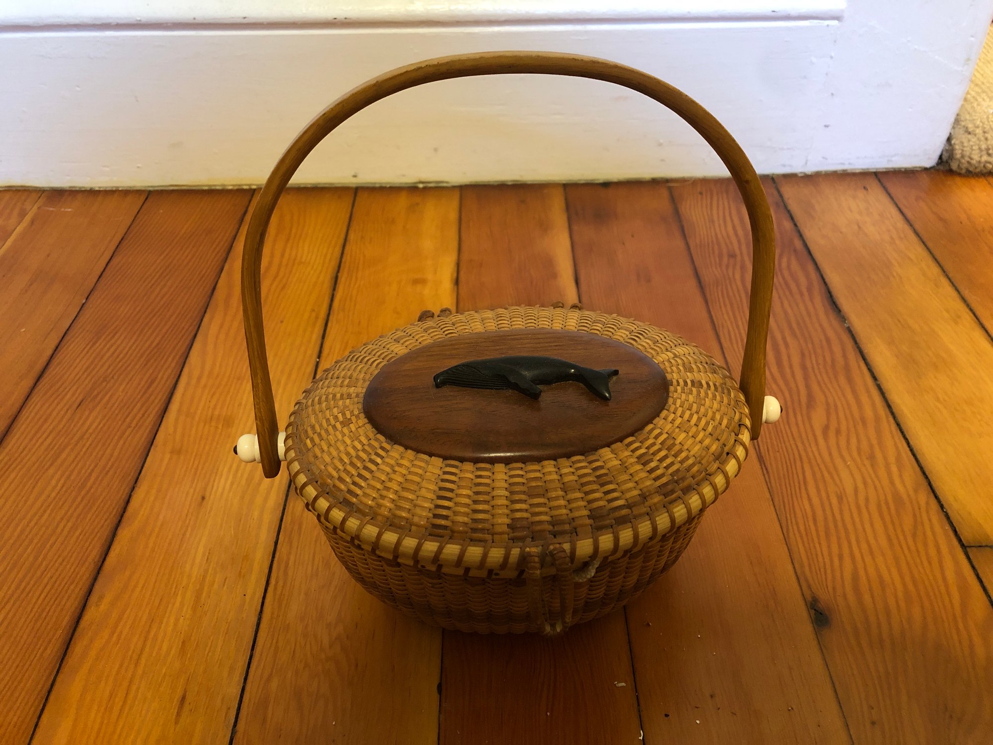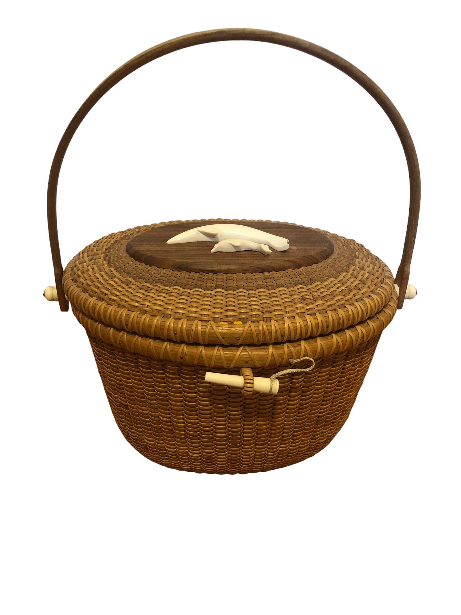 large woven basket w/ handle and white dolphins on cover, latch broken (8x7x10)