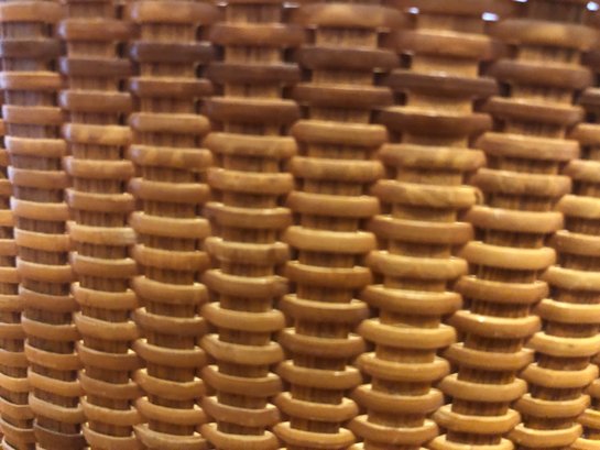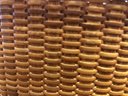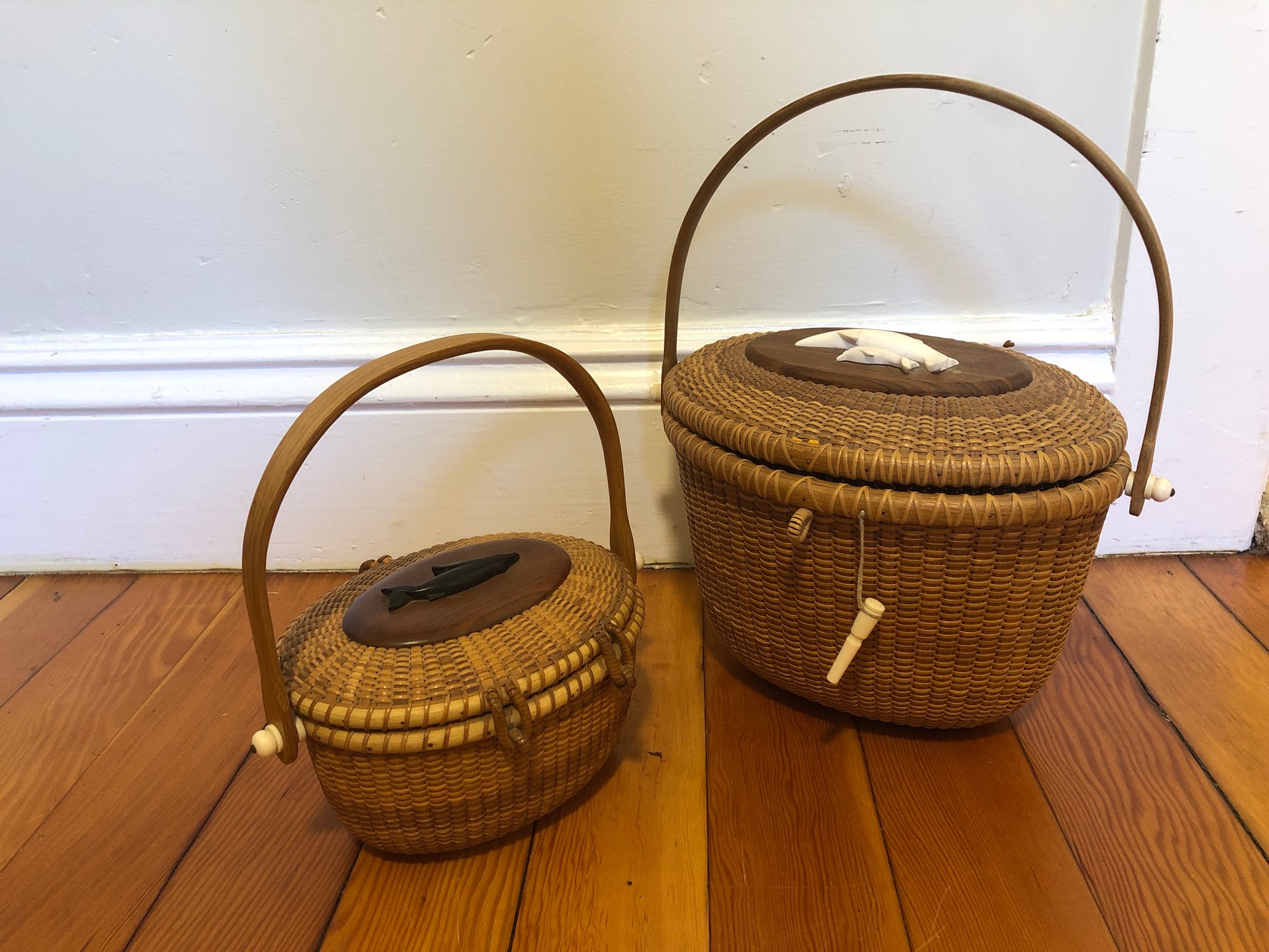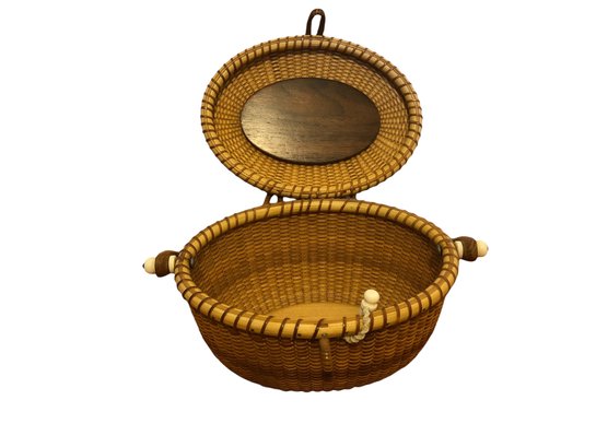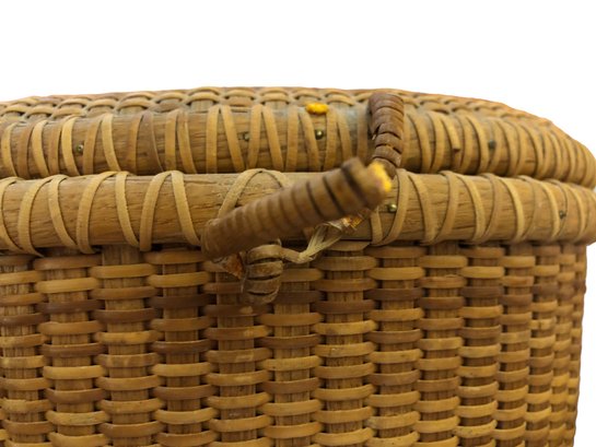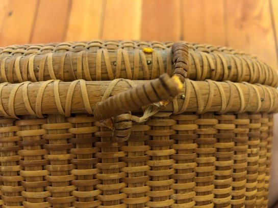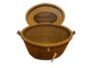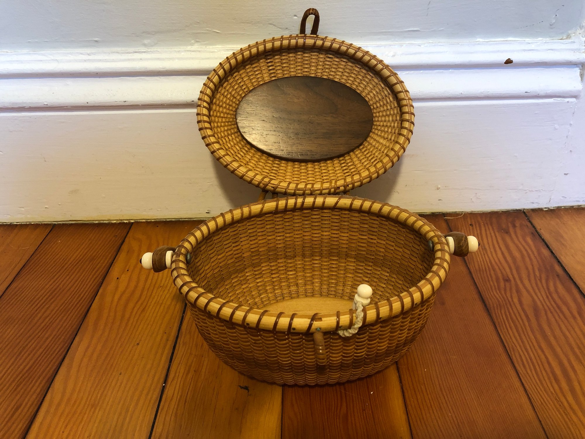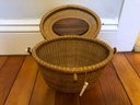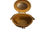 large woven basket w/ handle and white dolphins on cover, latch broken (8x7x10)