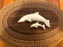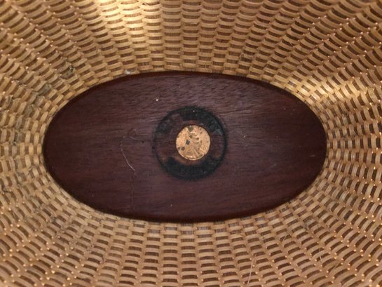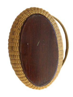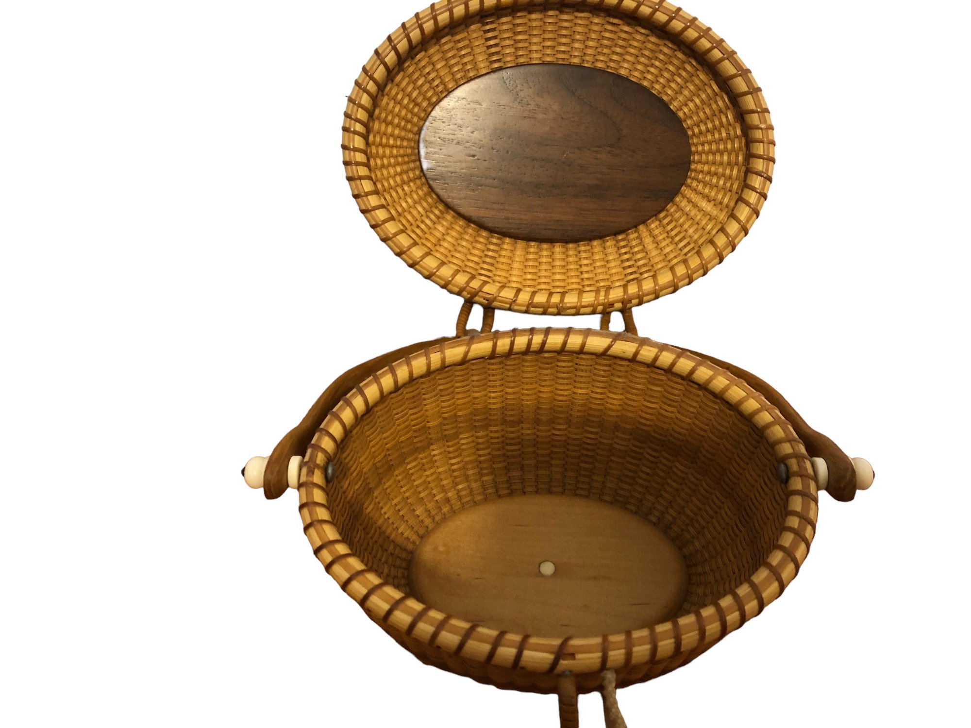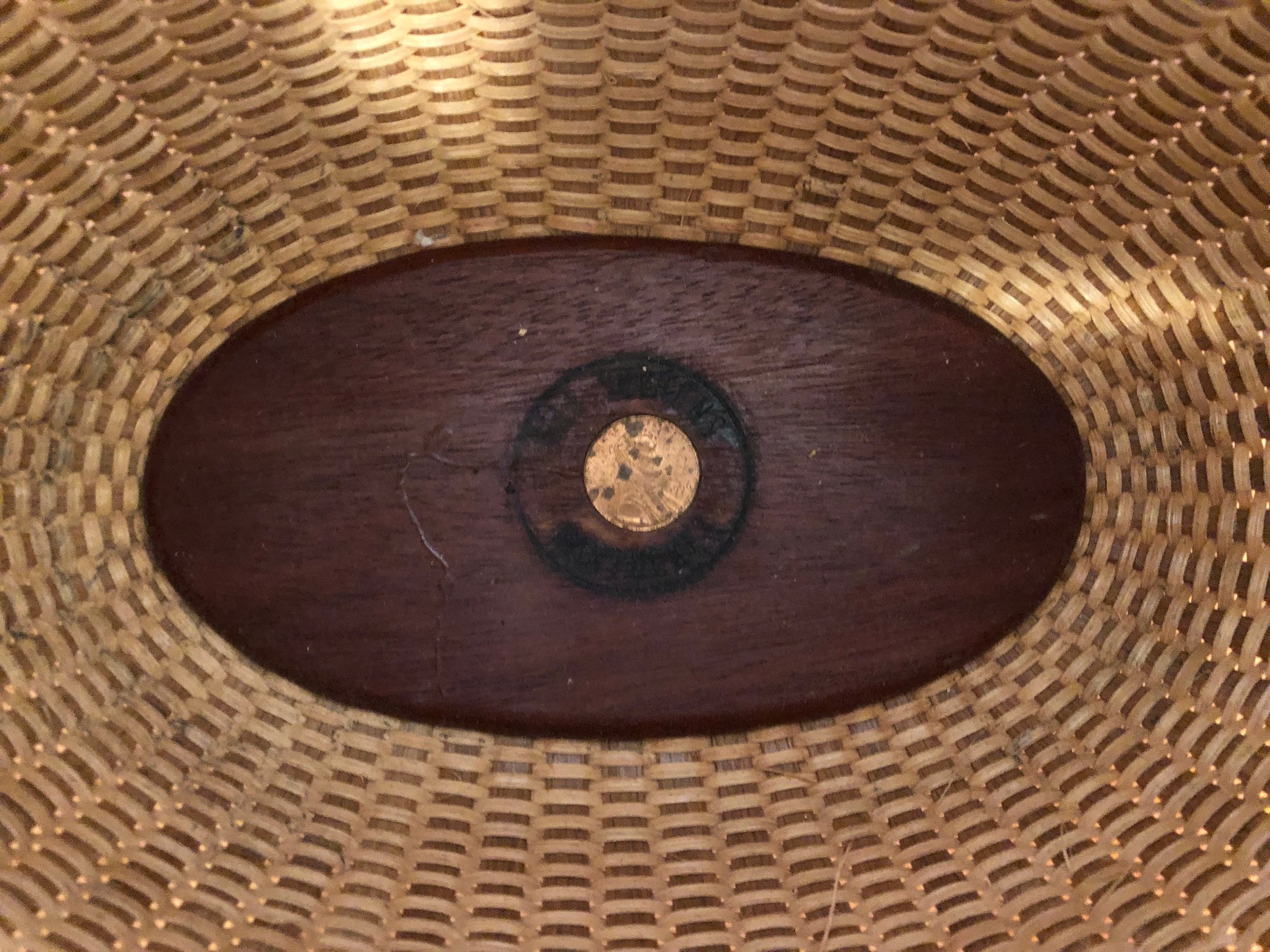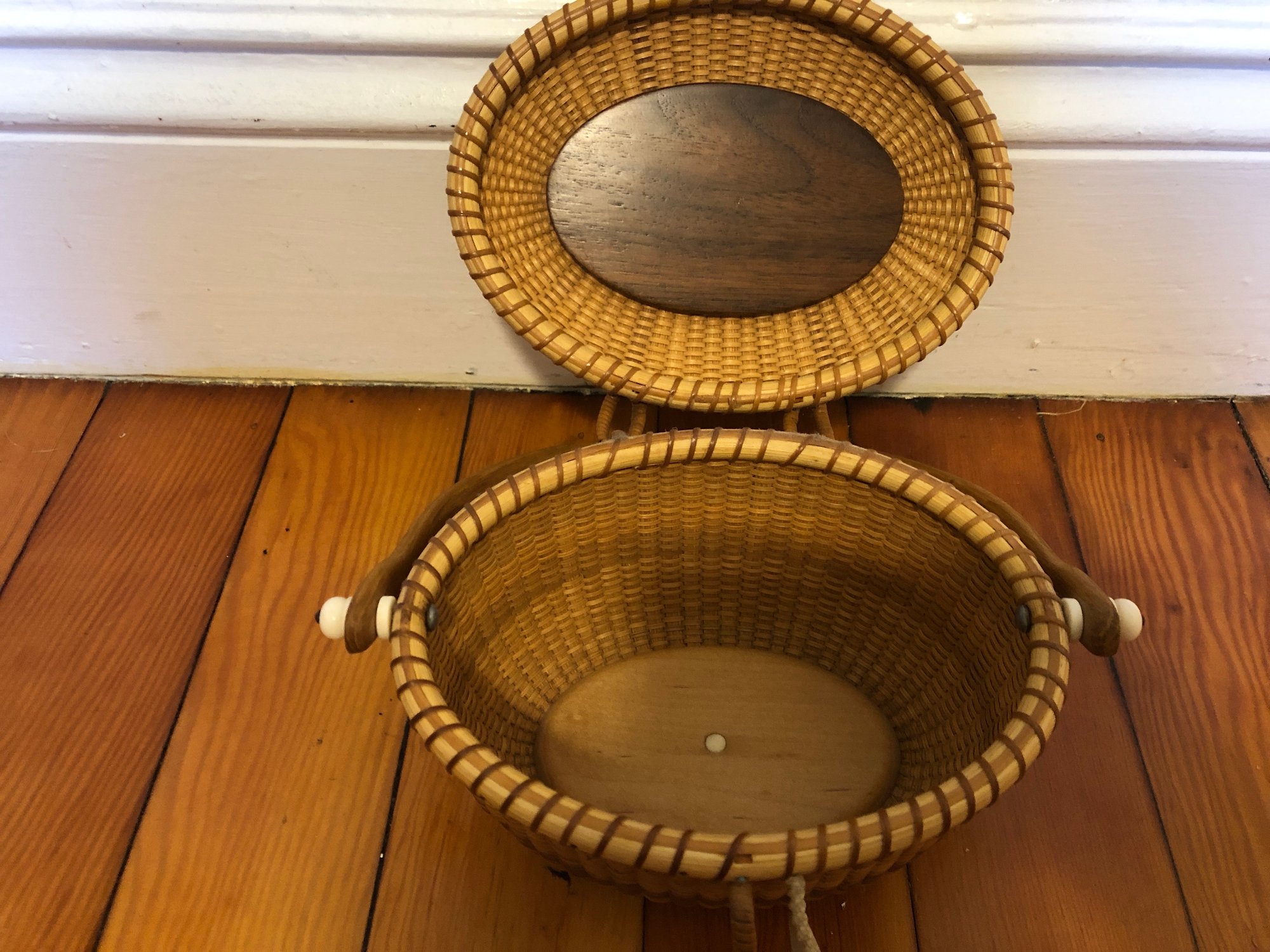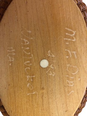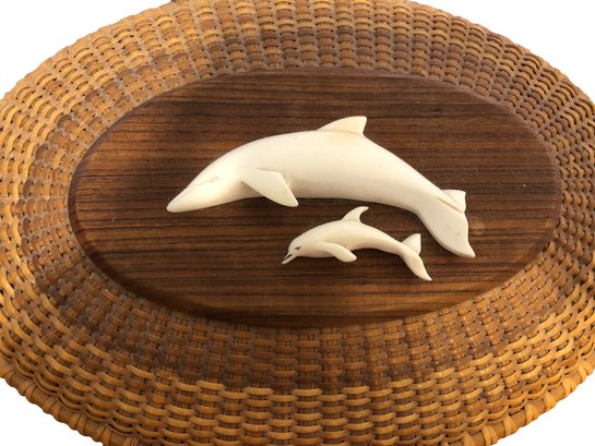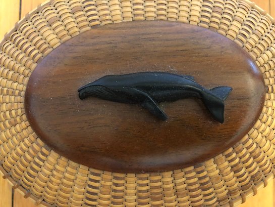 small woven basket with black dolphins signed by M.F. Dias 4/93 (4x6x9)