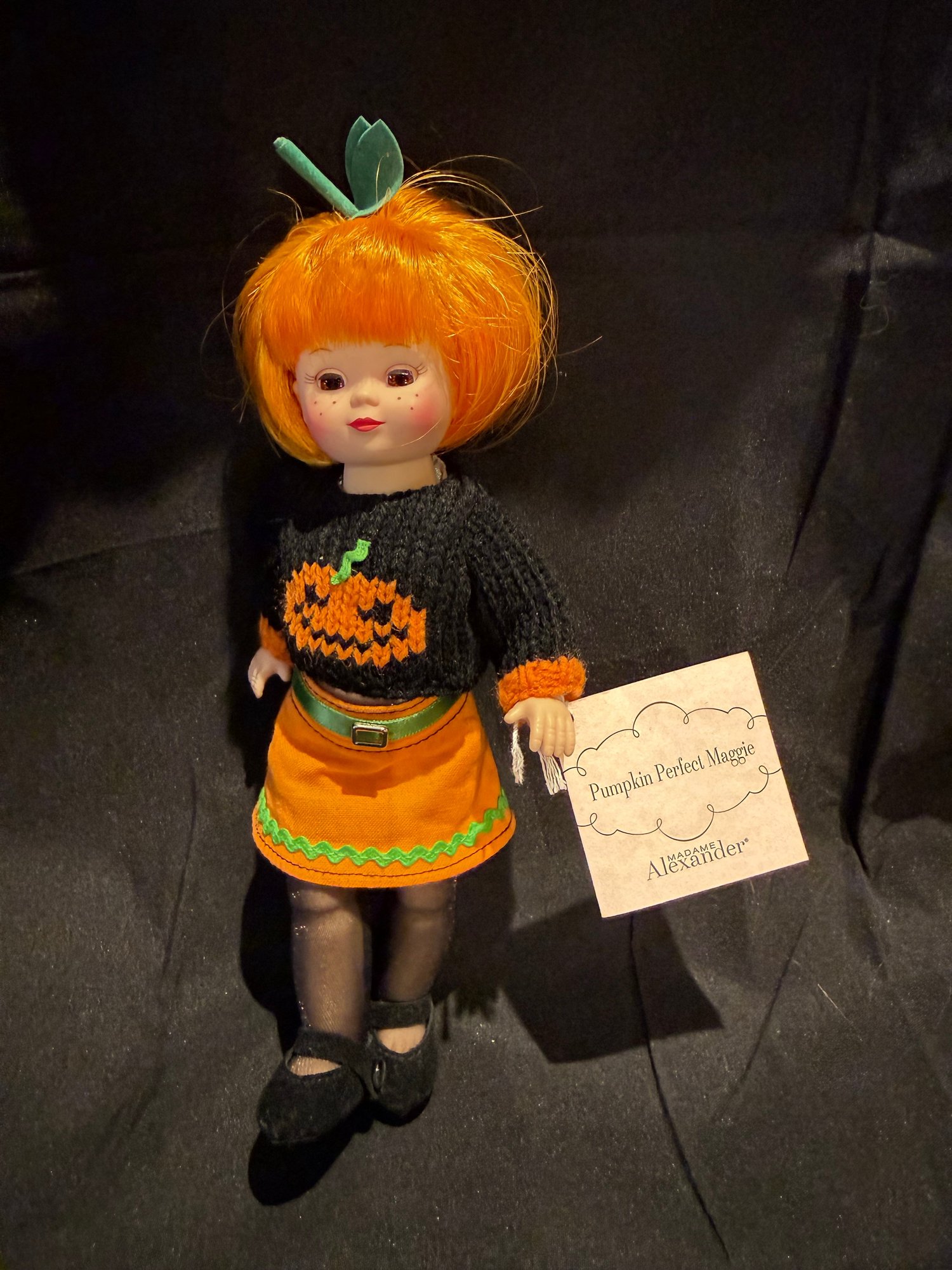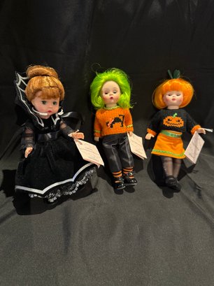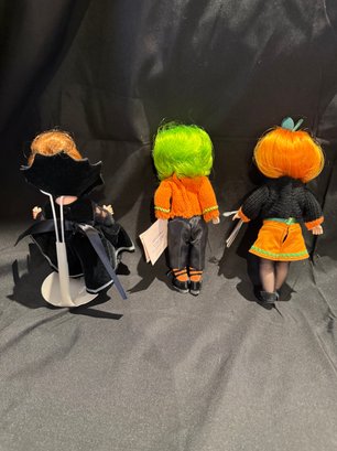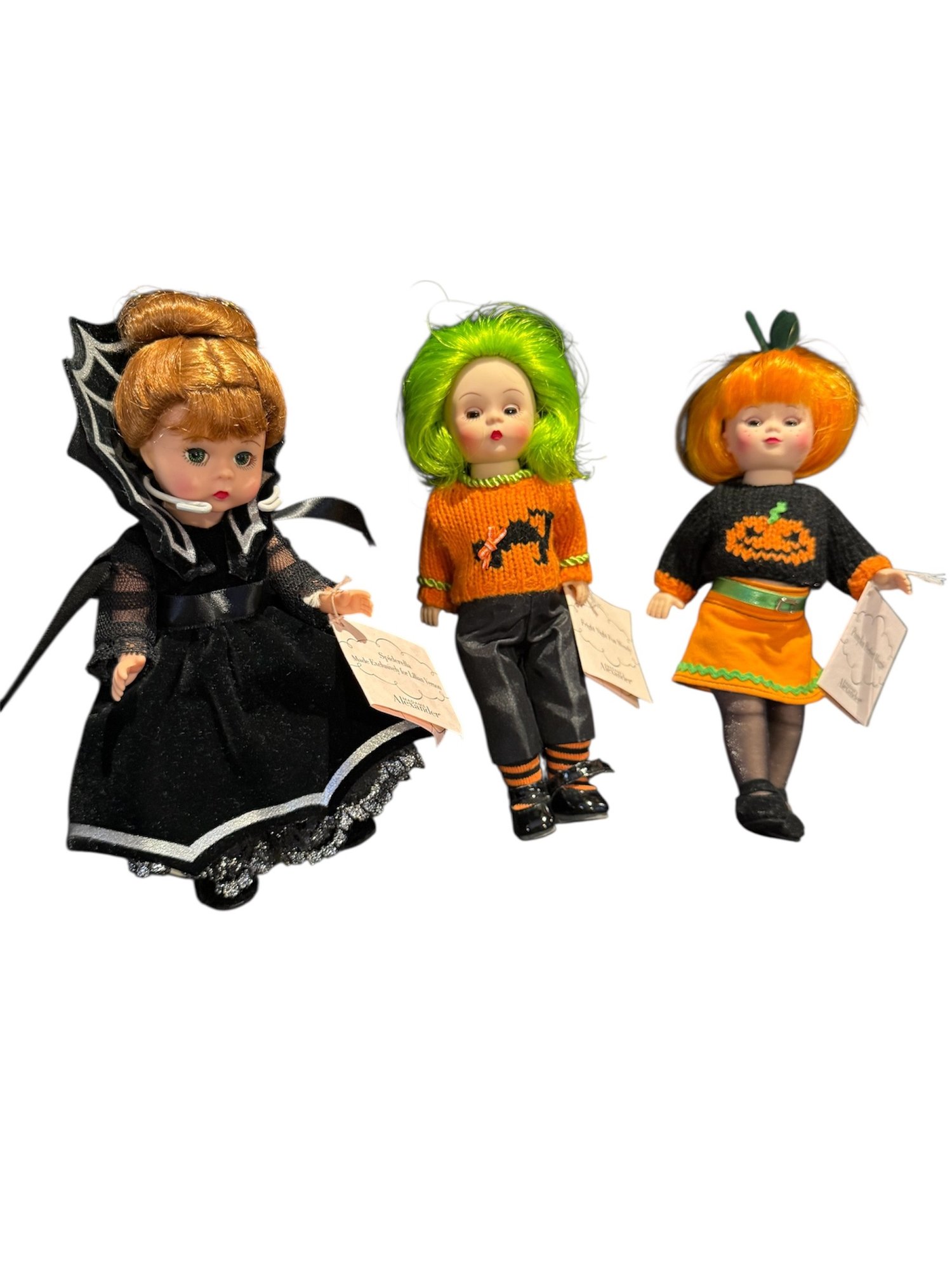 8” Pumpkin Perfect Maggie with original tag. 8” Fright Night Fun Wendy with original tag. 8” Spiderella with original tag and stand. All in original box.