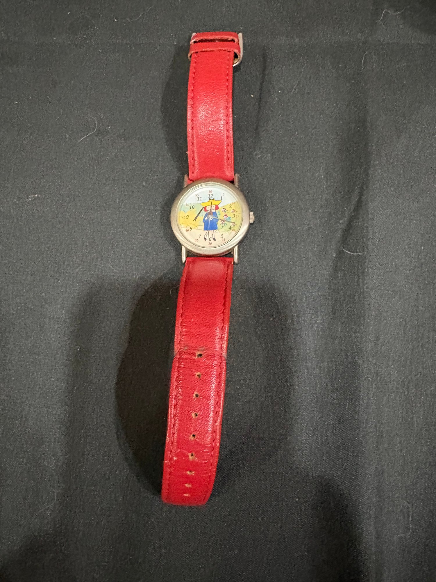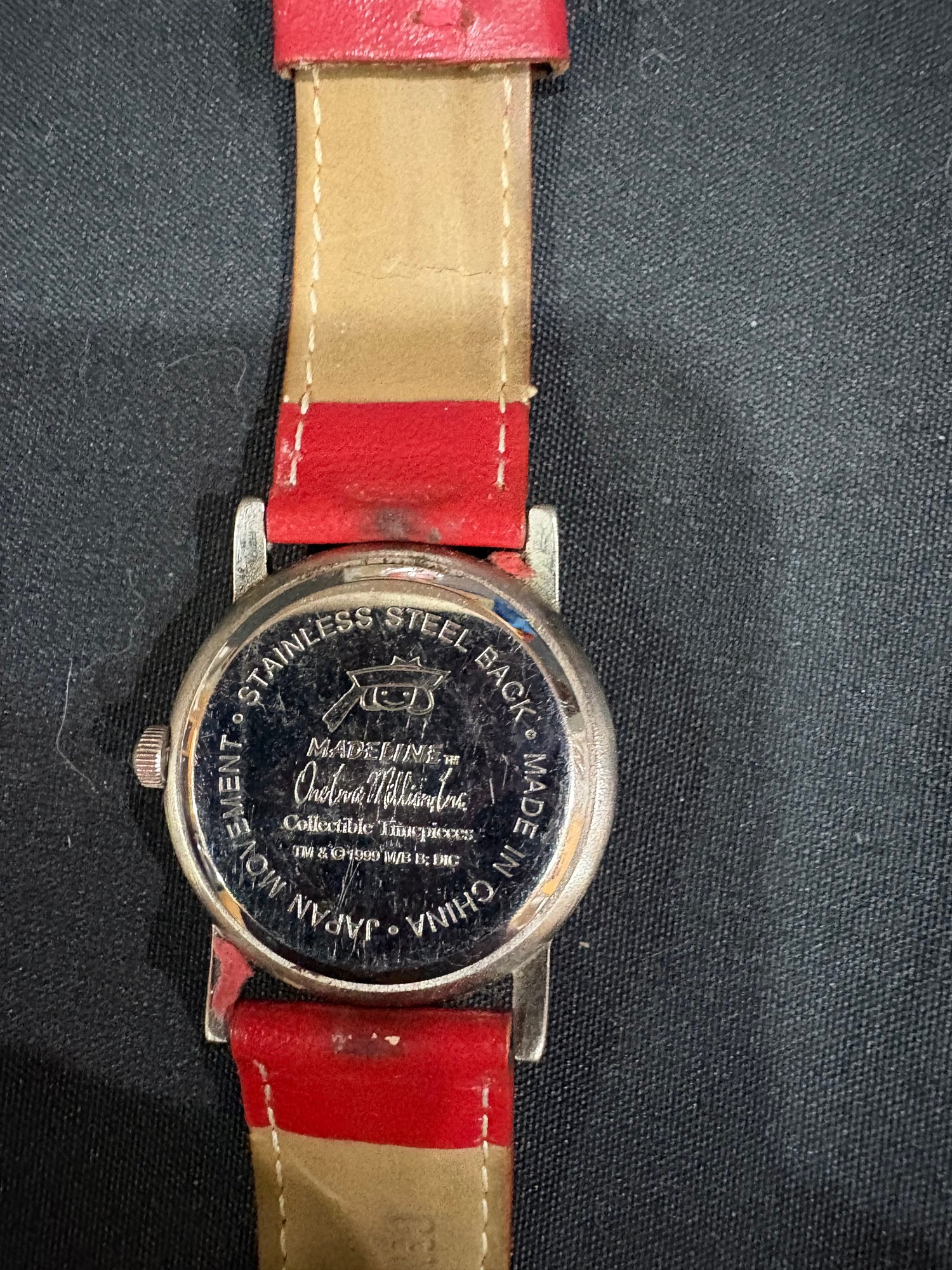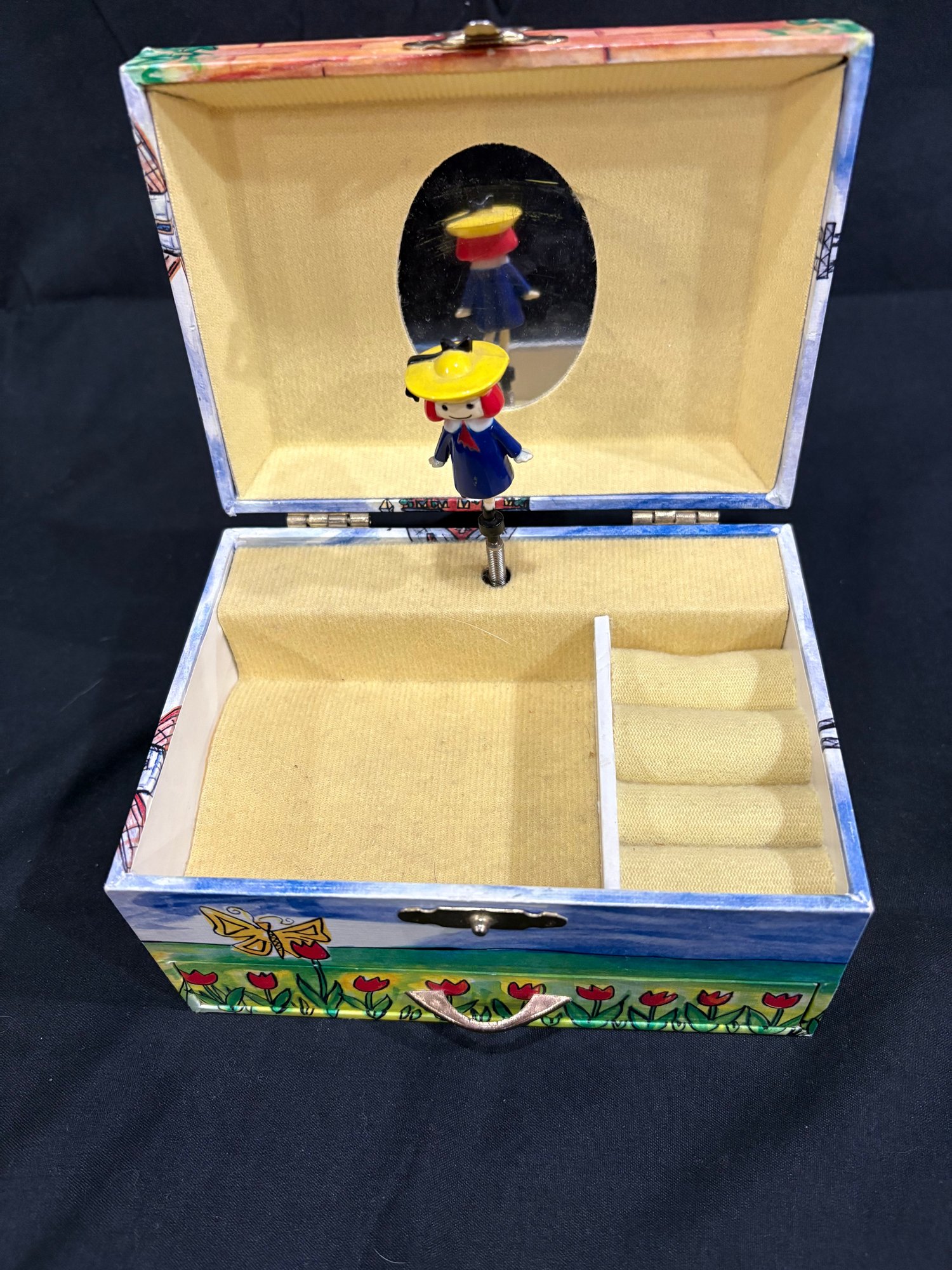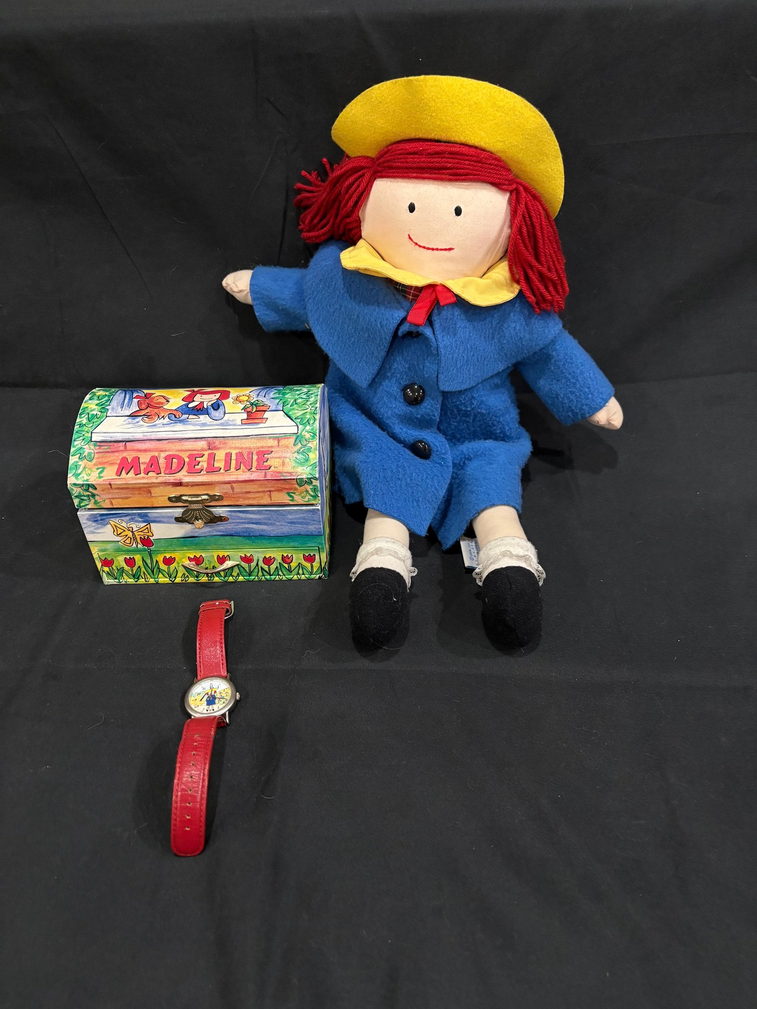 Madeline doll 14 in tall , music / jewelry box works 6 by 4 by4. Watch Japan movement. 7 in leather watch band made in china
