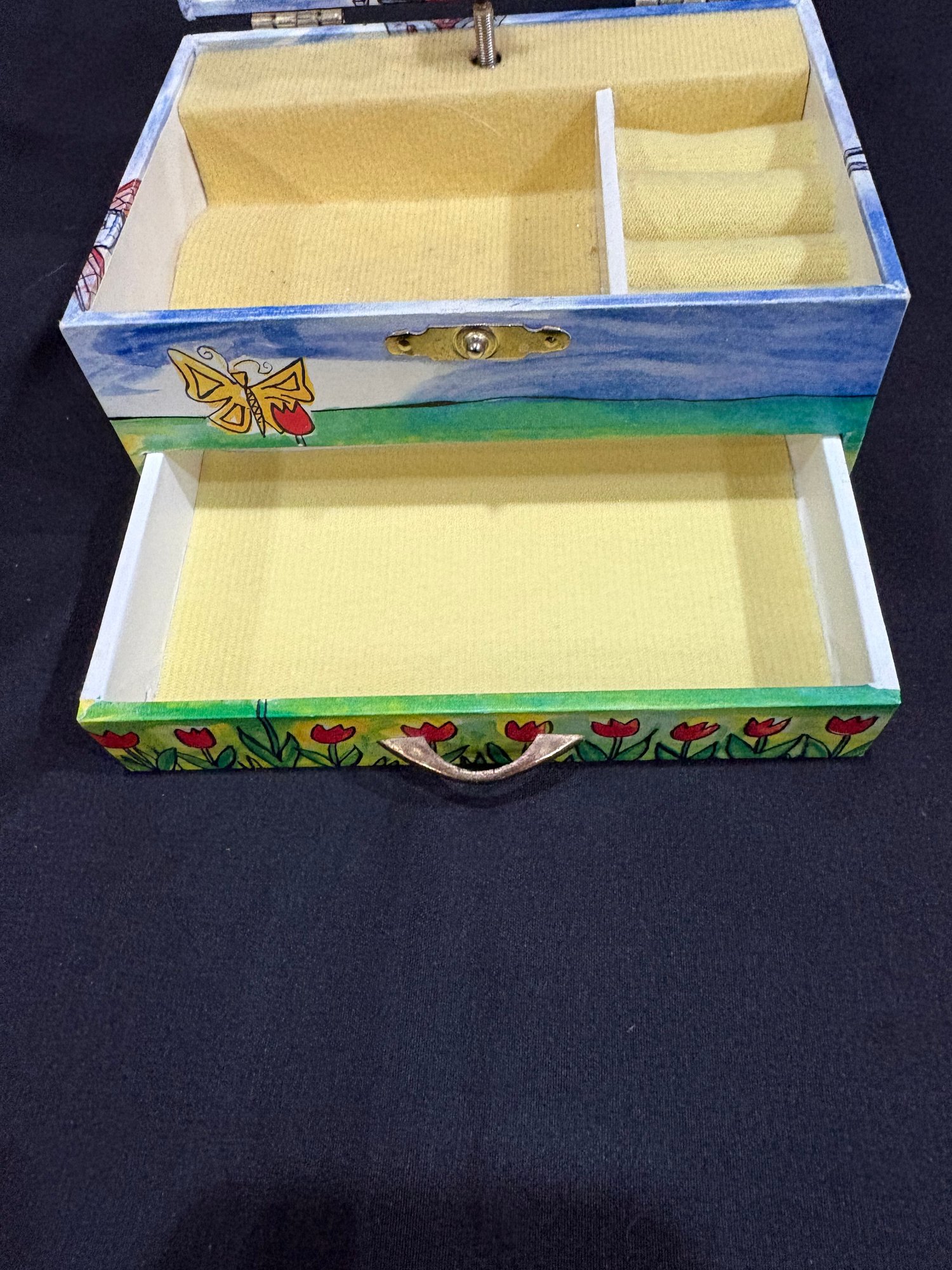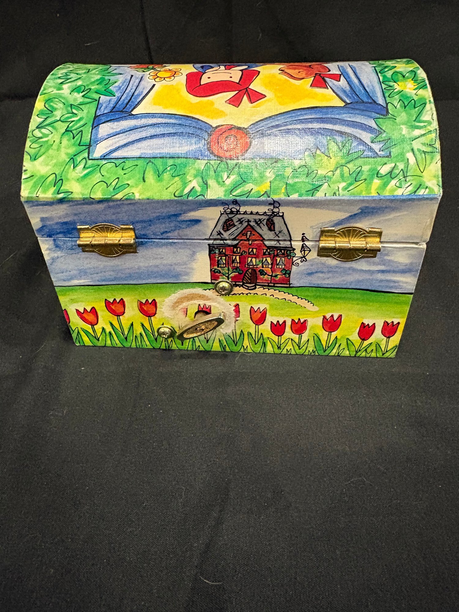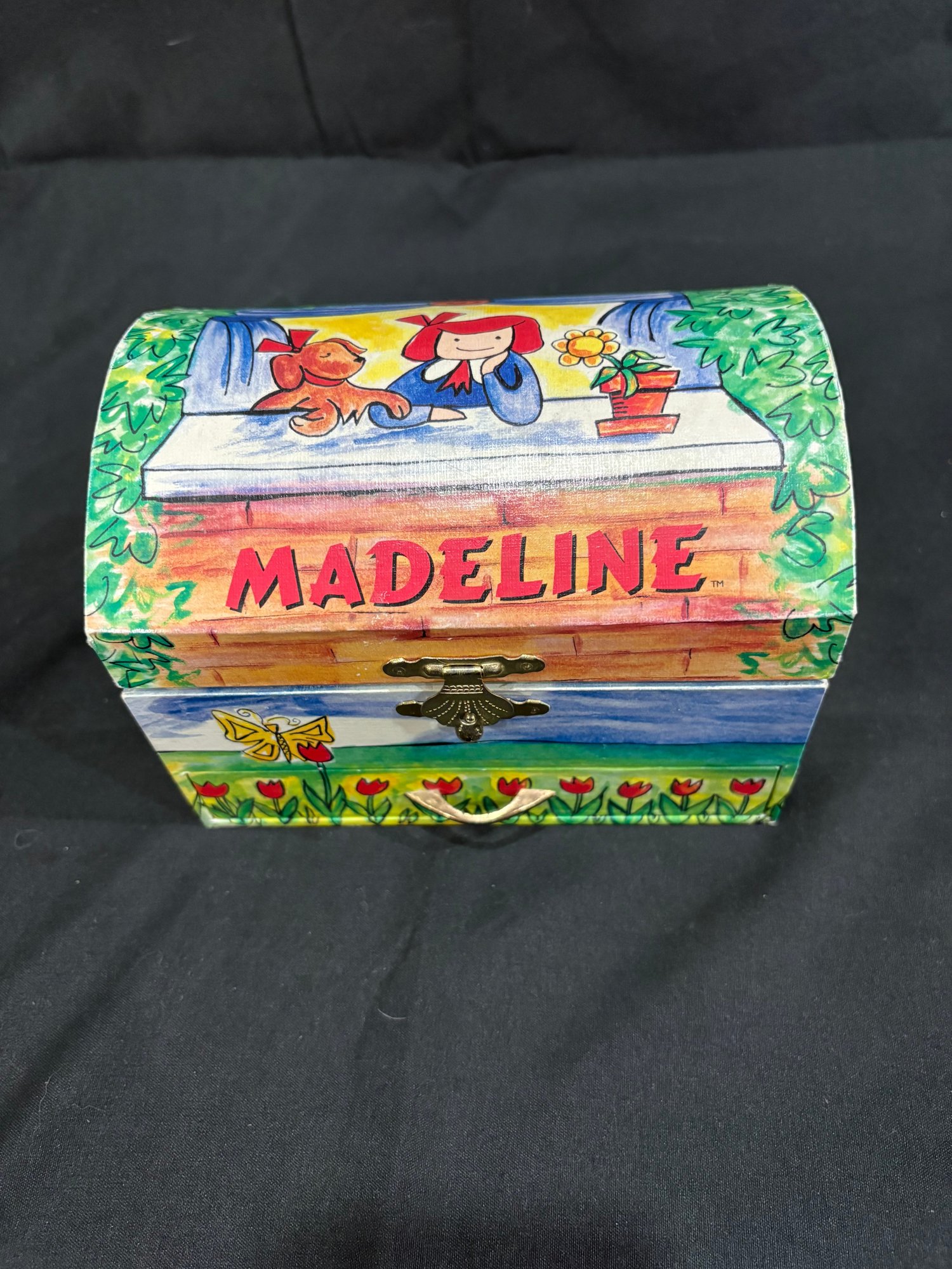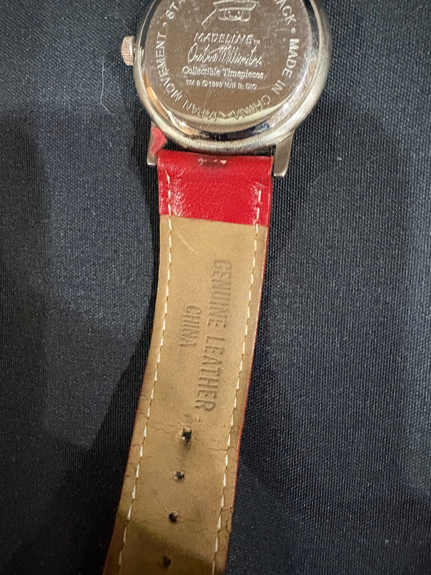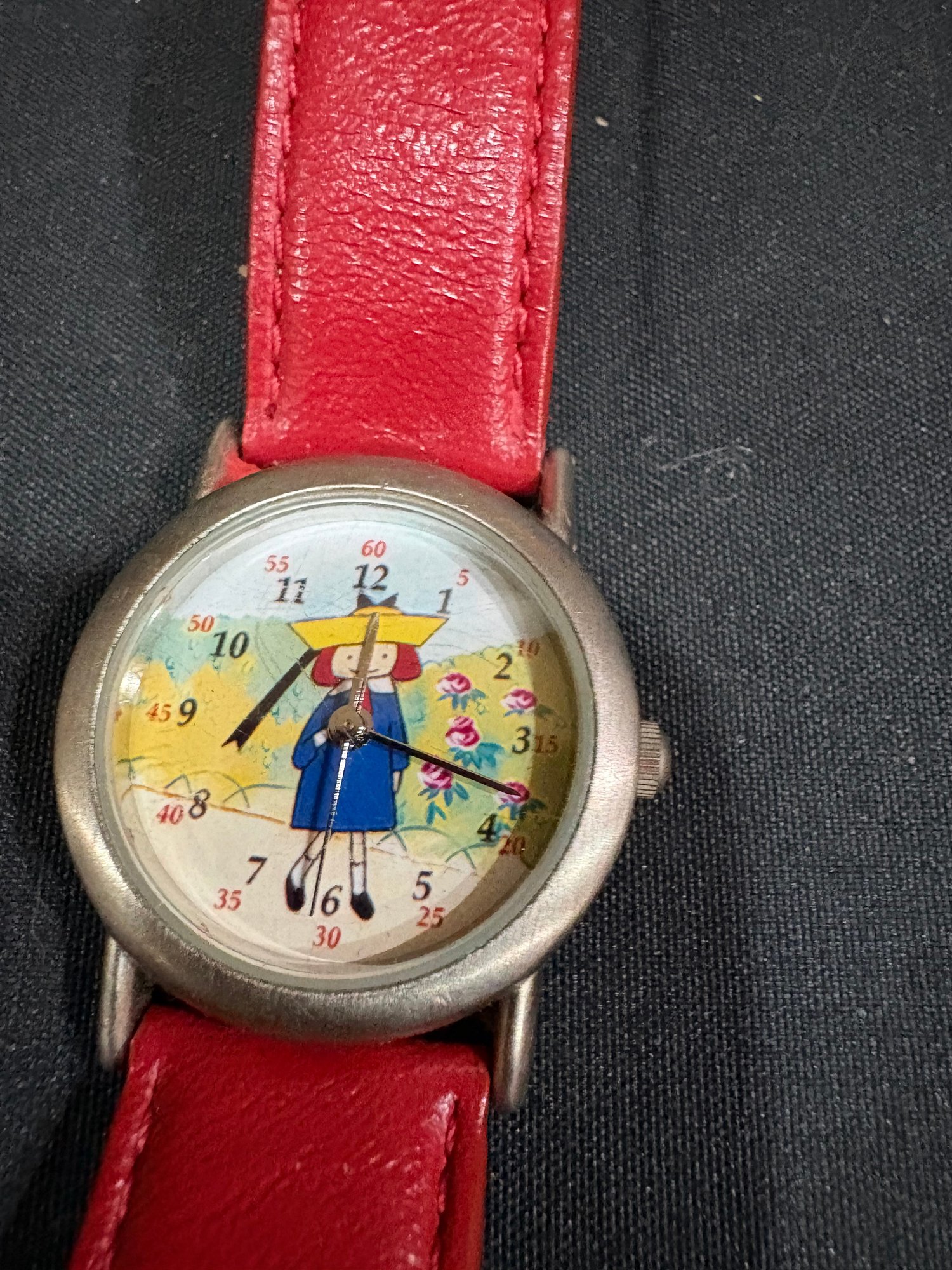Madeline doll 14 in tall , music / jewelry box works 6 by 4 by4. Watch Japan movement. 7 in leather watch band made in china