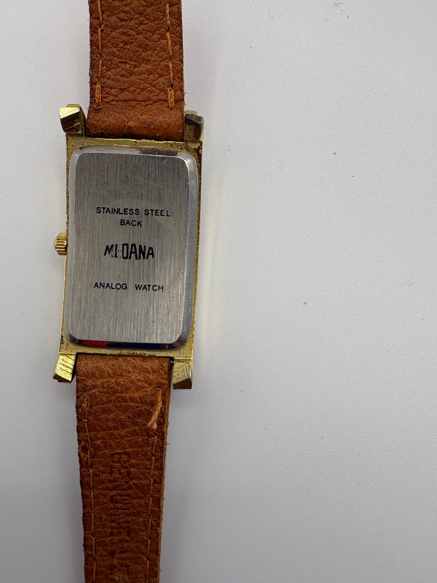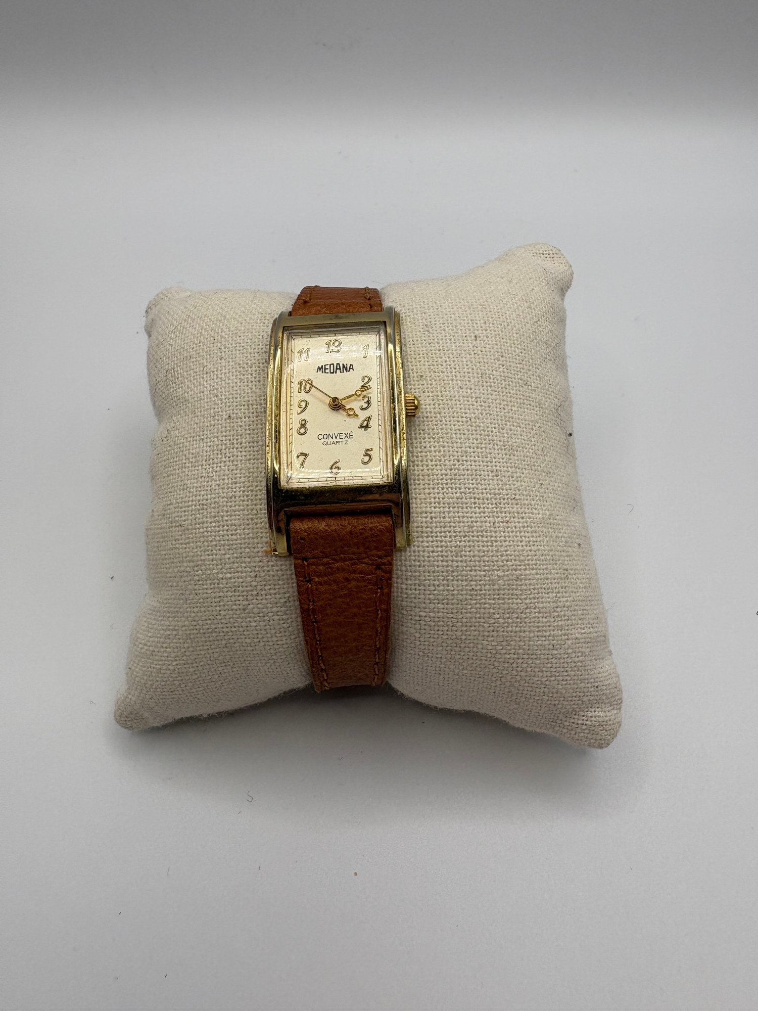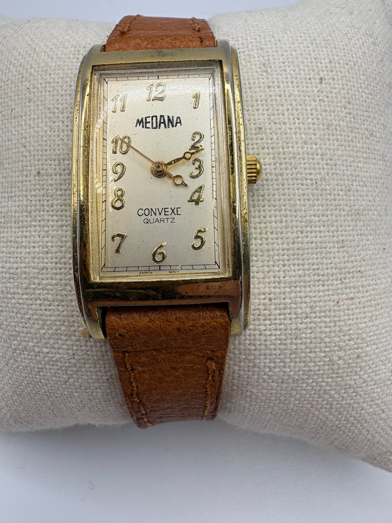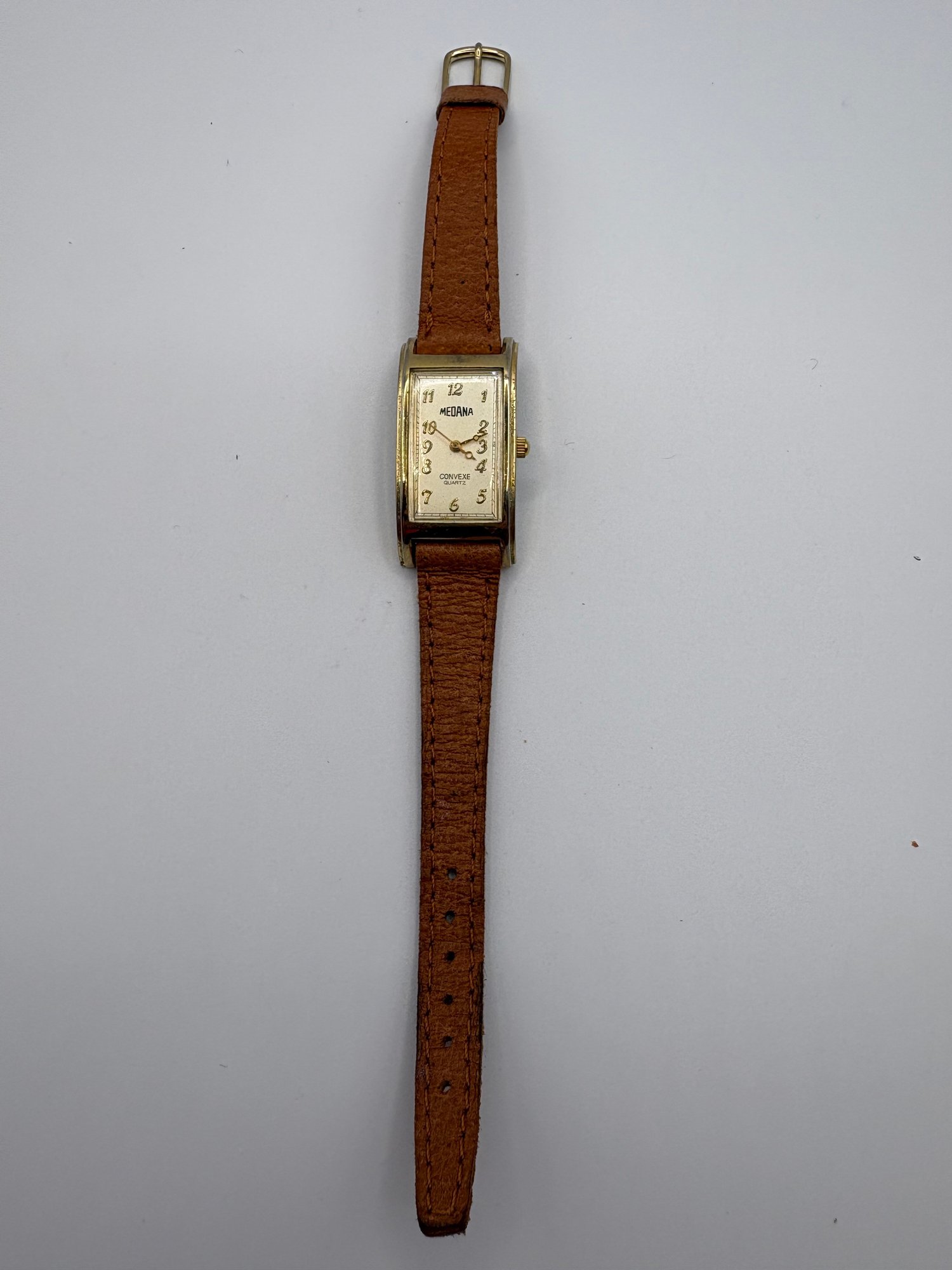 Medana Convexe quartz wristwatch with a gold-tone case and brown leather strap.