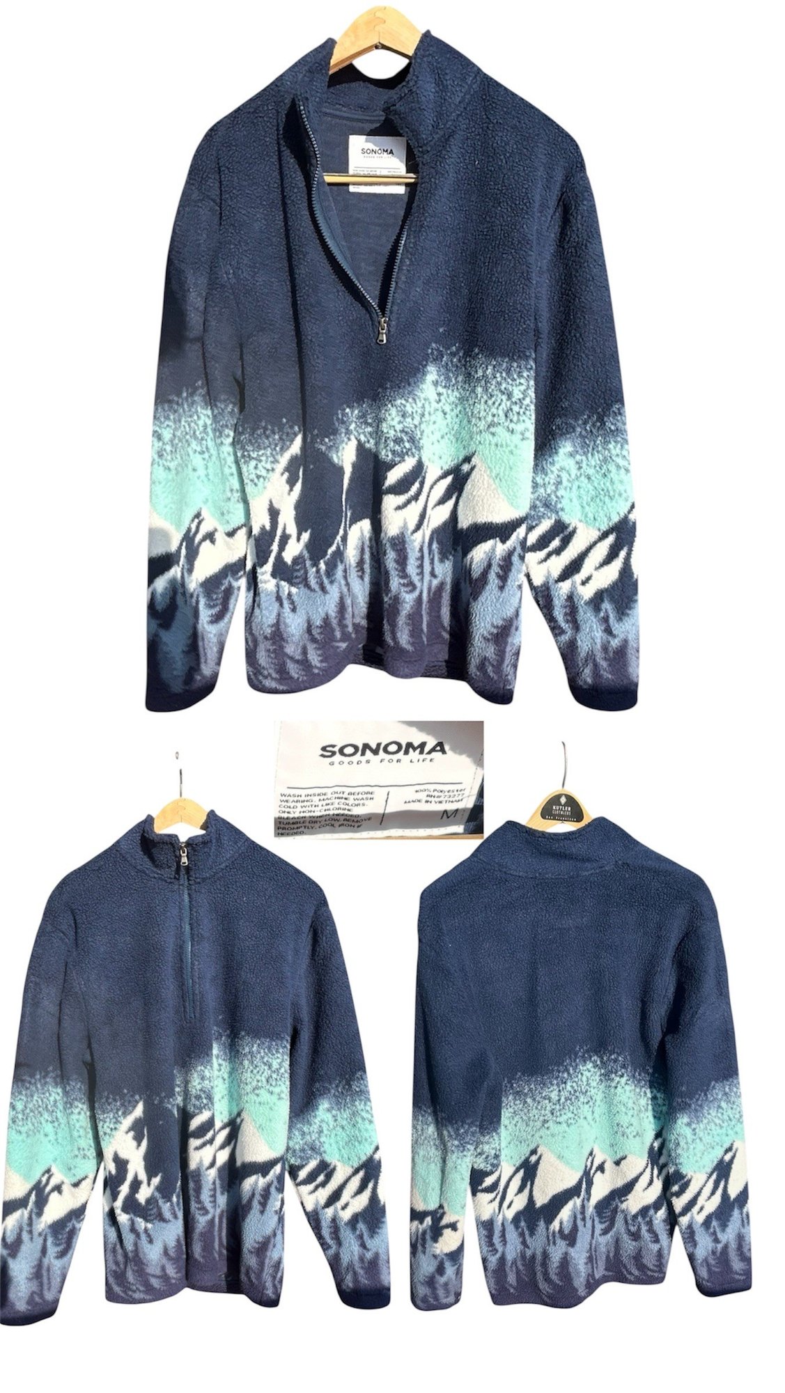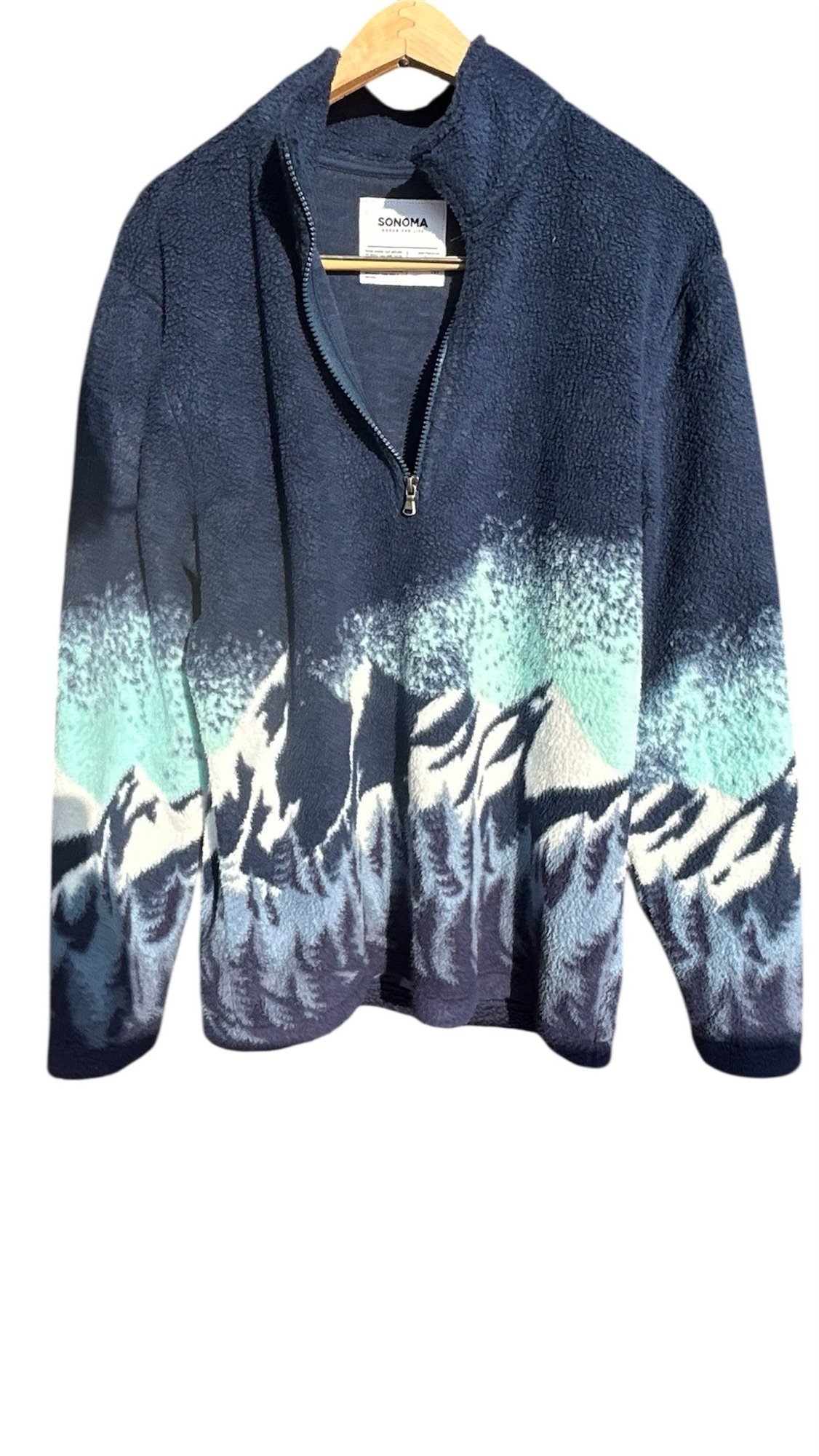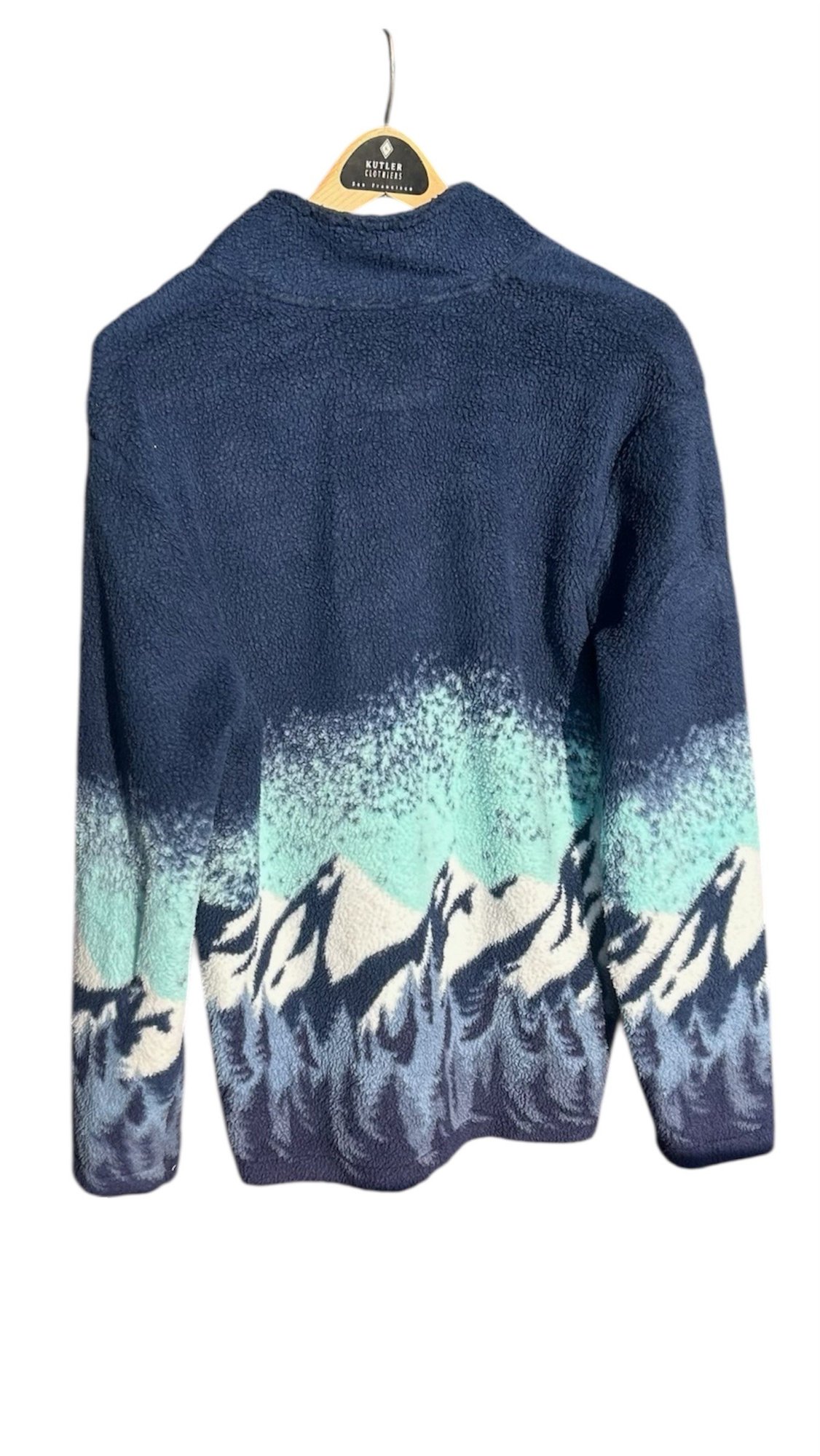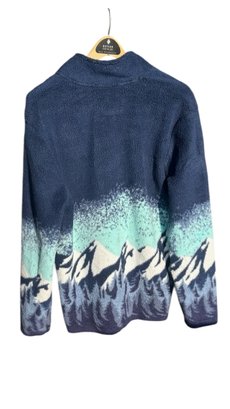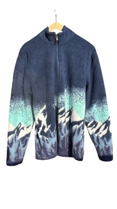 Cozy sherpa-style fleece with striking navy and teal mountain landscape print across chest and sleeves.