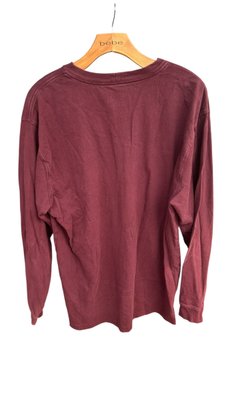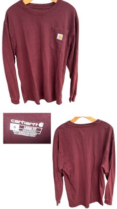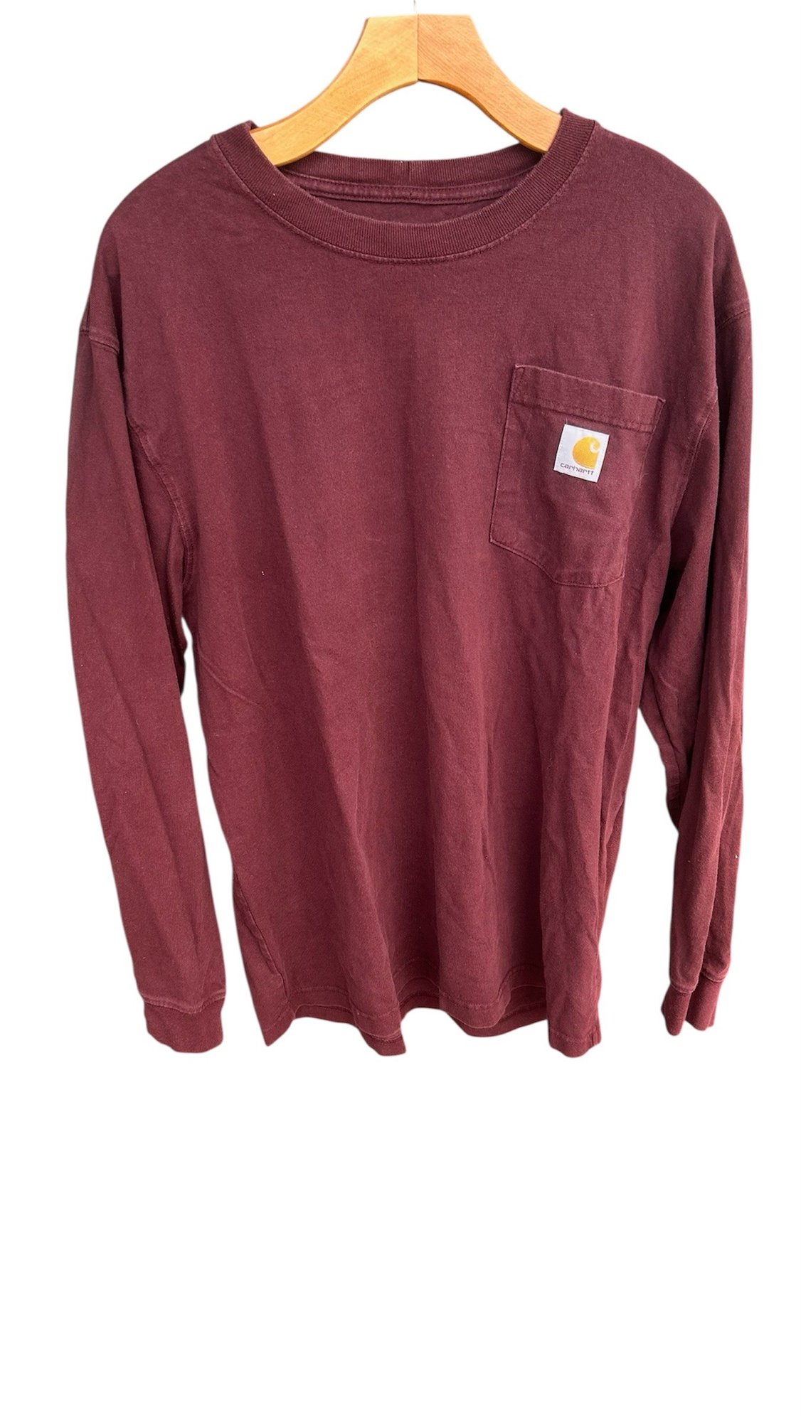 Durable Carhartt long sleeve in deep burgundy, featuring chest pocket with Carhartt logo patch. Loose fit style.
