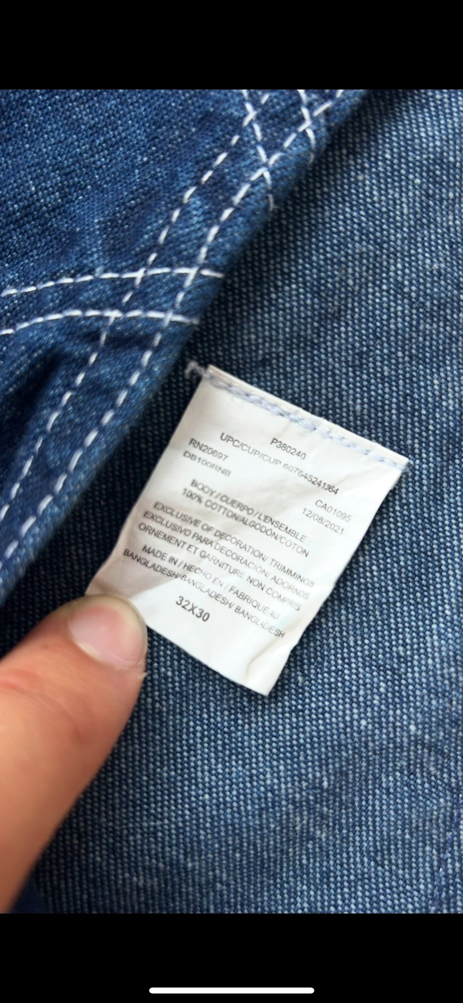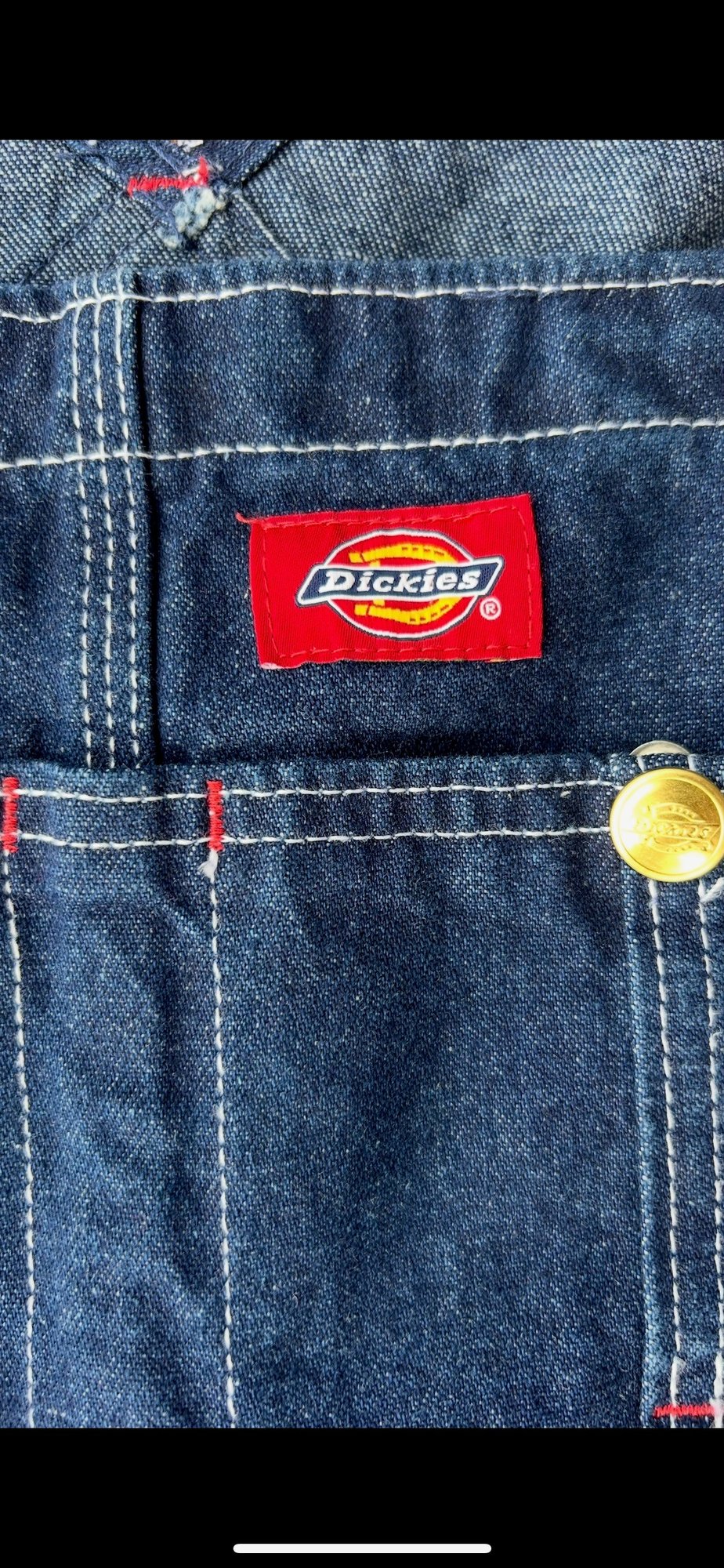 Classic Dickies denim overalls in sturdy blue jean fabric with brass hardware, multiple utility pockets, and adjustable straps. Timeless workwear piece great for functional wear or styled as streetwear.