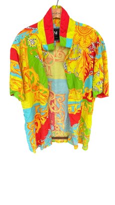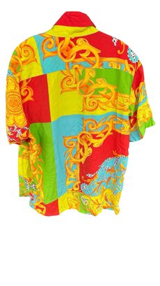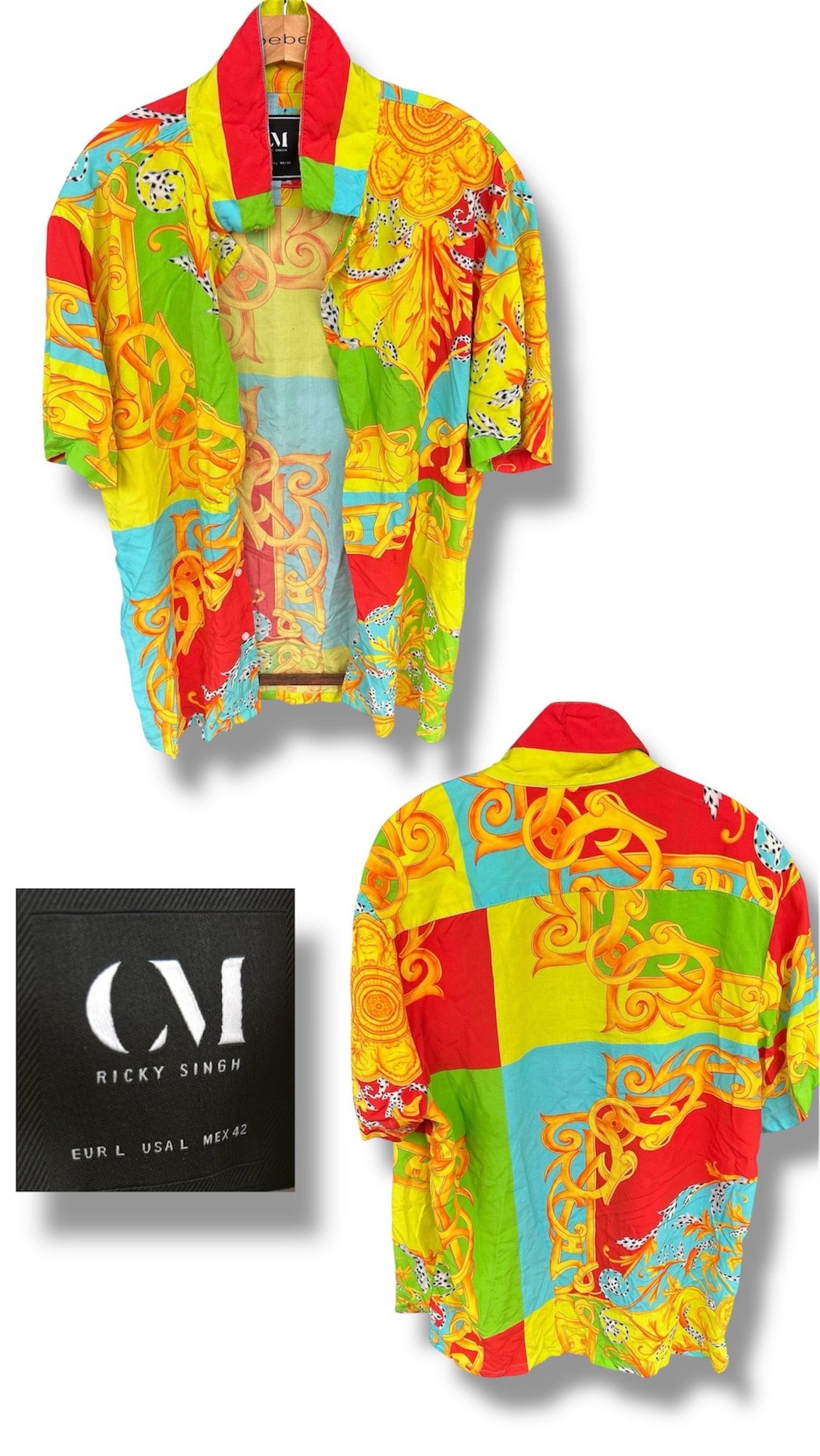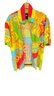 Bold short sleeve button-up by Ricky Singh featuring patchwork-inspired design with bright red, yellow, green, and blue hues accented by ornate prints.
