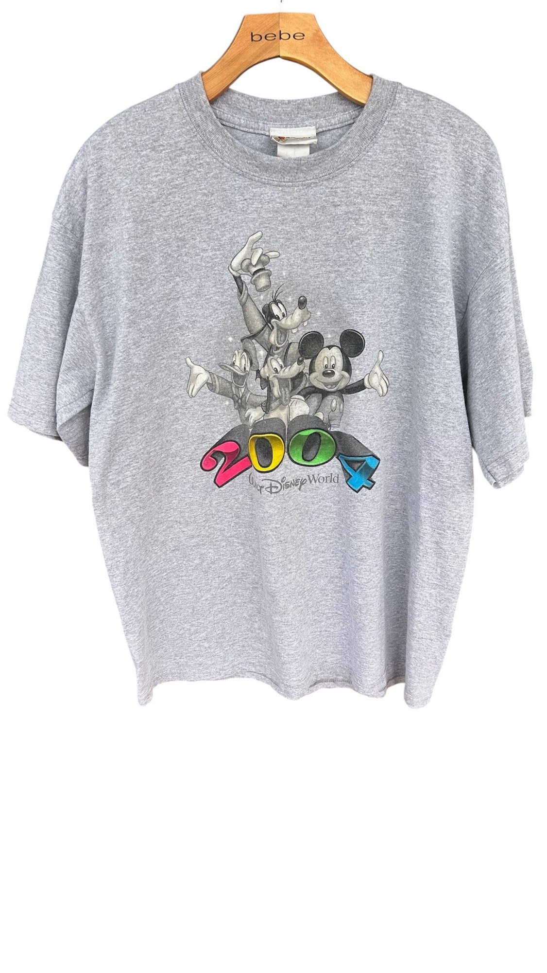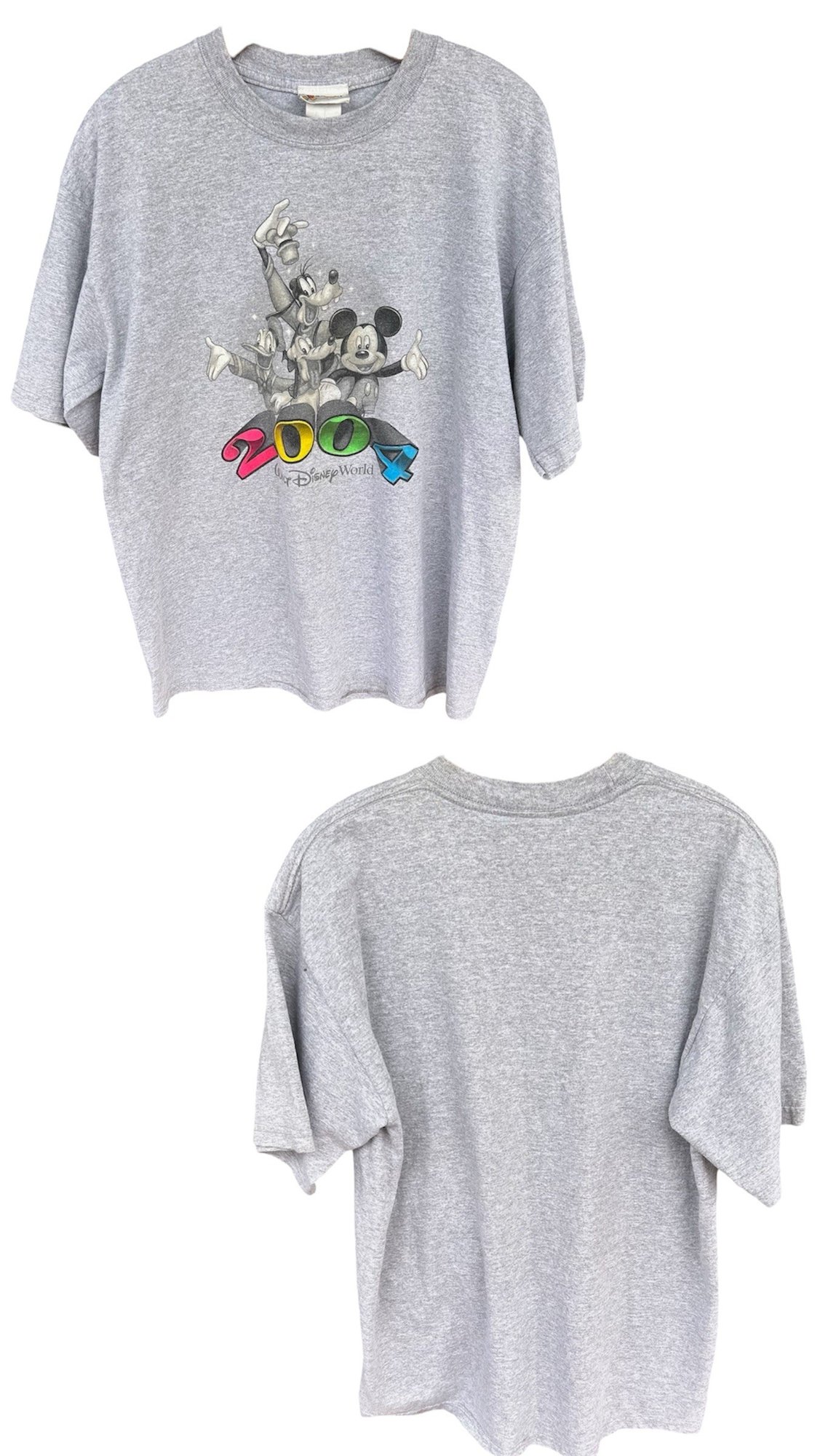 Classic gray Disney tee celebrating the year 2000 with Mickey Mouse, Goofy, and Pluto in a bold Y2K graphic print.