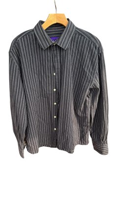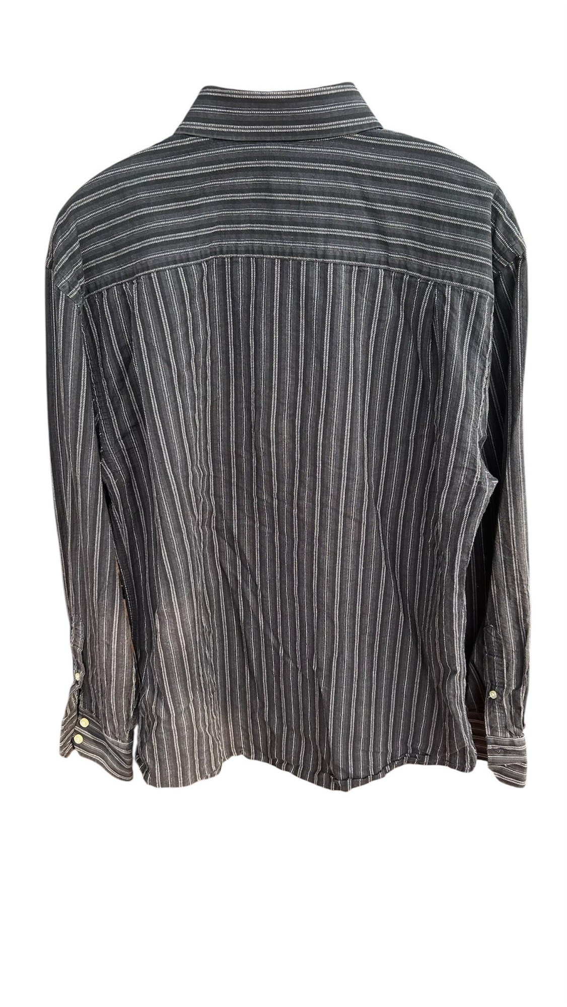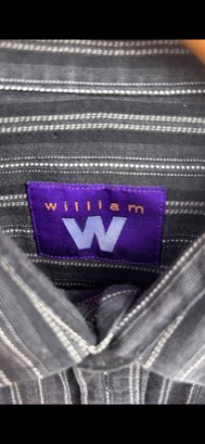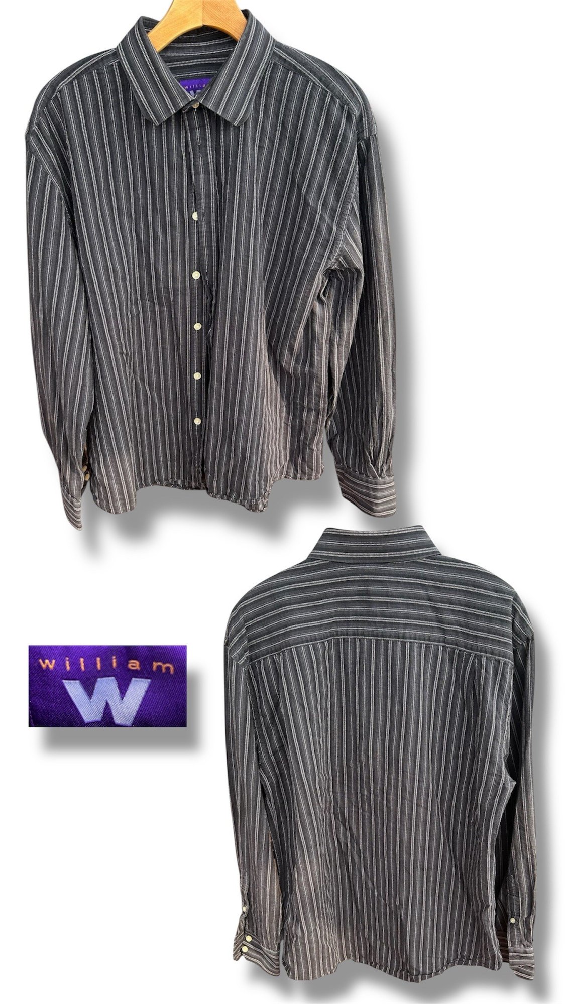 Classic long sleeve button-up in black with gray pinstripes by William. Features a sharp collar and subtle vintage style.