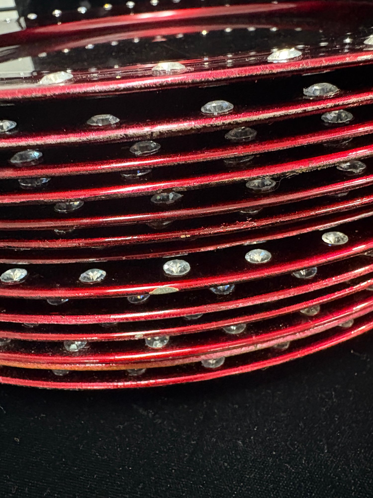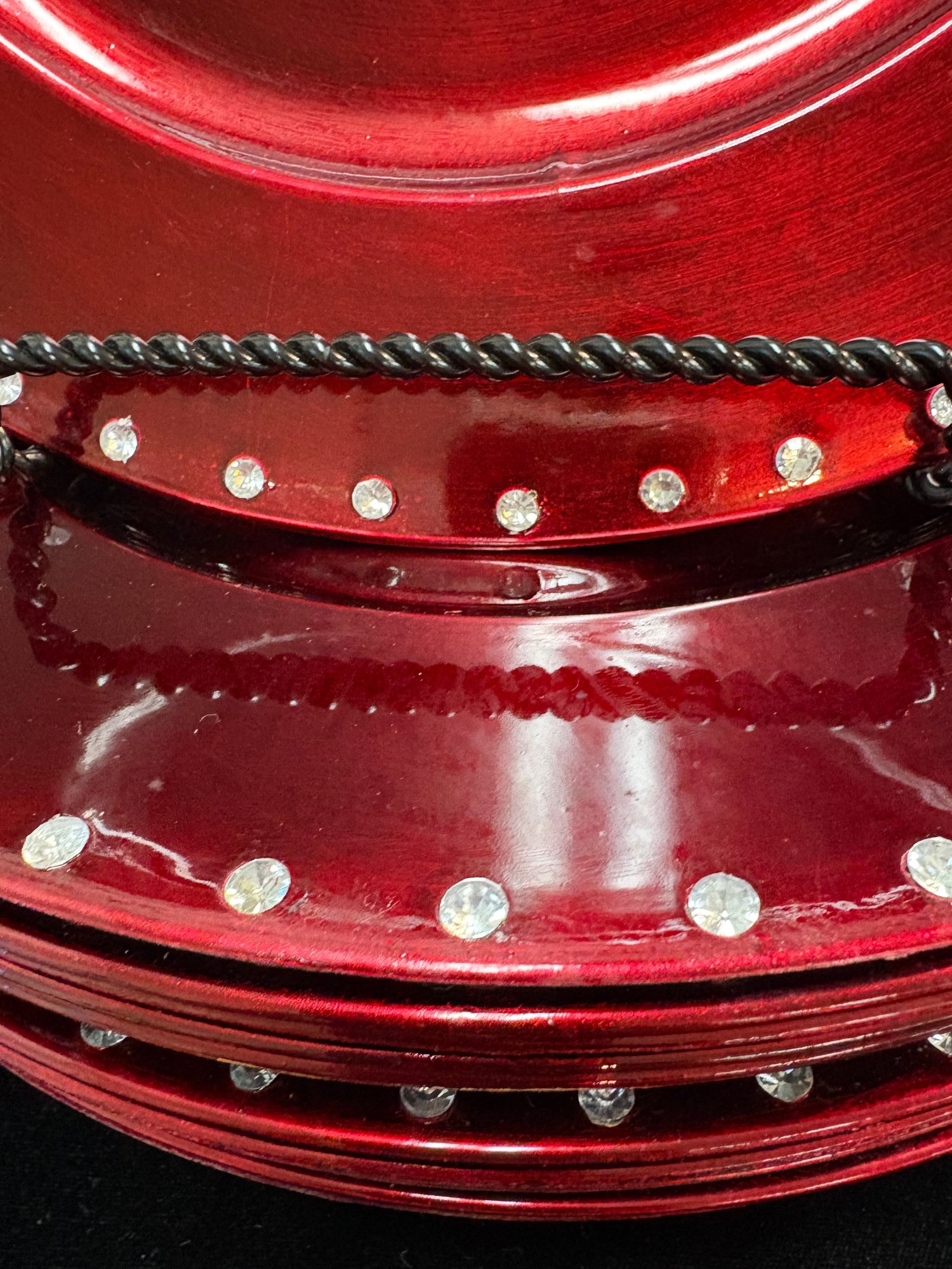 13 holiday Chargers for your Christmas table, the red glossy jammed around the edges. There’s a few chips on the edges. See in the pictures, but there are otherwise in great shape. There may be a couple scratches.
