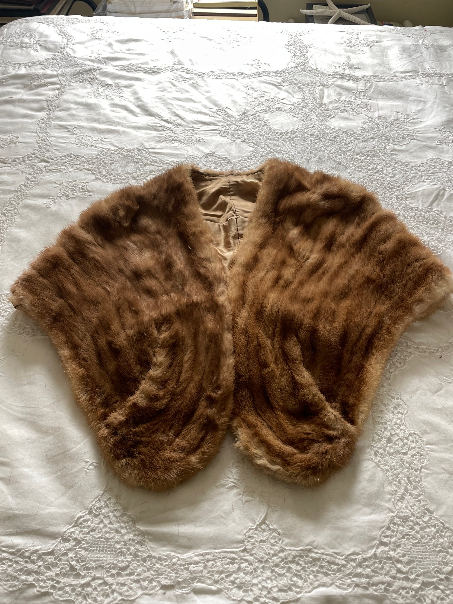 Mink stole with initials FHF on lining? Beige lining with Asian style pattern