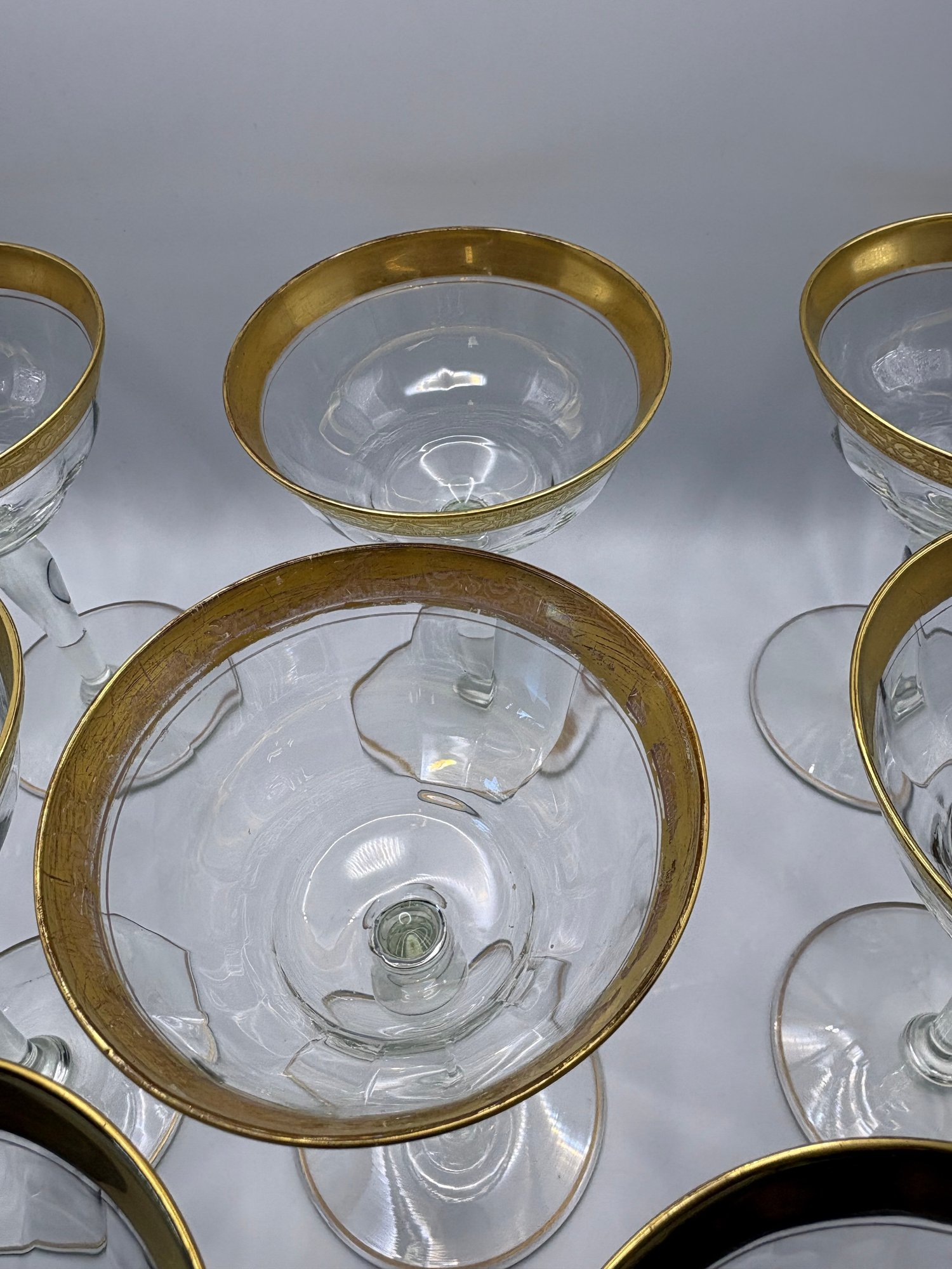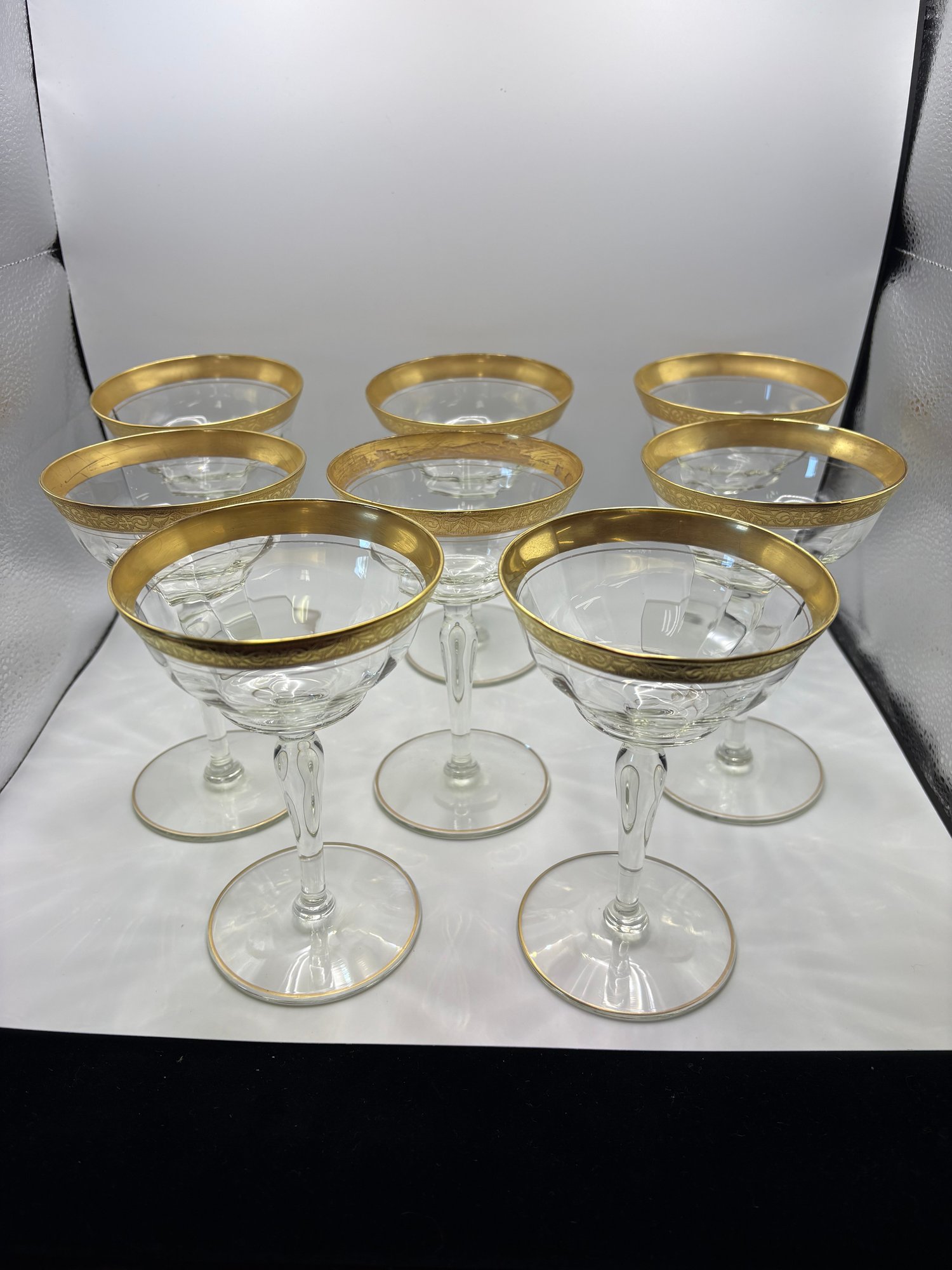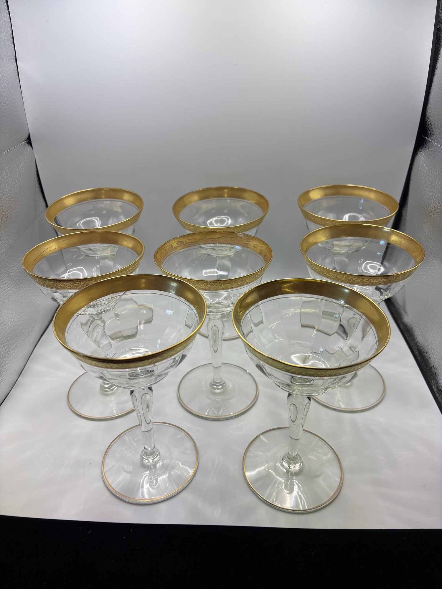 Set of 8 Tiffin Franciscan Minton Rambler Rose Crystal Champagne or Sherbet glasses. I feel one flea bite. See pictures. Gold tone rimmed