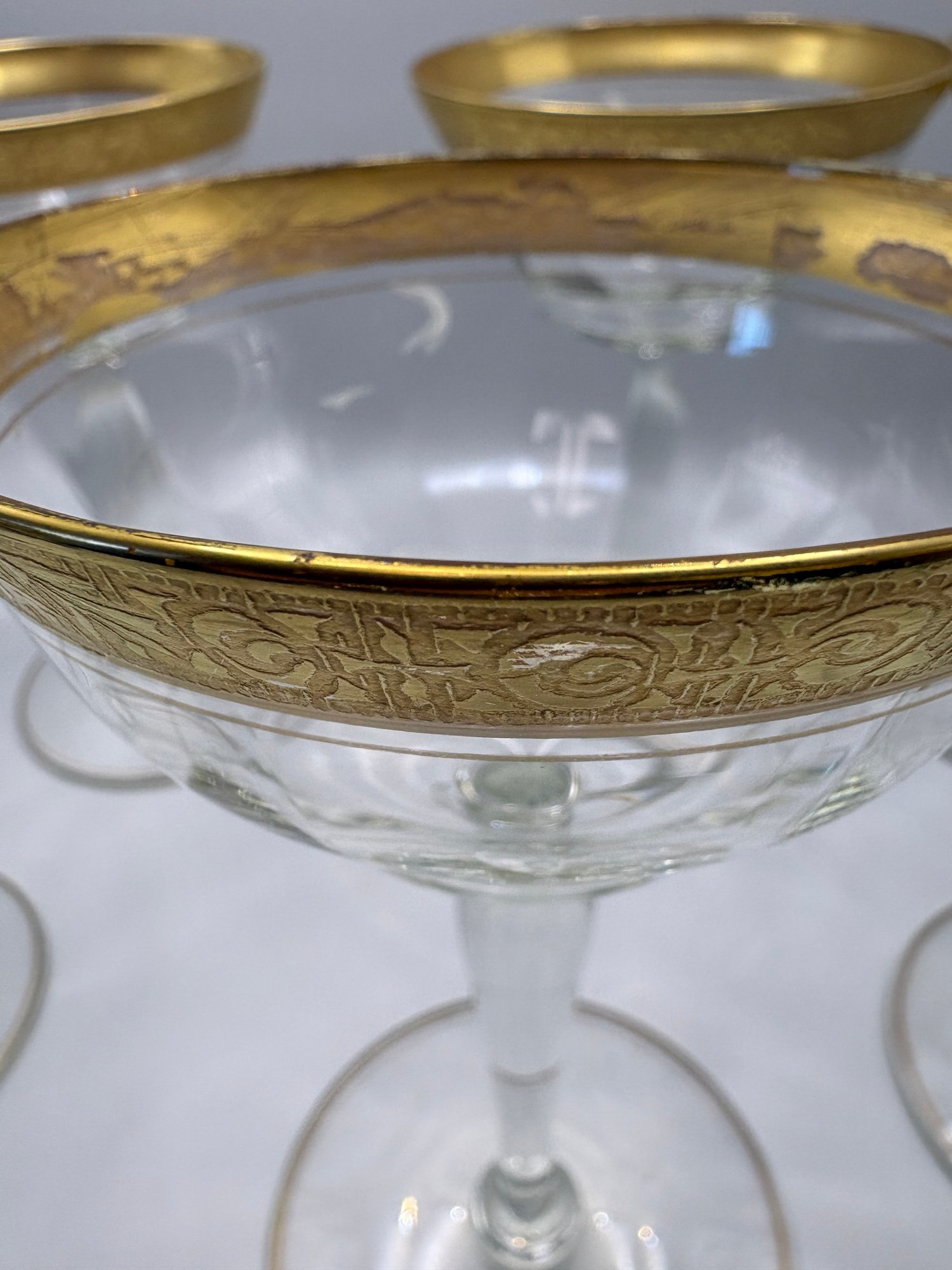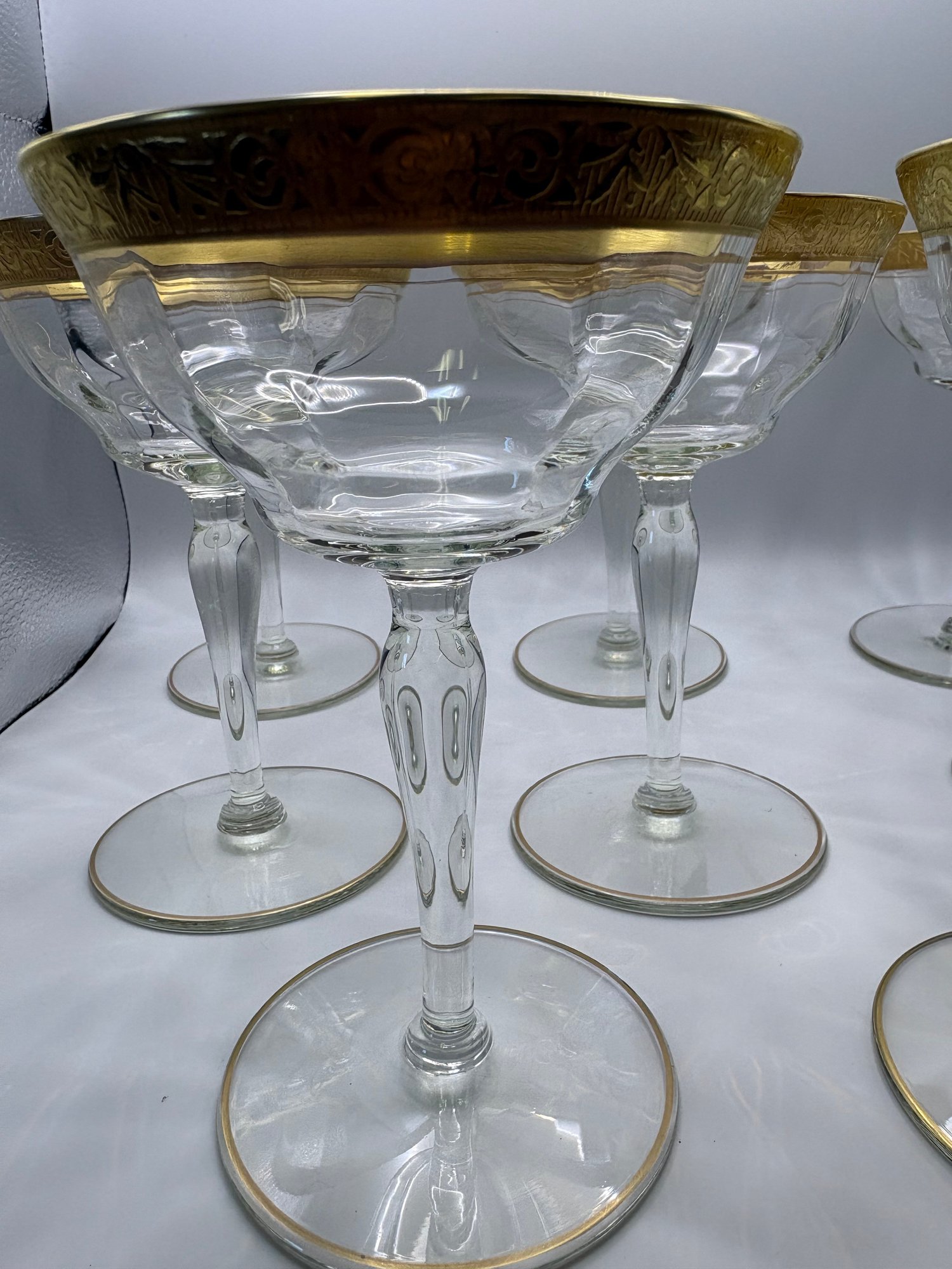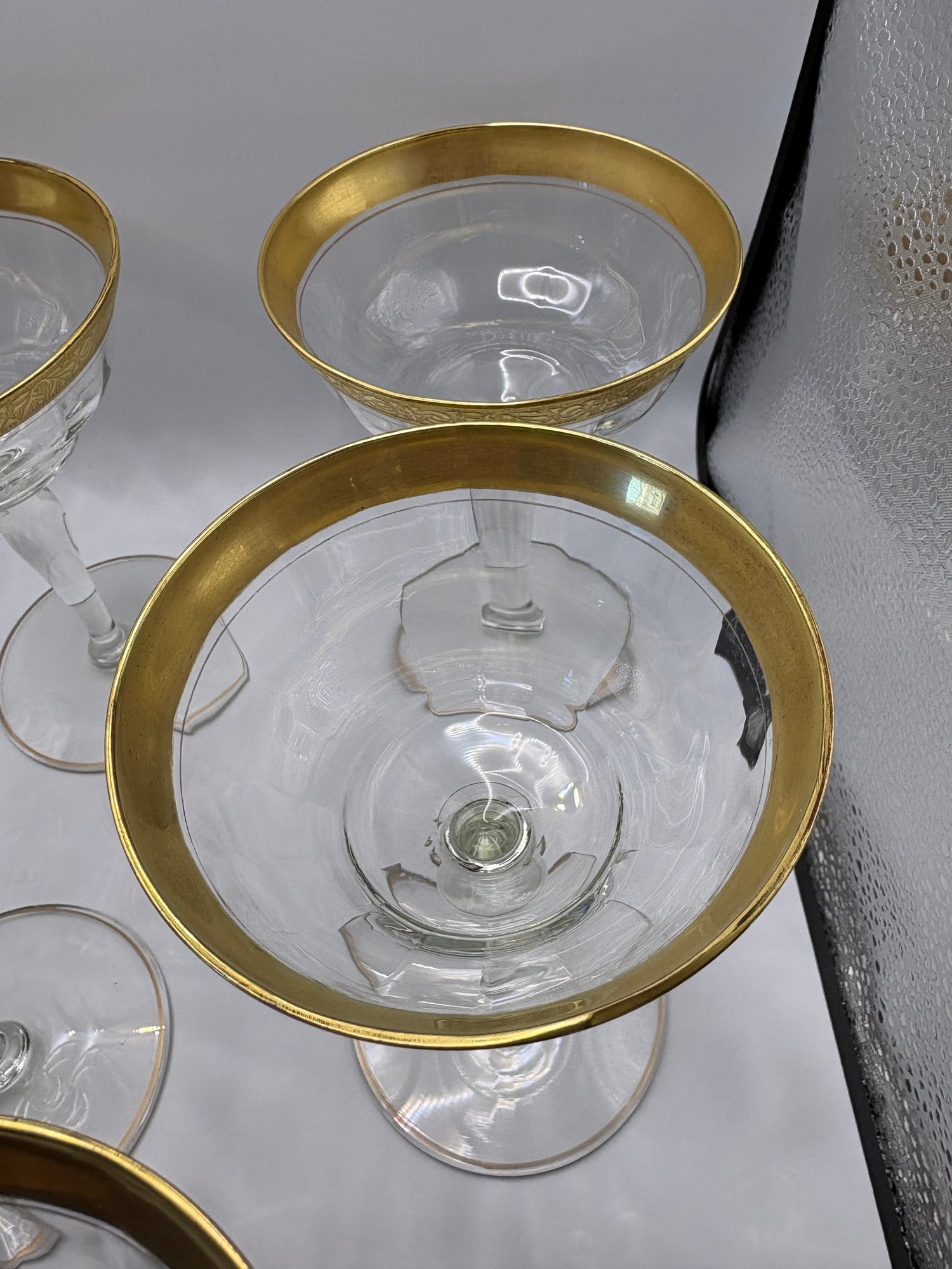 Set of 8 Tiffin Franciscan Minton Rambler Rose Crystal Champagne or Sherbet glasses. I feel one flea bite. See pictures. Gold tone rimmed