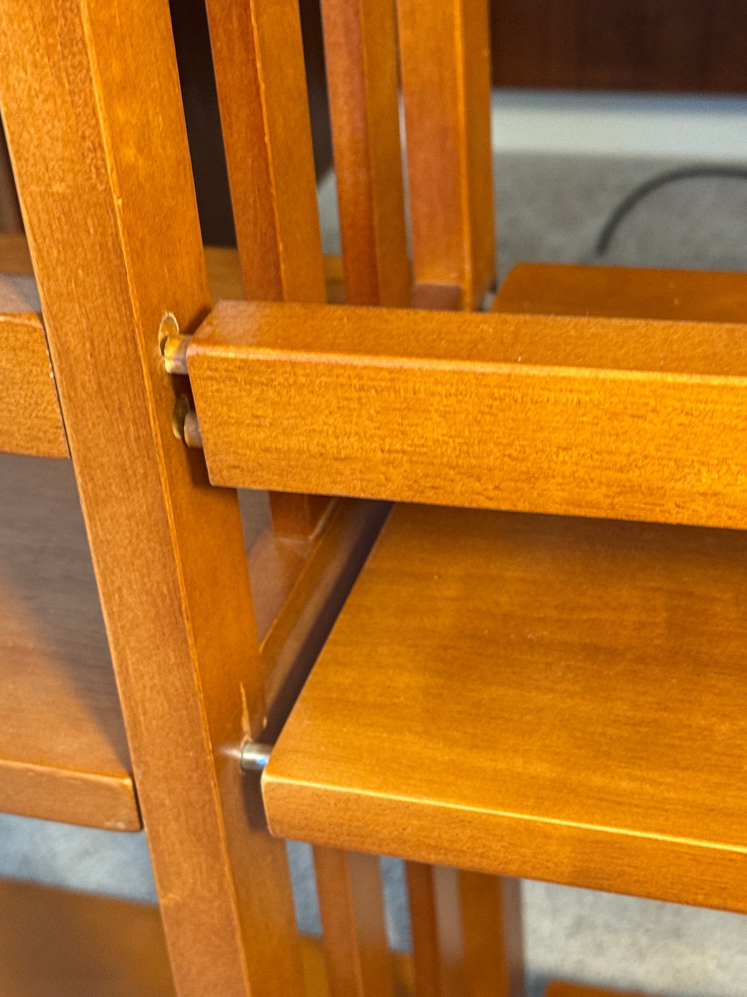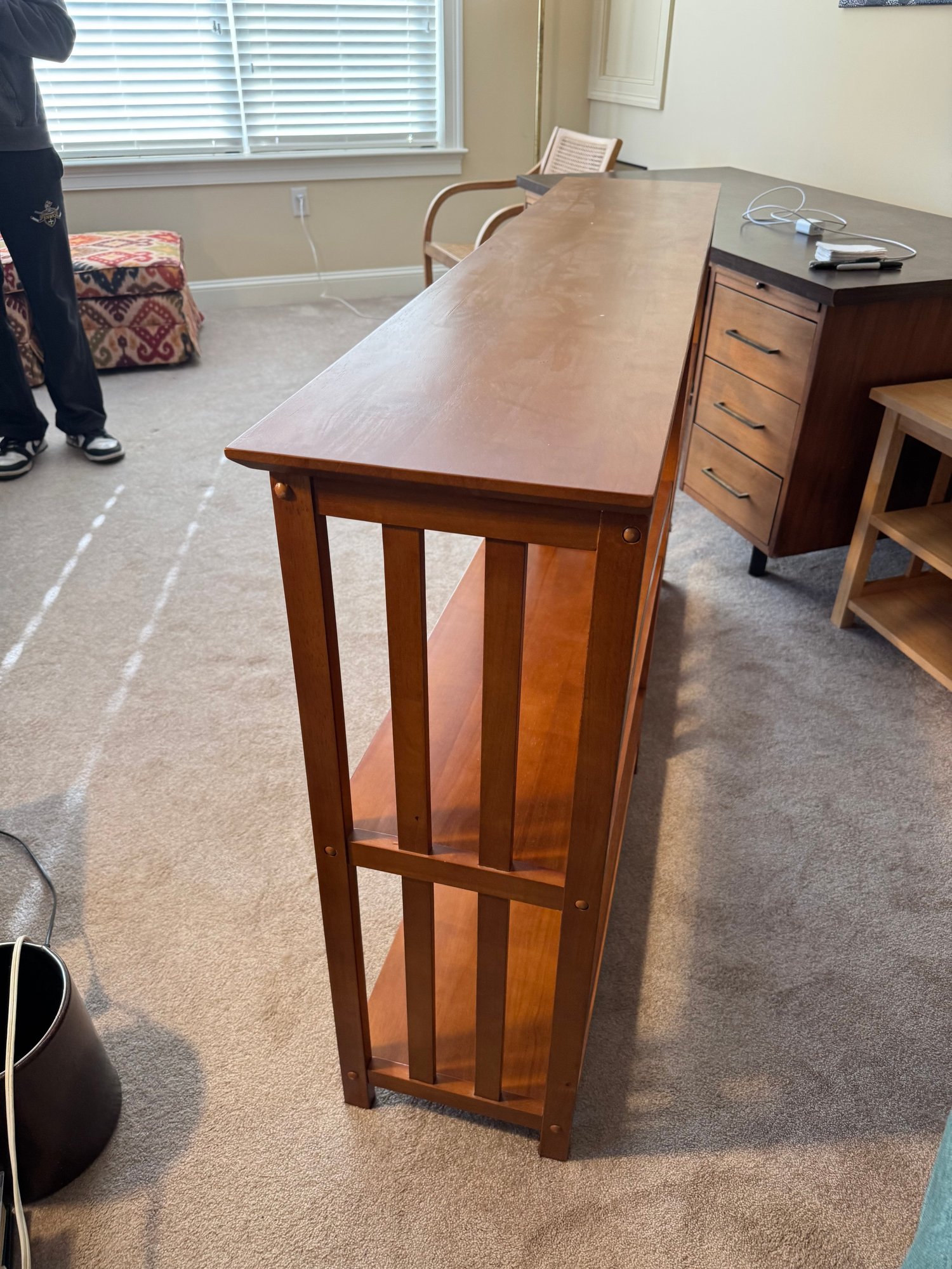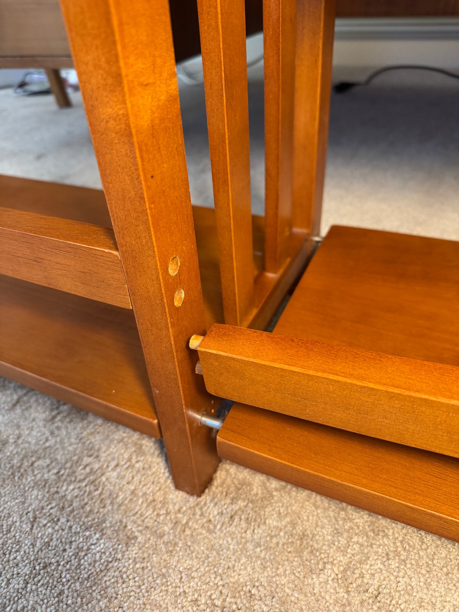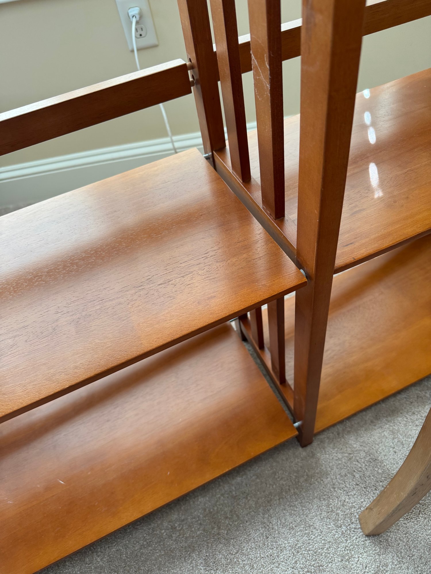 this shelf has some issues. when you try to move it, the two sides come apart & are not solidly together. some areas on the bottom are chipped. it’s possible it just needs to be taken apart and put back together. see photos.