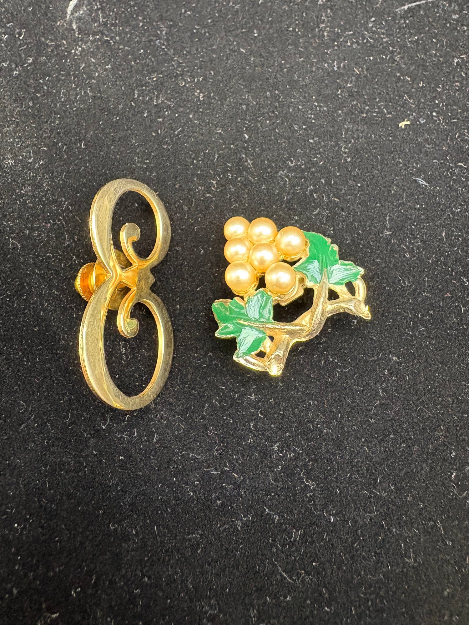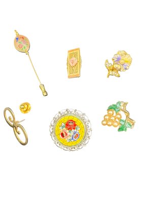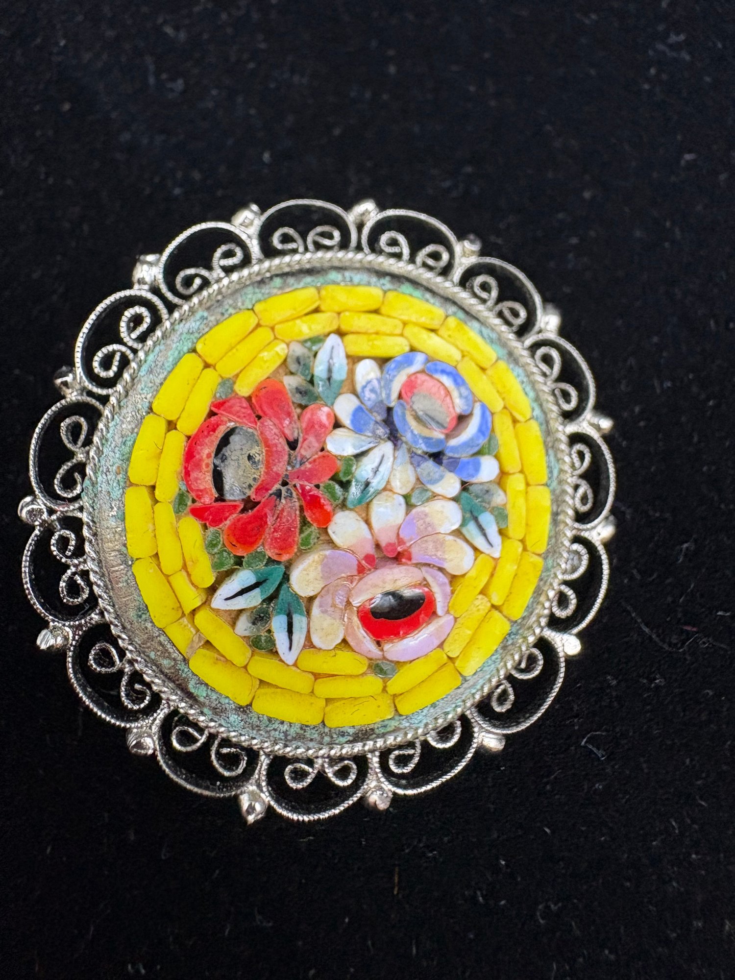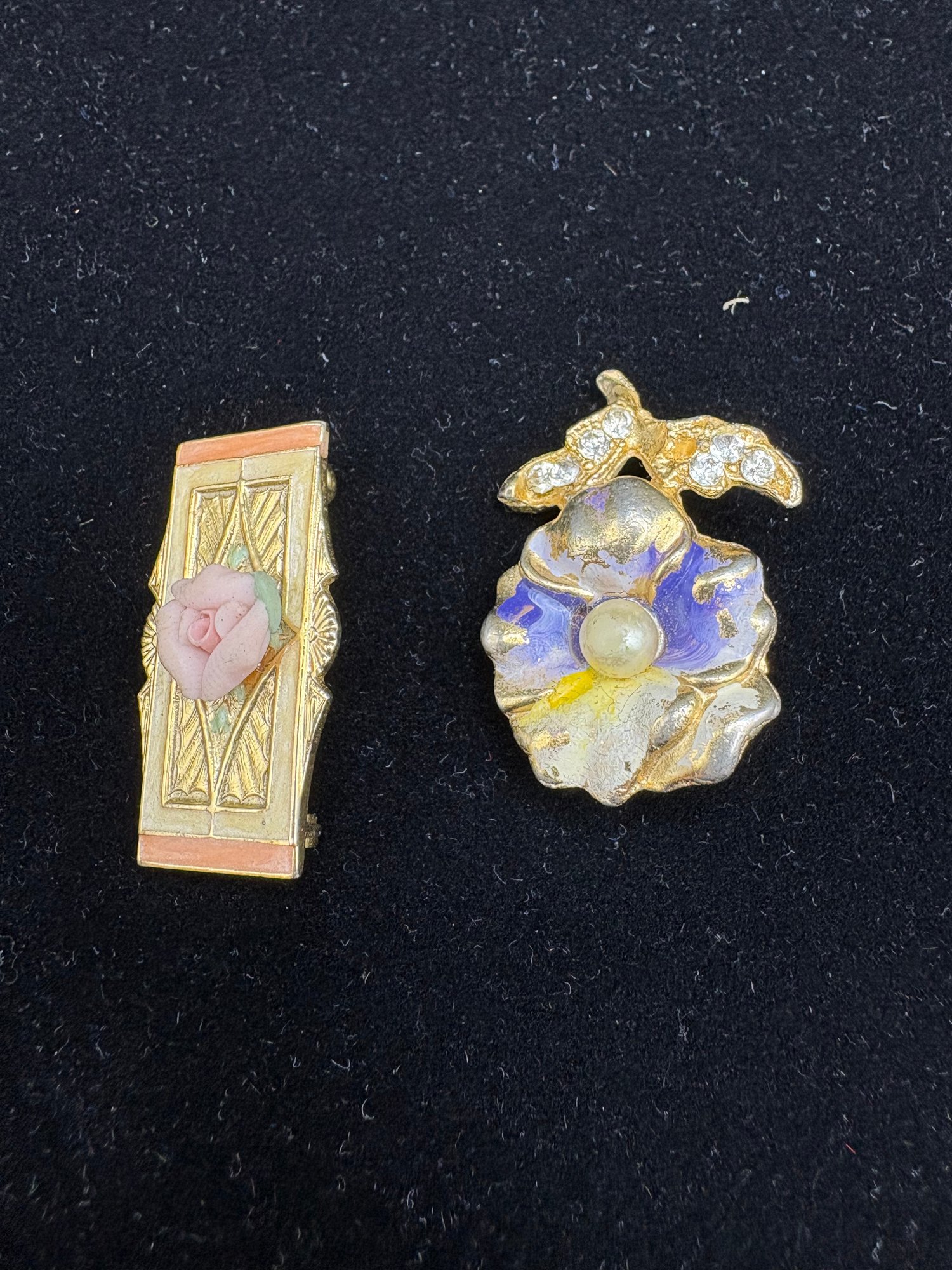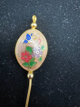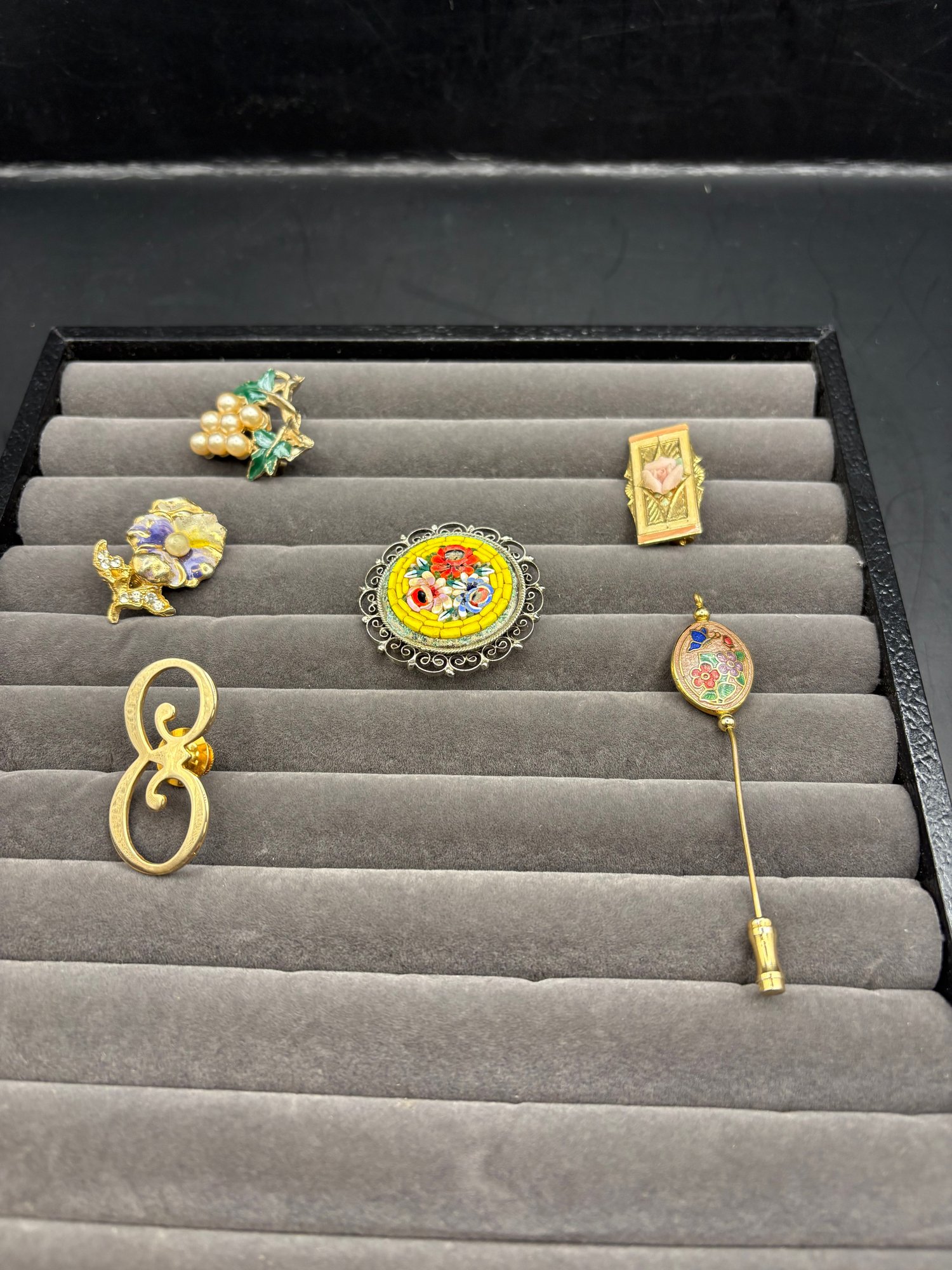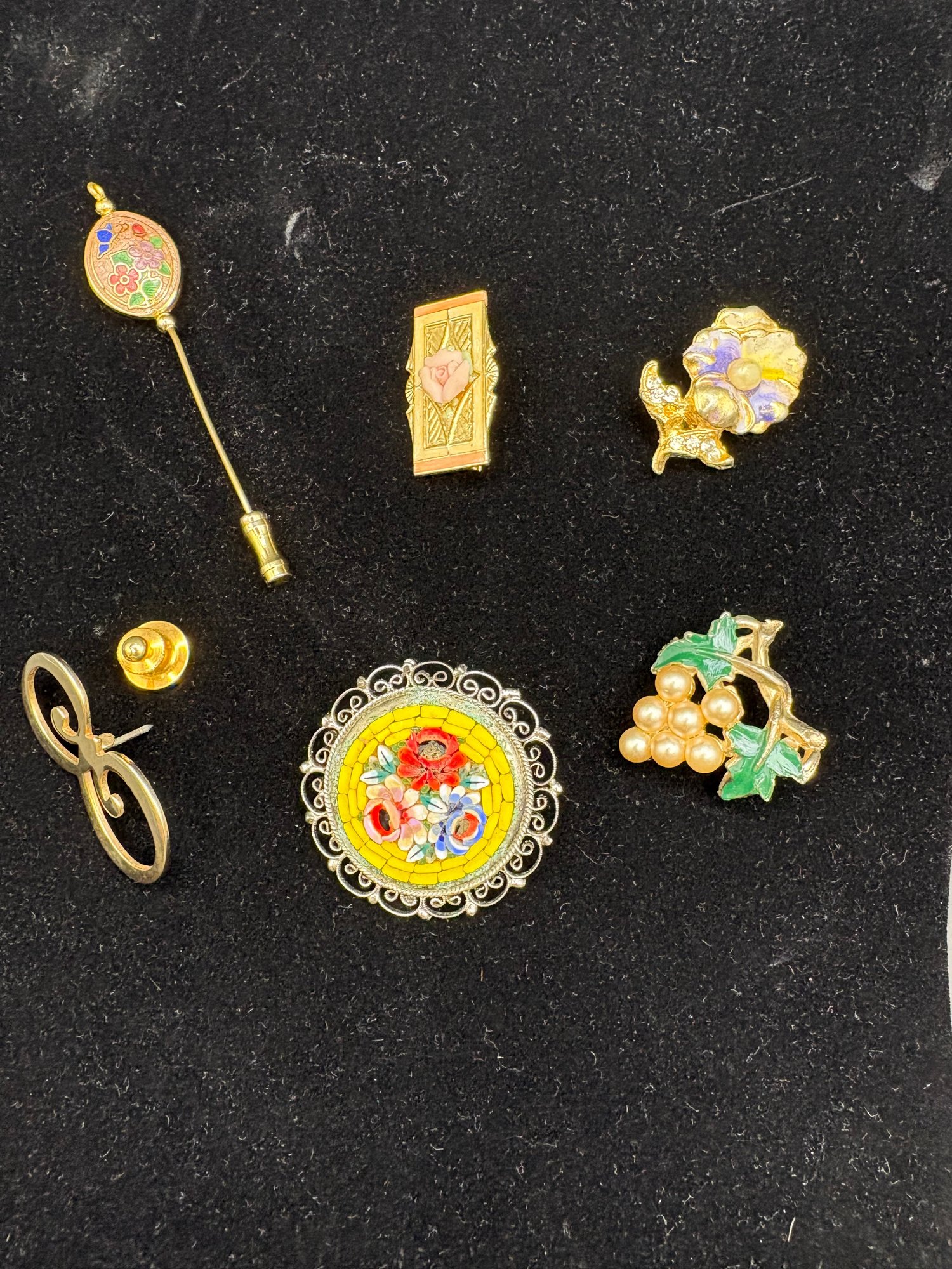 There’s six pins in total mostly floral one is a cloisonné a stick pin and the other one is mosaic from Italy