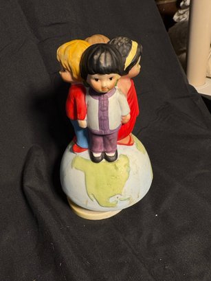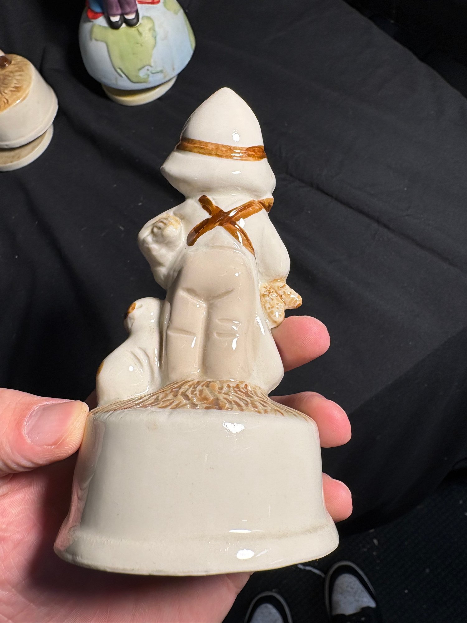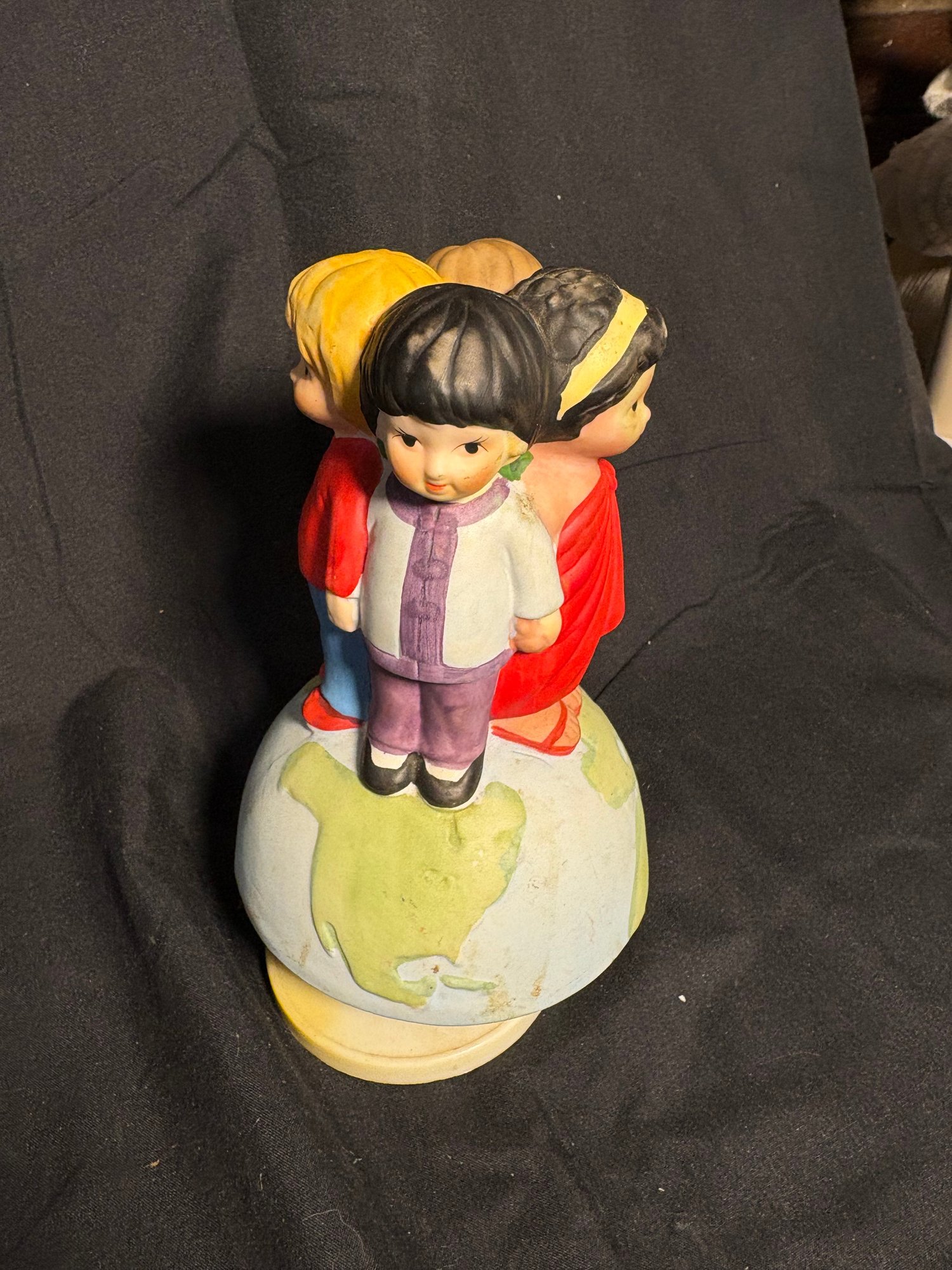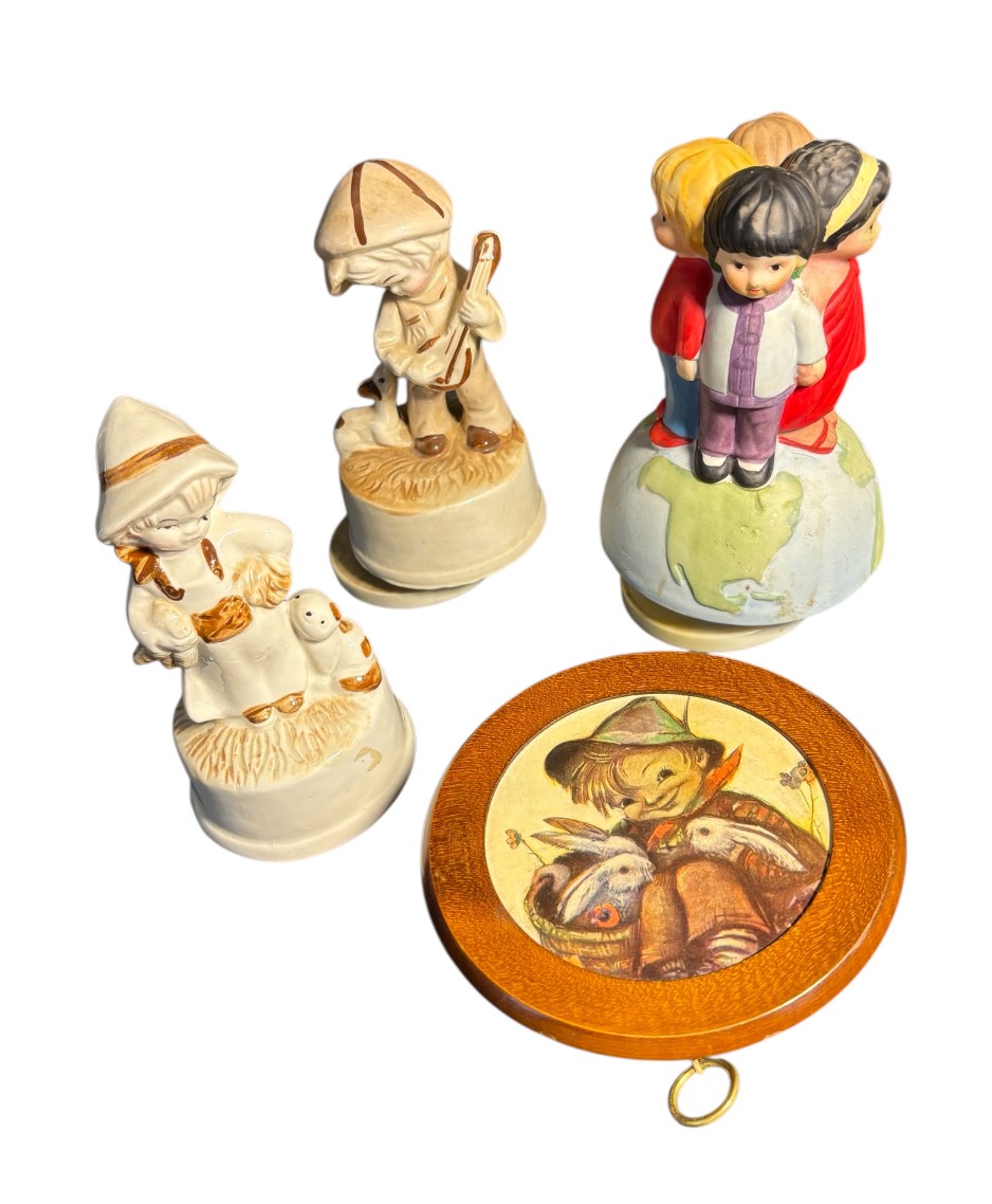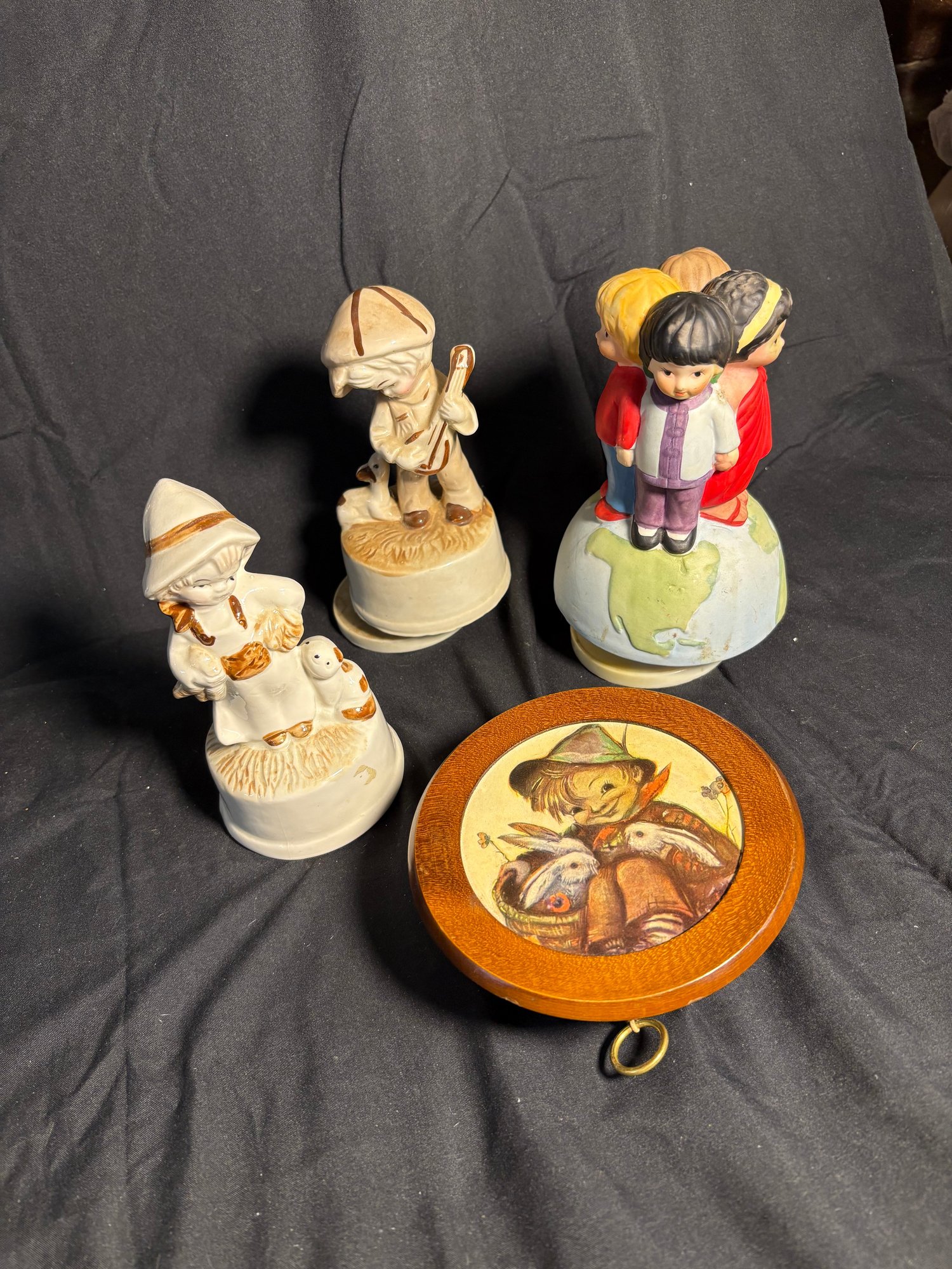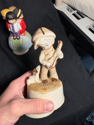 Boy with dog approximately 6.75” and works but slowly. Girl with dog approximately 6” works but slowly. Children of the world music box approximately 7 inches tall does not work. Swiss music box approximately 5 inches tall
