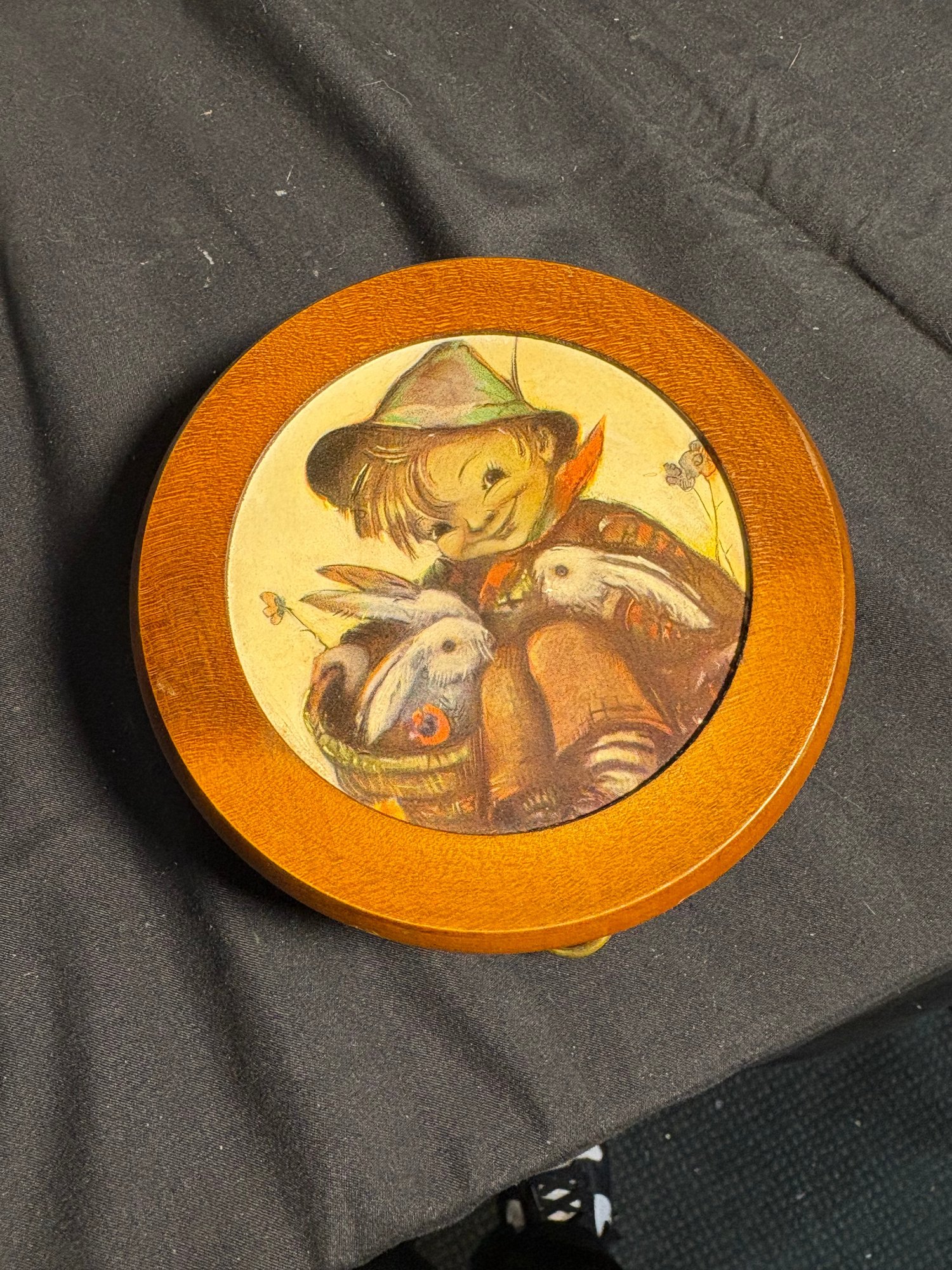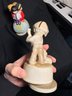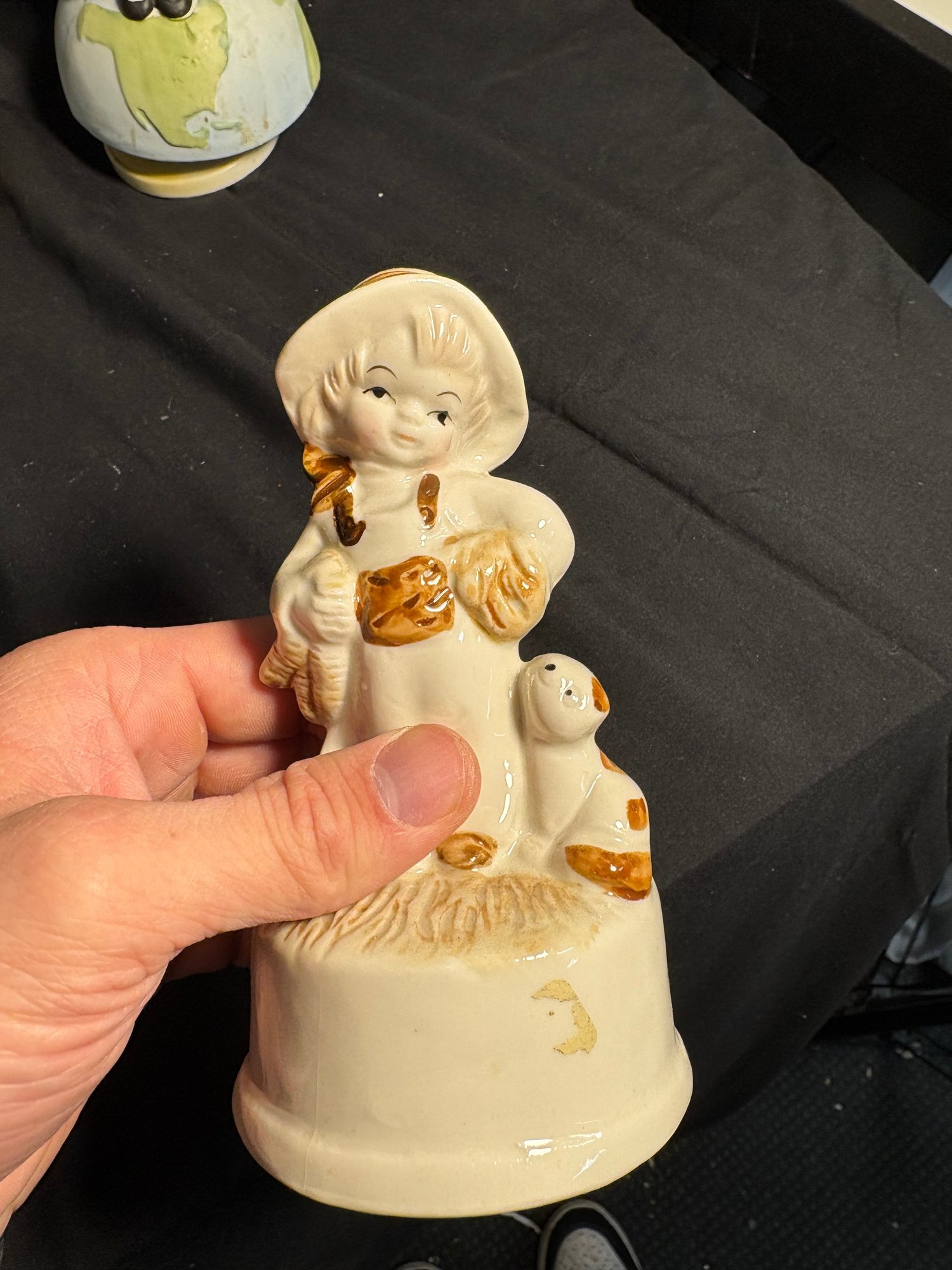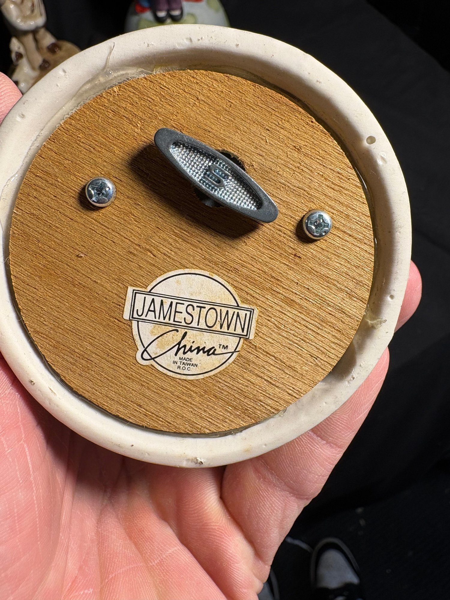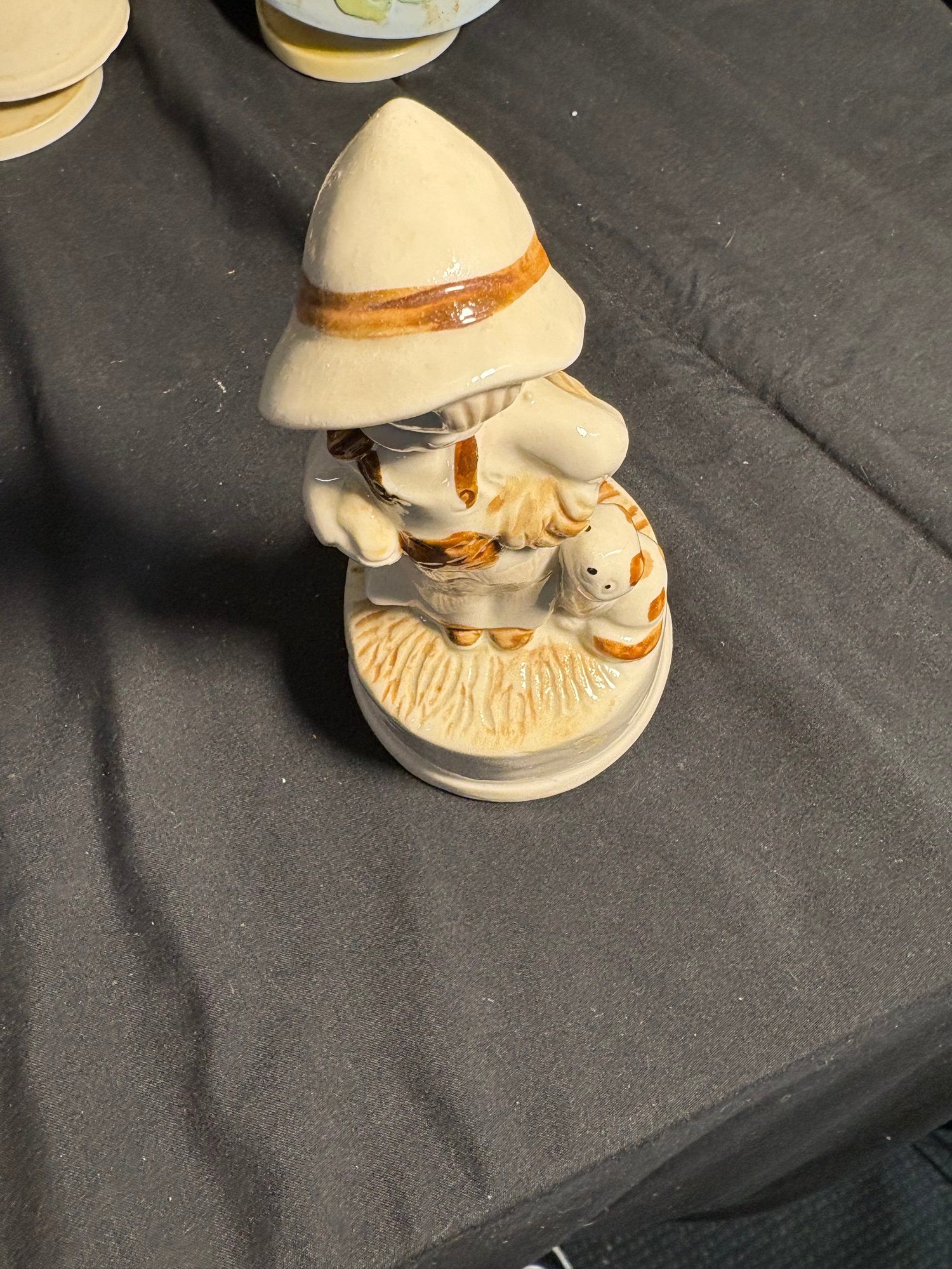 Boy with dog approximately 6.75” and works but slowly. Girl with dog approximately 6” works but slowly. Children of the world music box approximately 7 inches tall does not work. Swiss music box approximately 5 inches tall