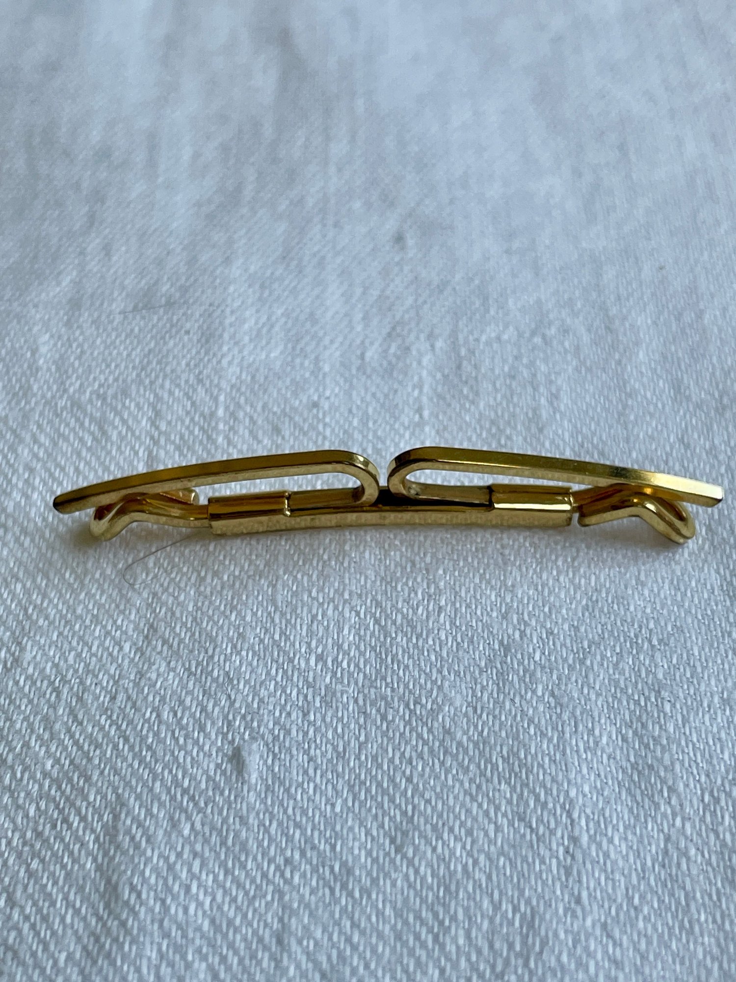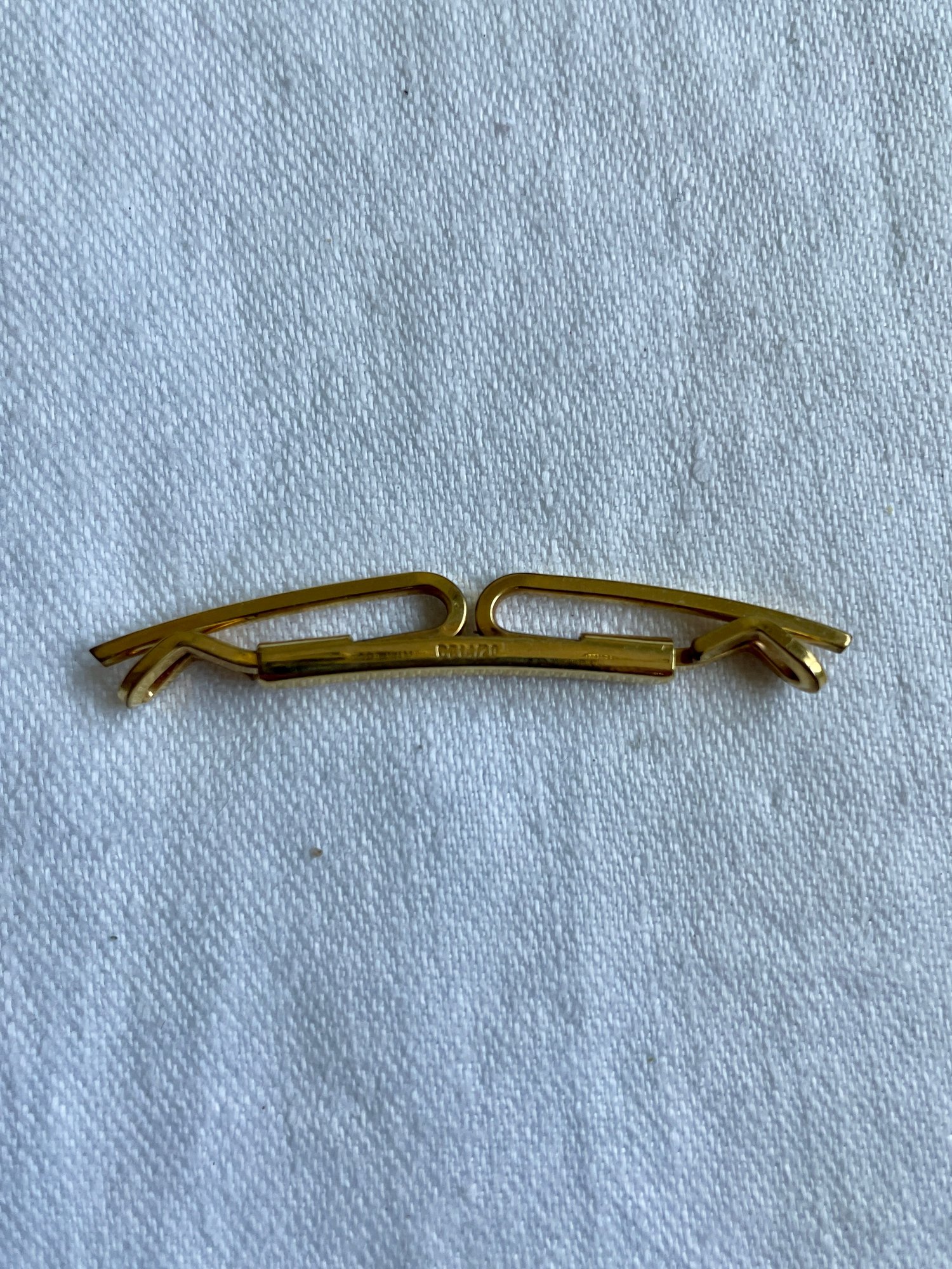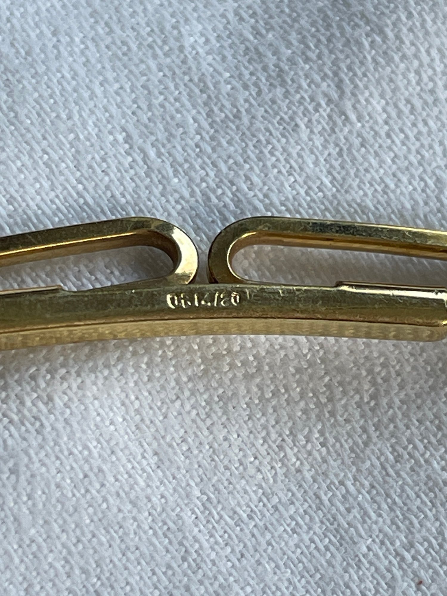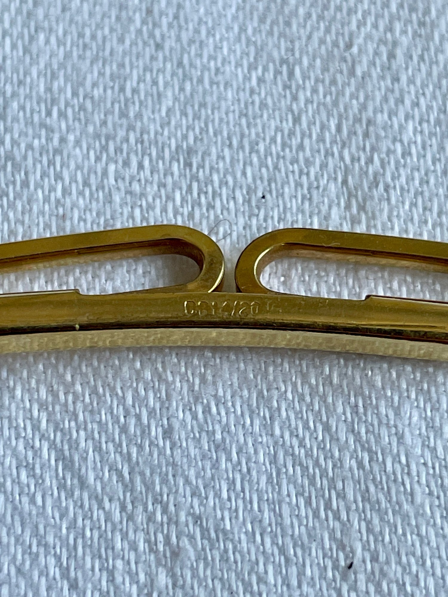 The hallmark "OB 14/20" on a gold collar stay signifies that the item is gold-filled, containing a layer of 14-karat gold bonded to a base metal.