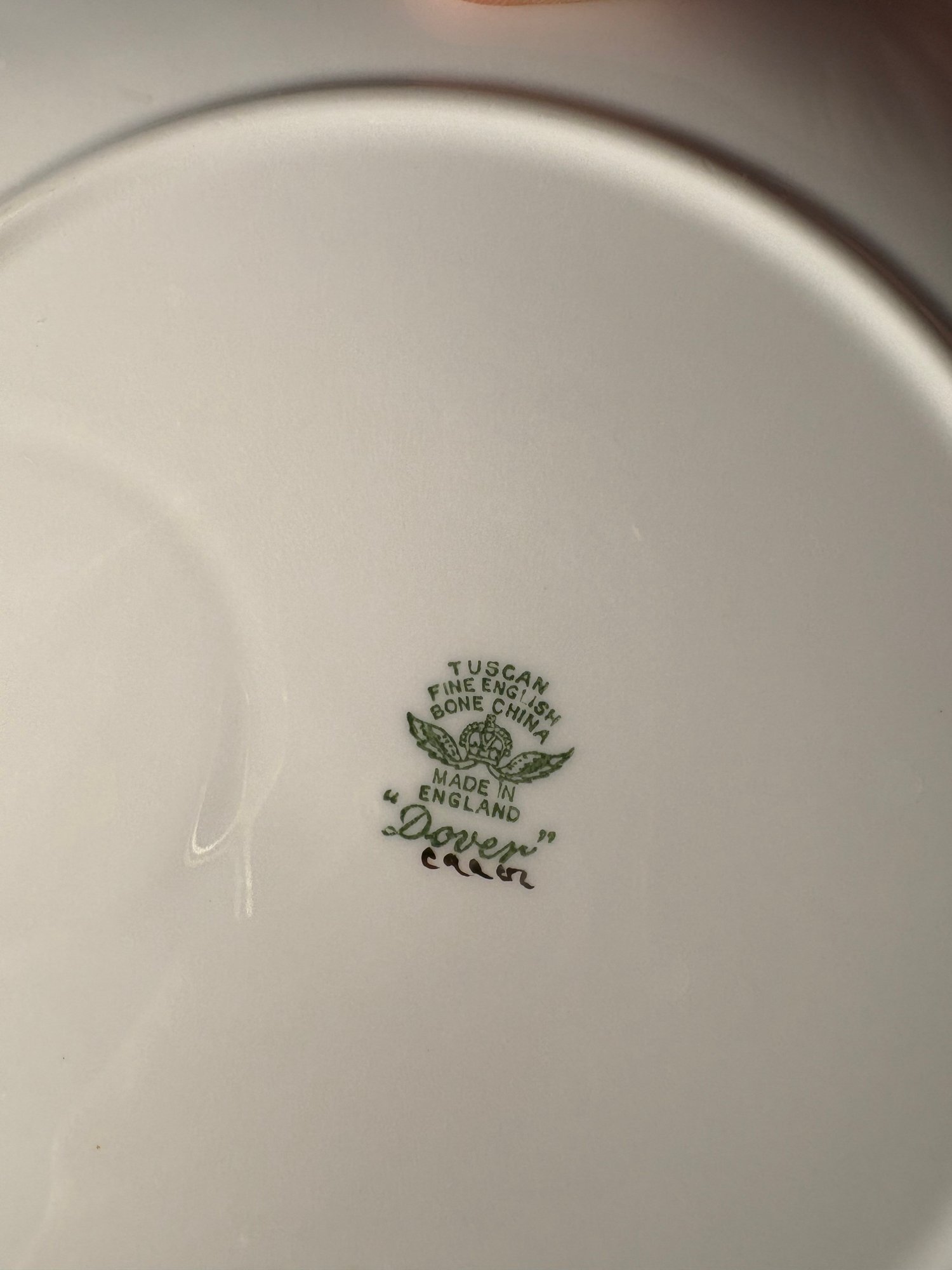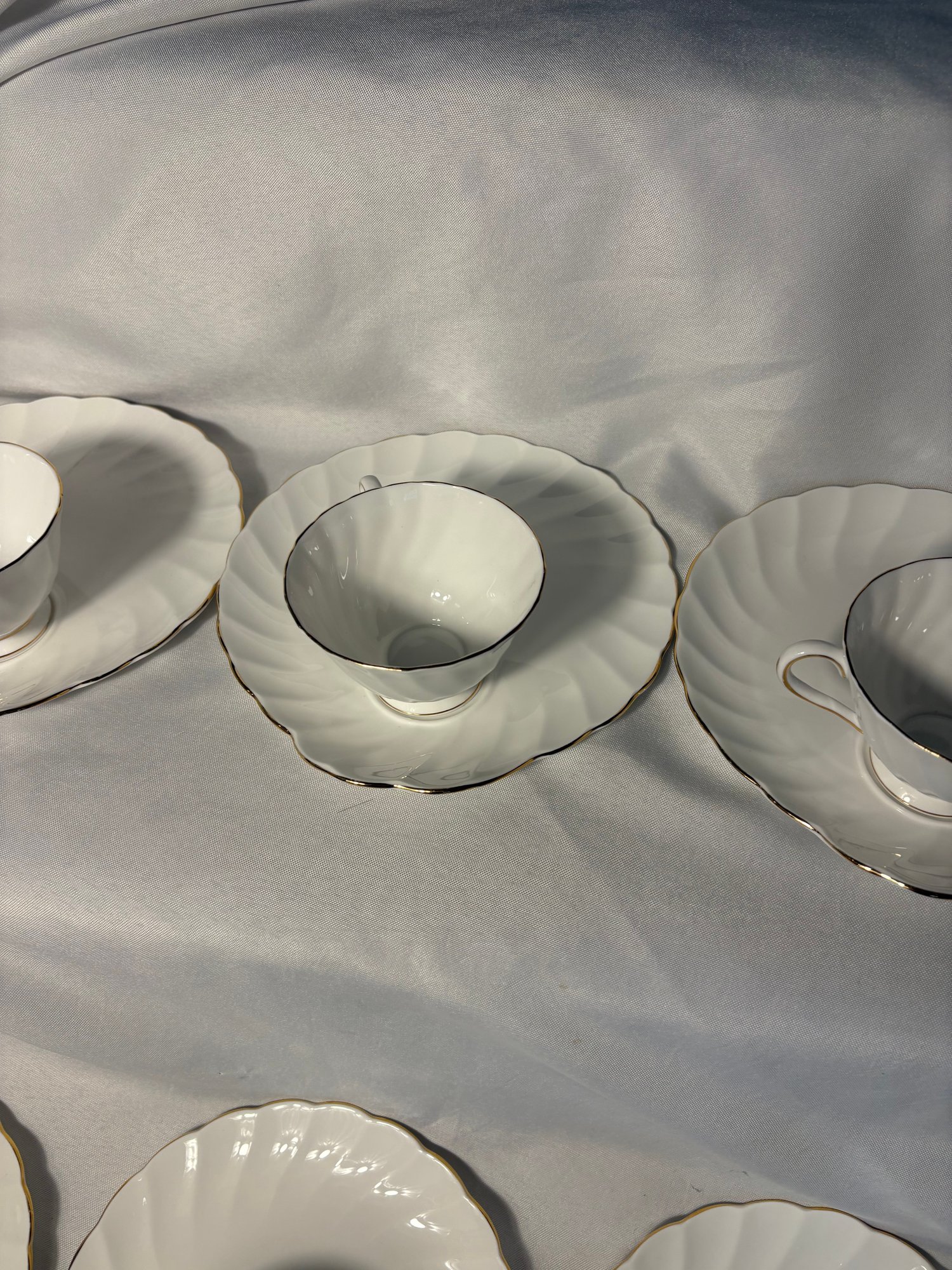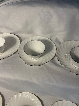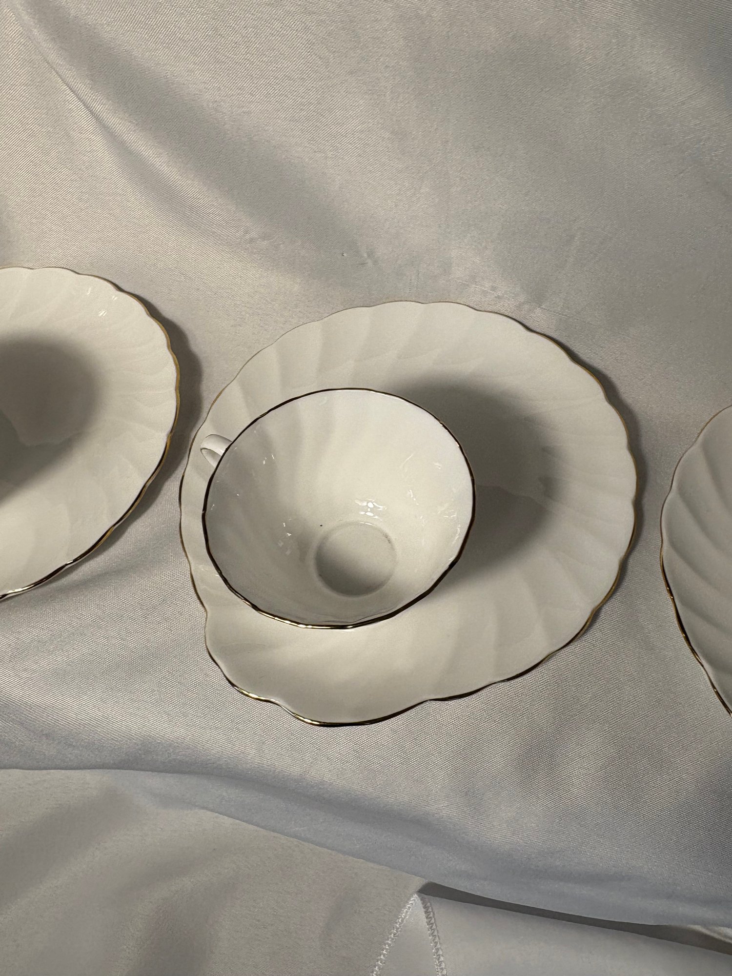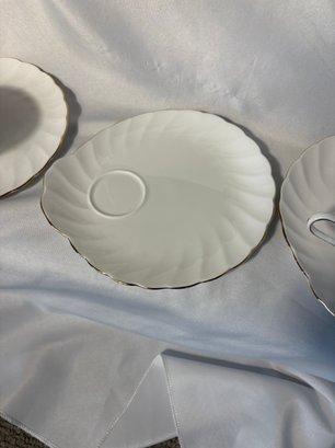 Dimensions approximately tea cups 3.75 inches in diameter. 2.75 inches tall. Saucers approximately 7.5 inches in diameter