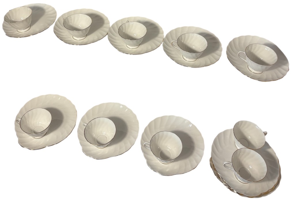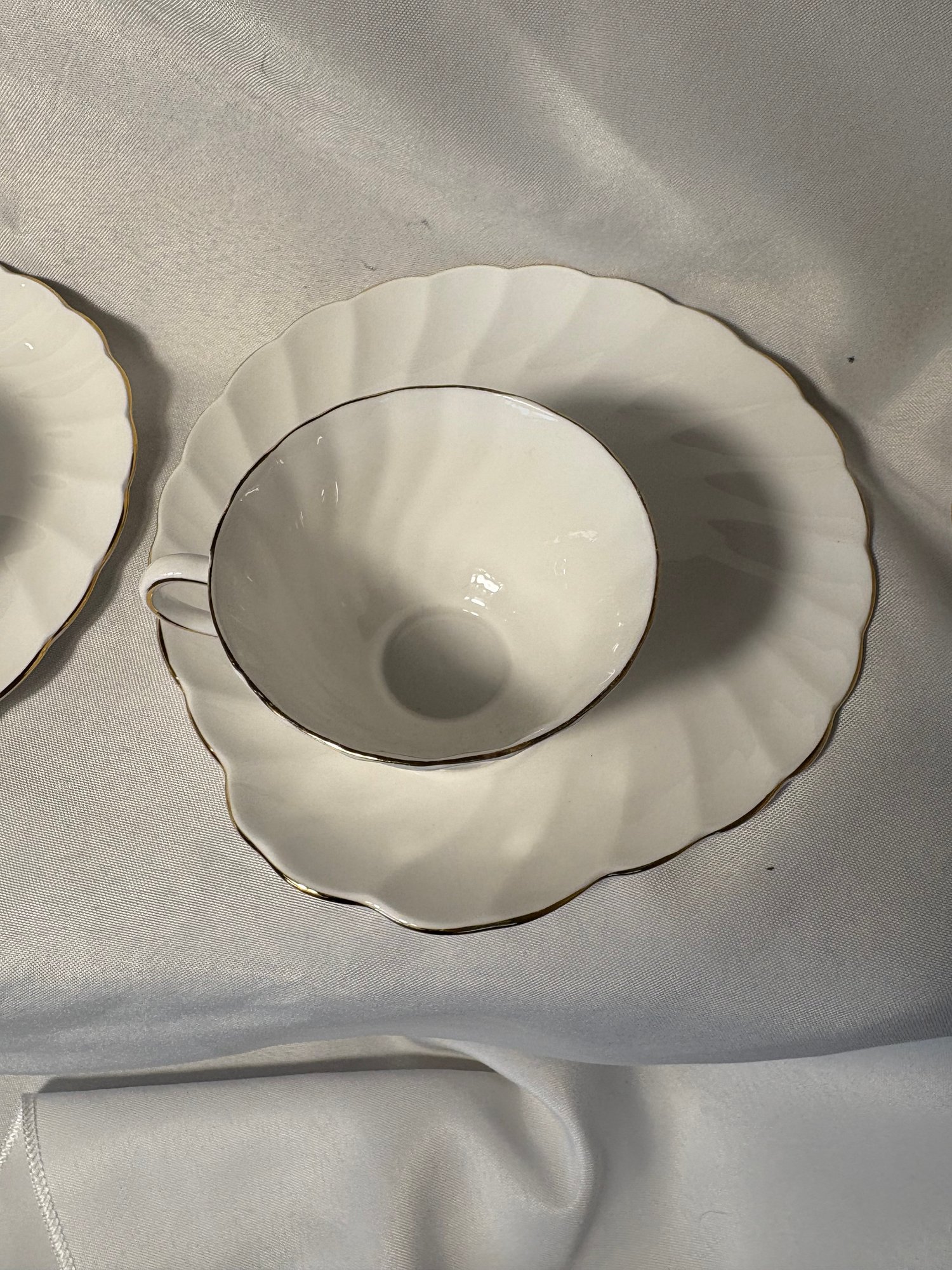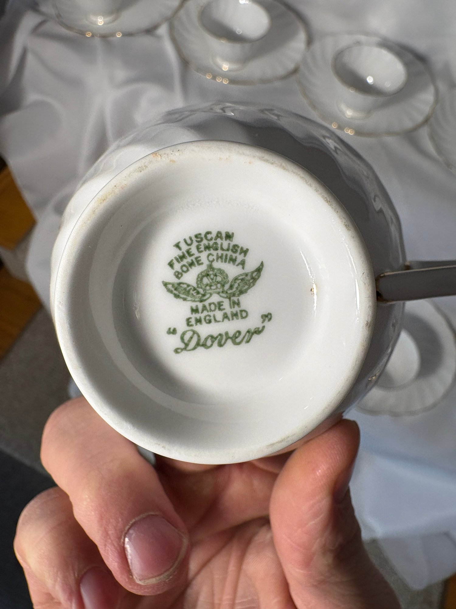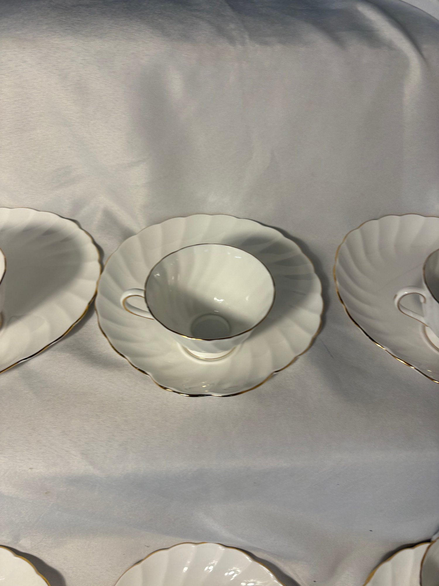 Dimensions approximately tea cups 3.75 inches in diameter. 2.75 inches tall. Saucers approximately 7.5 inches in diameter