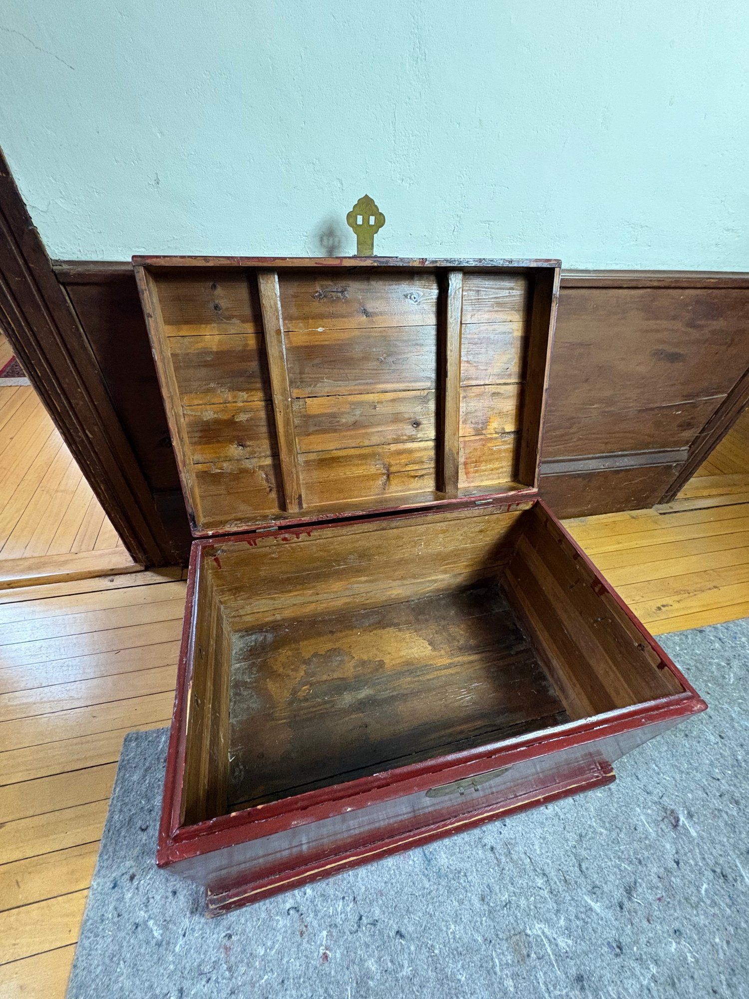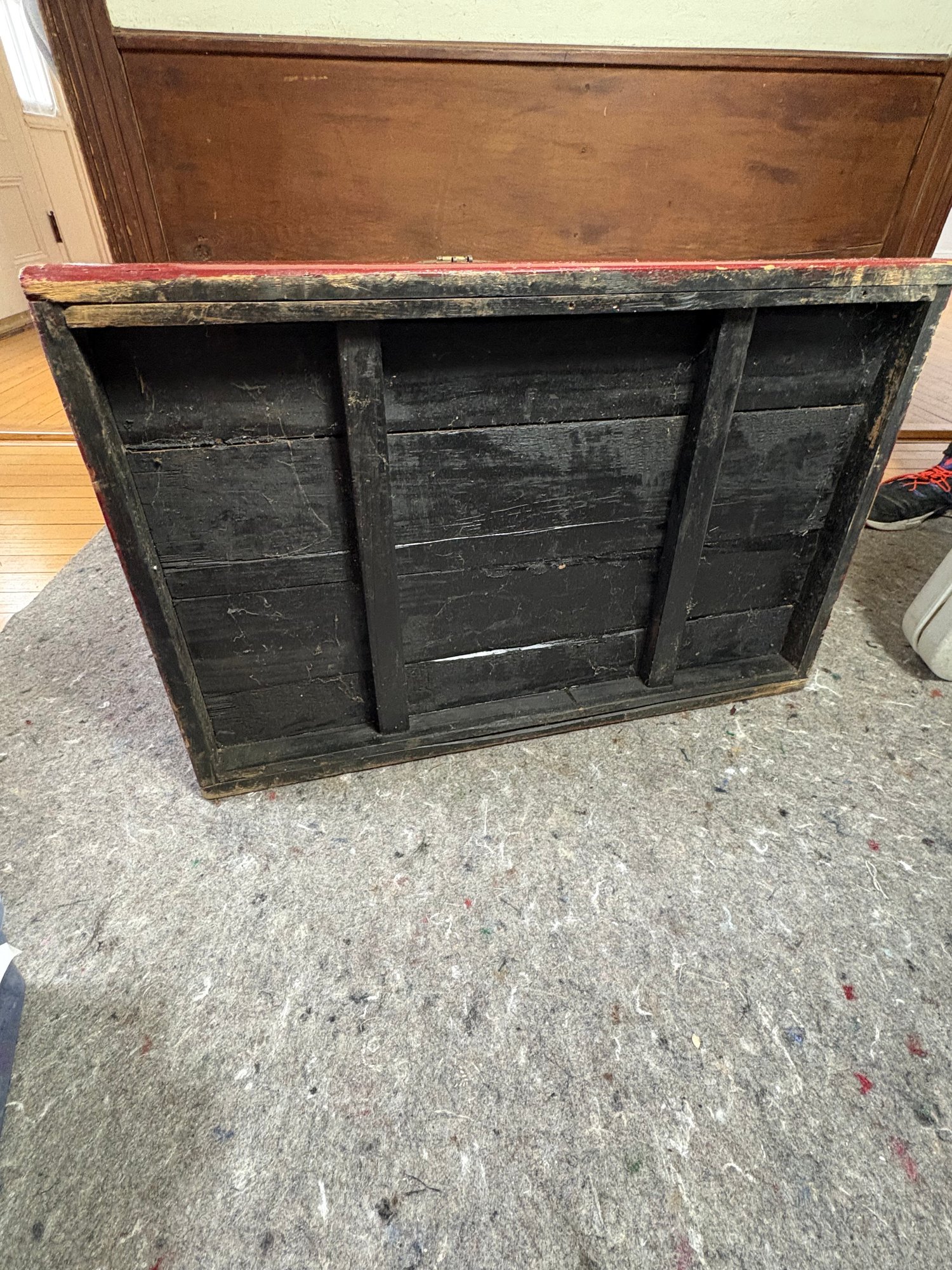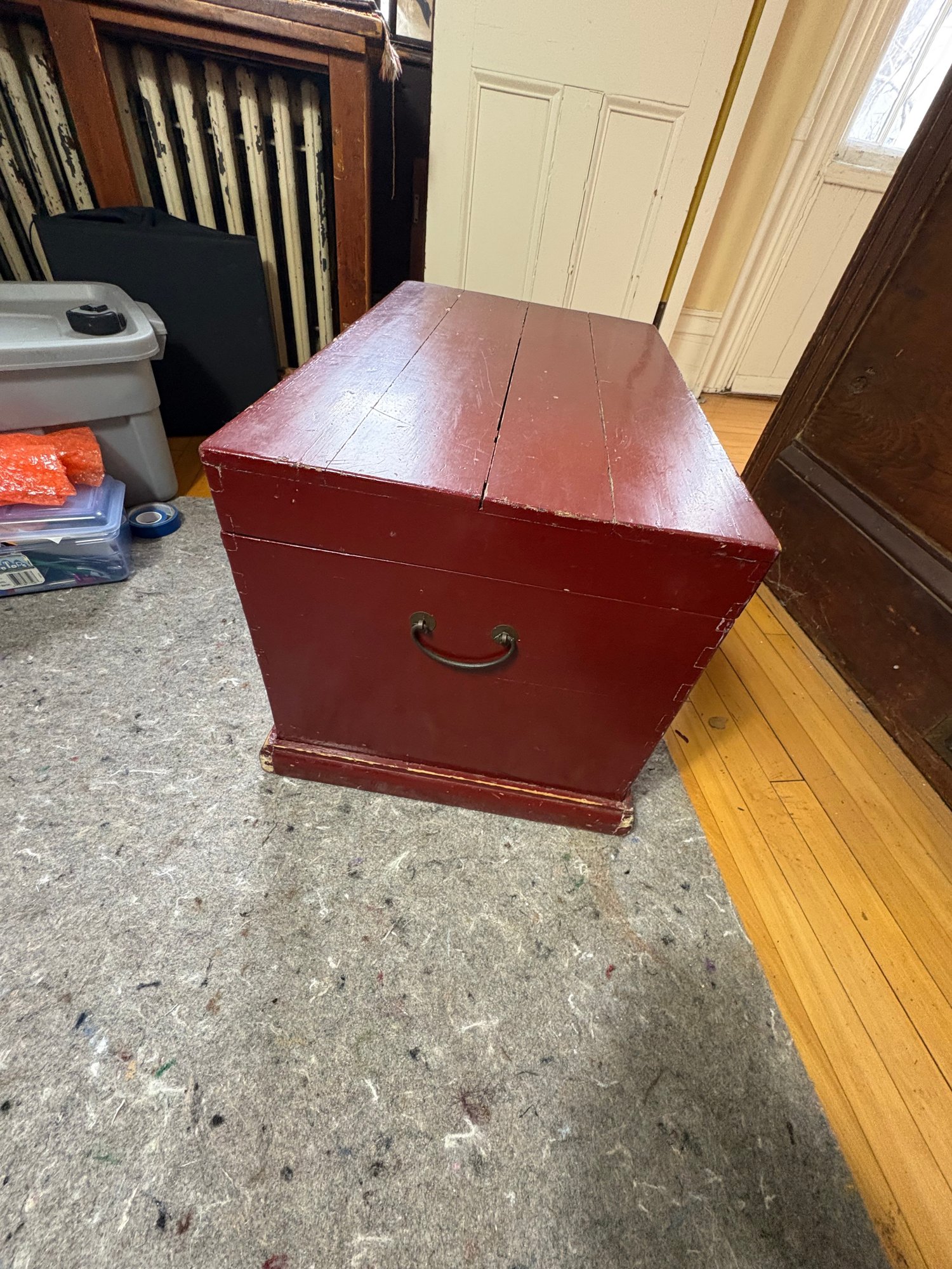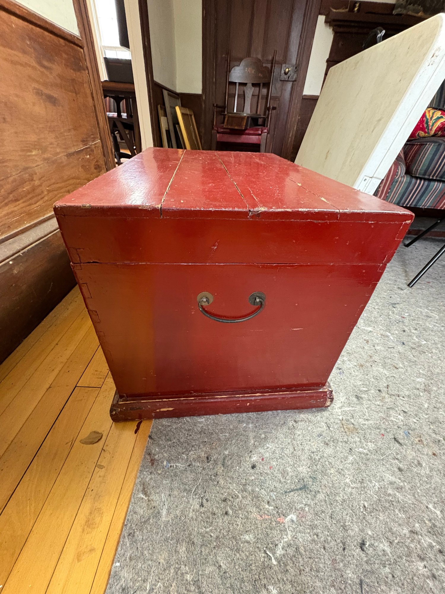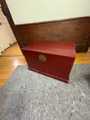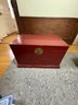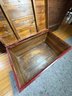 Approximately 27”x17”, 17” tall. Some wear and scratches. Hinges loose and slightly coming off
