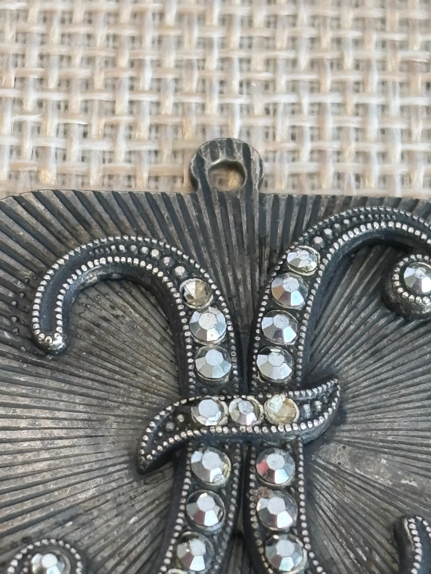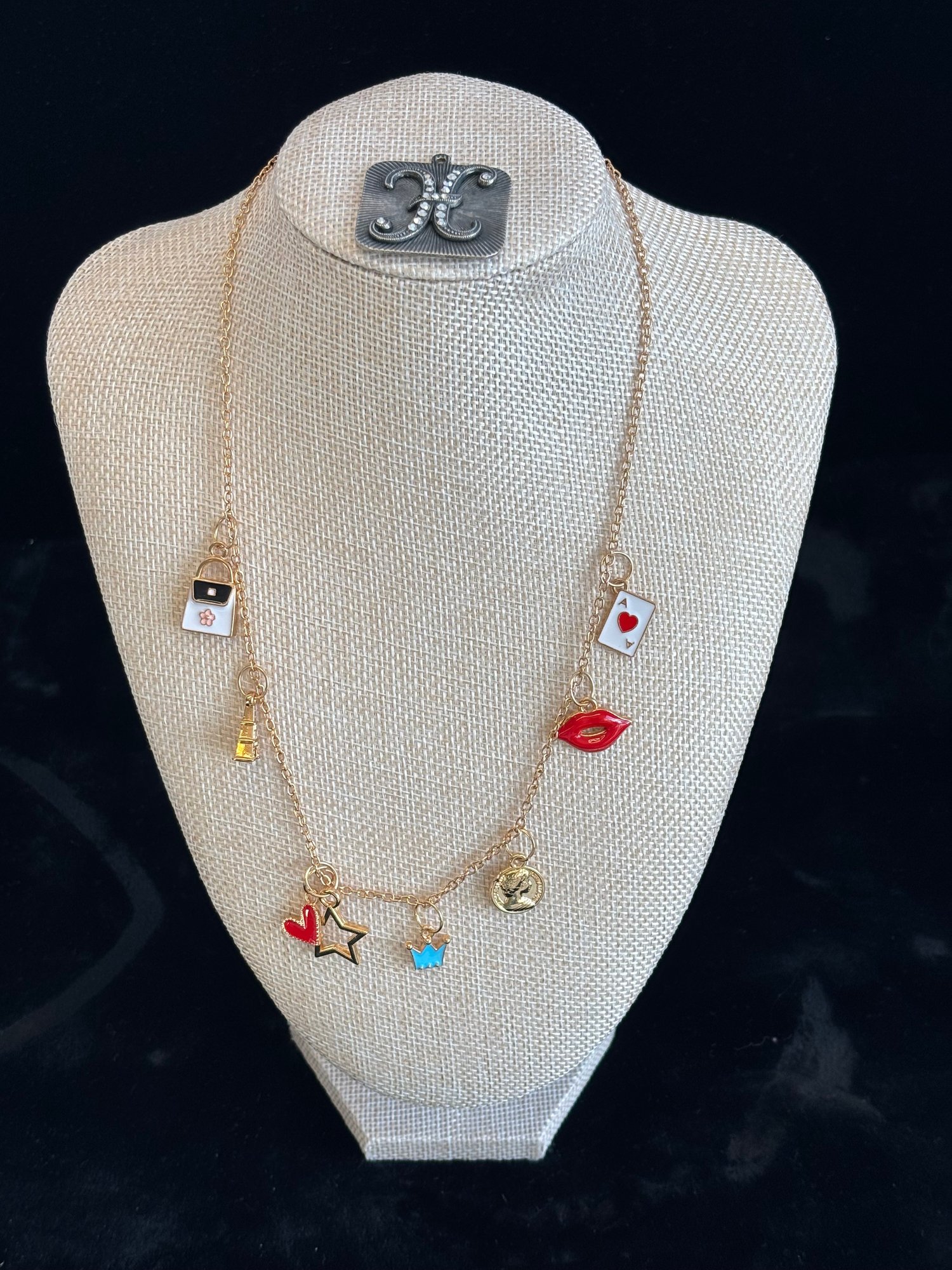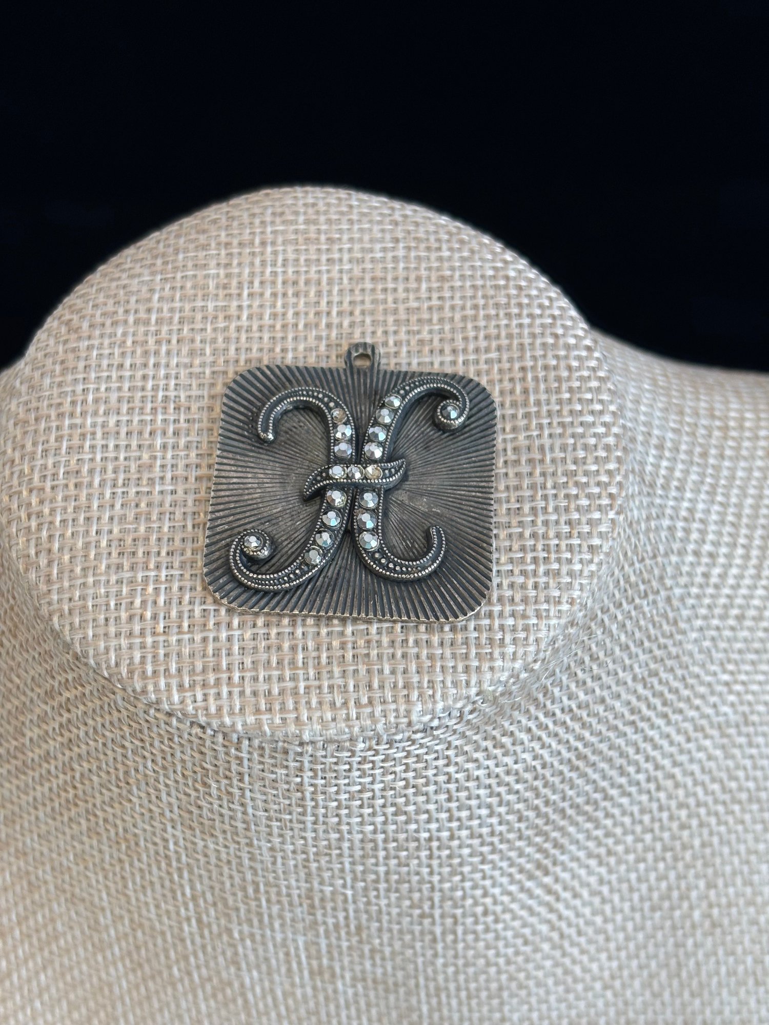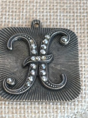 There are a couple of rhinestones missing from 'H' charm-shown; 1 3/16" square