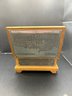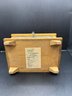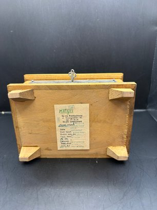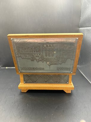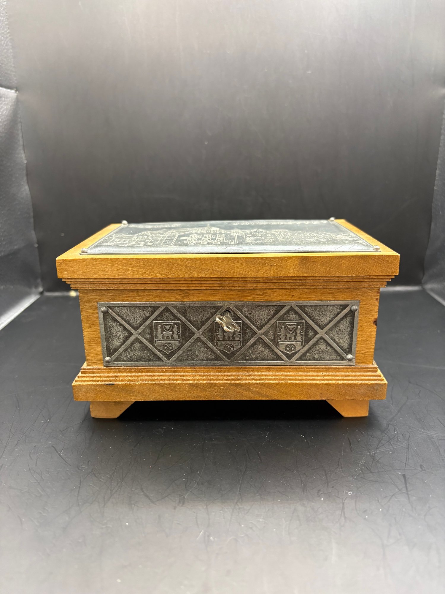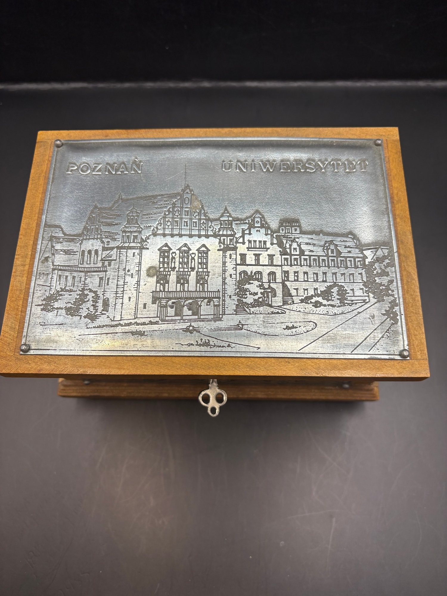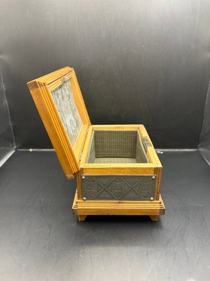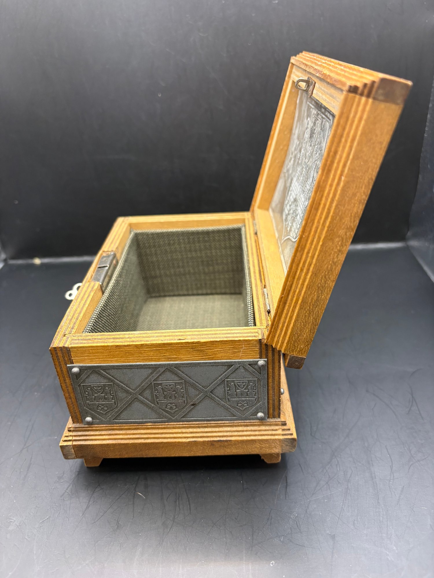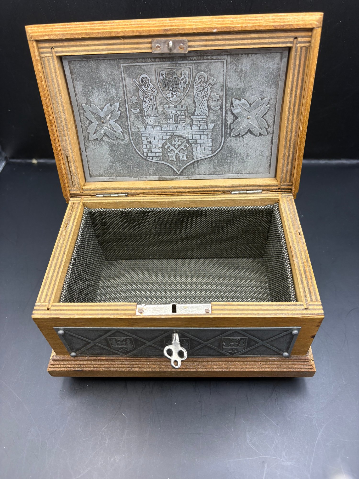 Vintage Poland wooden trinket box, with metal plating, engraved etched inside his lined with a hinge and a key that works to lock it. 7by 5 by 4